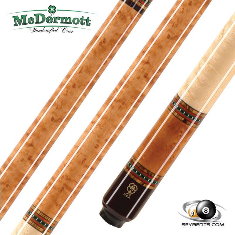 This is a gorgeous Light American Cherry Stained Pool Cue. The fine grains of the wood are beautifully exposed. The forearm is very well complimented with the Bocote, cocobolo, green & index ring on sleeve. This model has no wrap.
