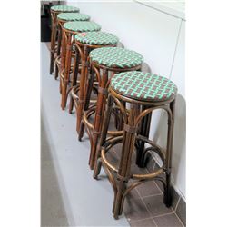 Qty 6 Round Wicker Bamboo Bar Stools w/ Green Upholstery Tops, 30" H