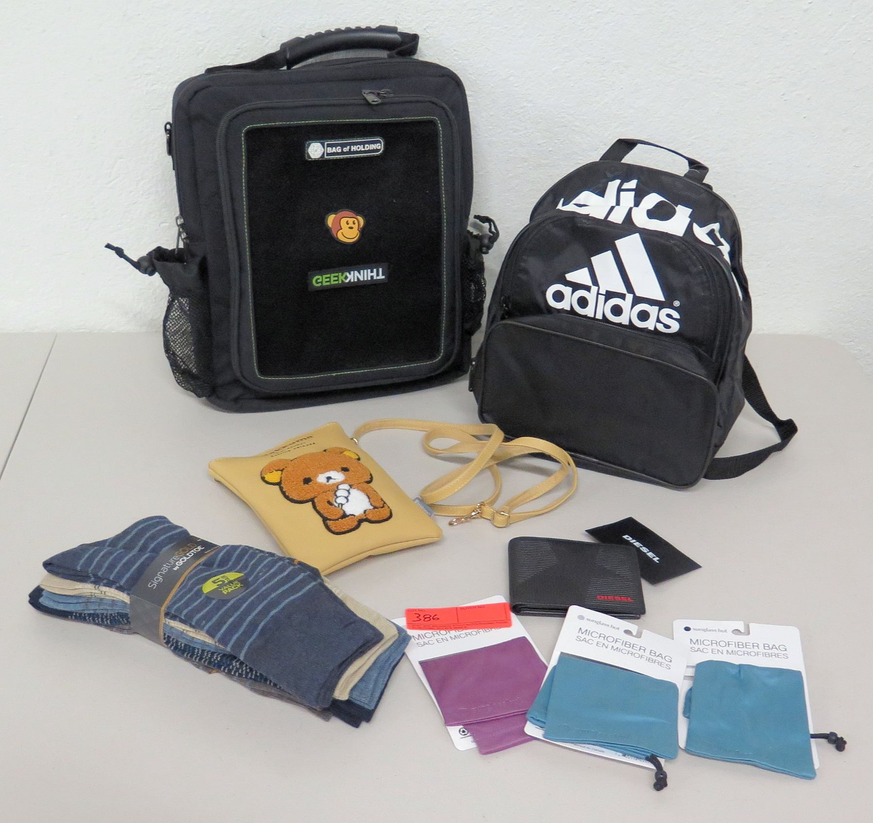 GeekThink Backpack, Adidas Backpack, Diesel Wallet, Socks, Microfiber Eyeglass Bags