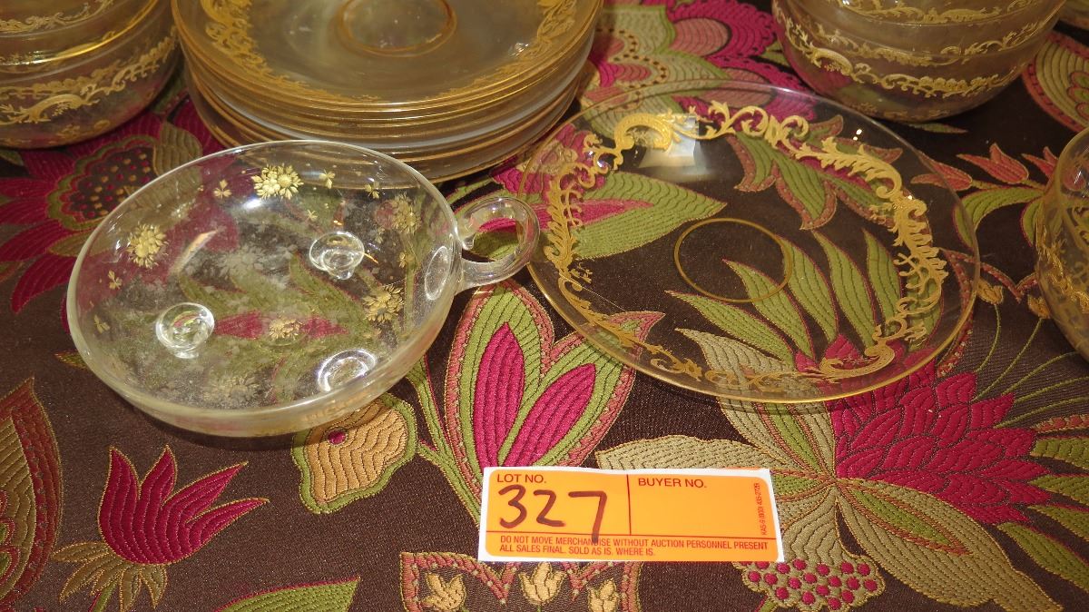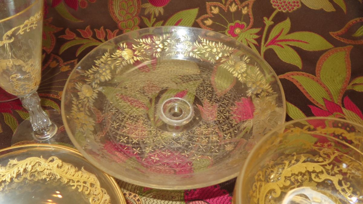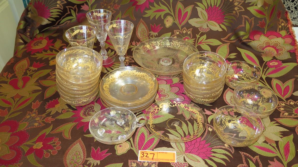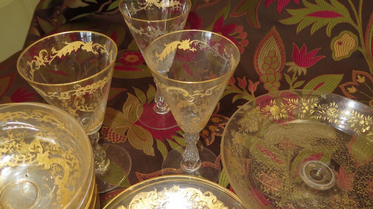Glass Bowls, Plates, Stemware, Platter, Bowls w/Gilt Overlay