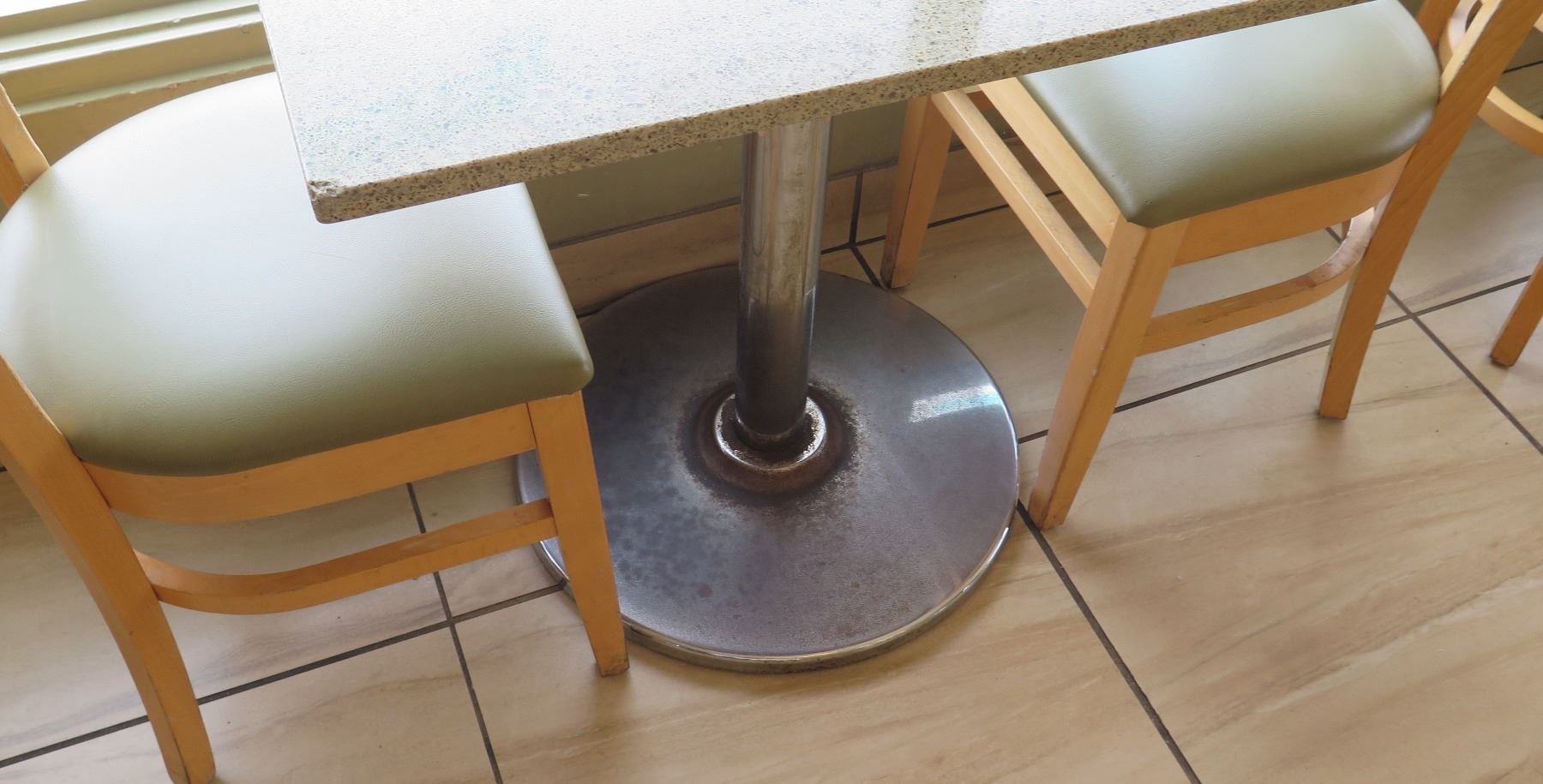 The first photo is a stock photo to convey the true color of the table. The rest of the pictures are of the “actual” table and chairs in this lot. Please look at these pictures closely to see the variations in wear and tear. Some tables may have chipping along the edges of the table. Or better yet, come down and take a look at these in person if you plan on bidding on these.