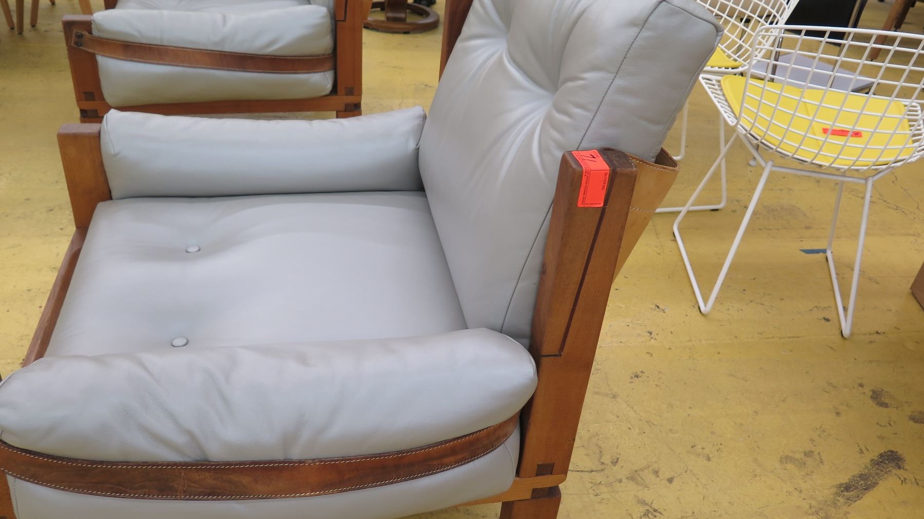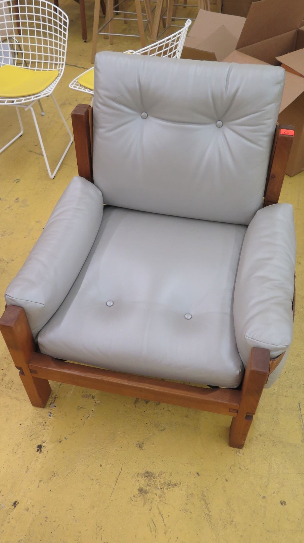Gray Leather Chair w/Wooden Frame, Leather Strap Accents, Approx. 32" W, 25.5" D. Surface of seat 15" from floor.
