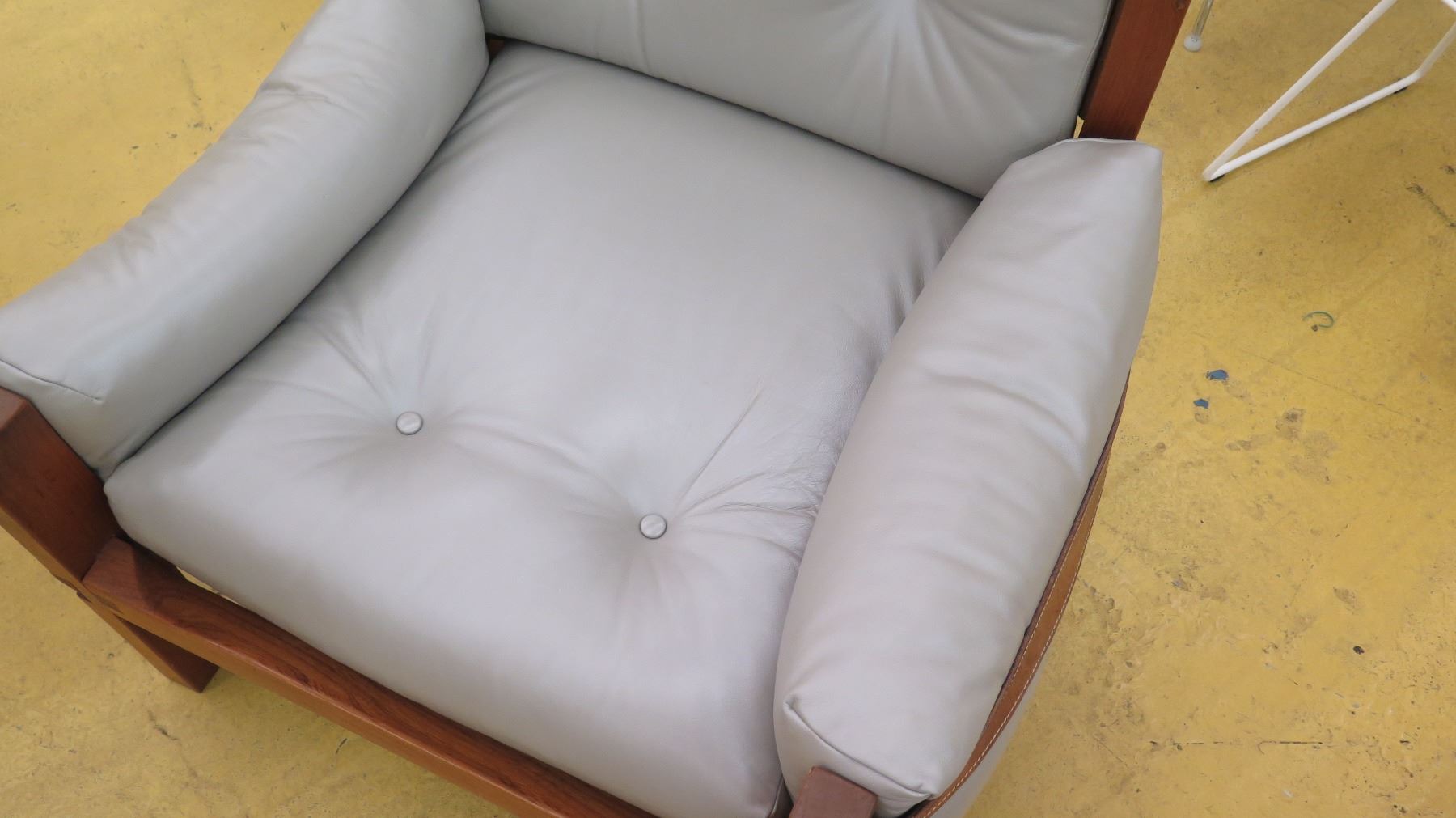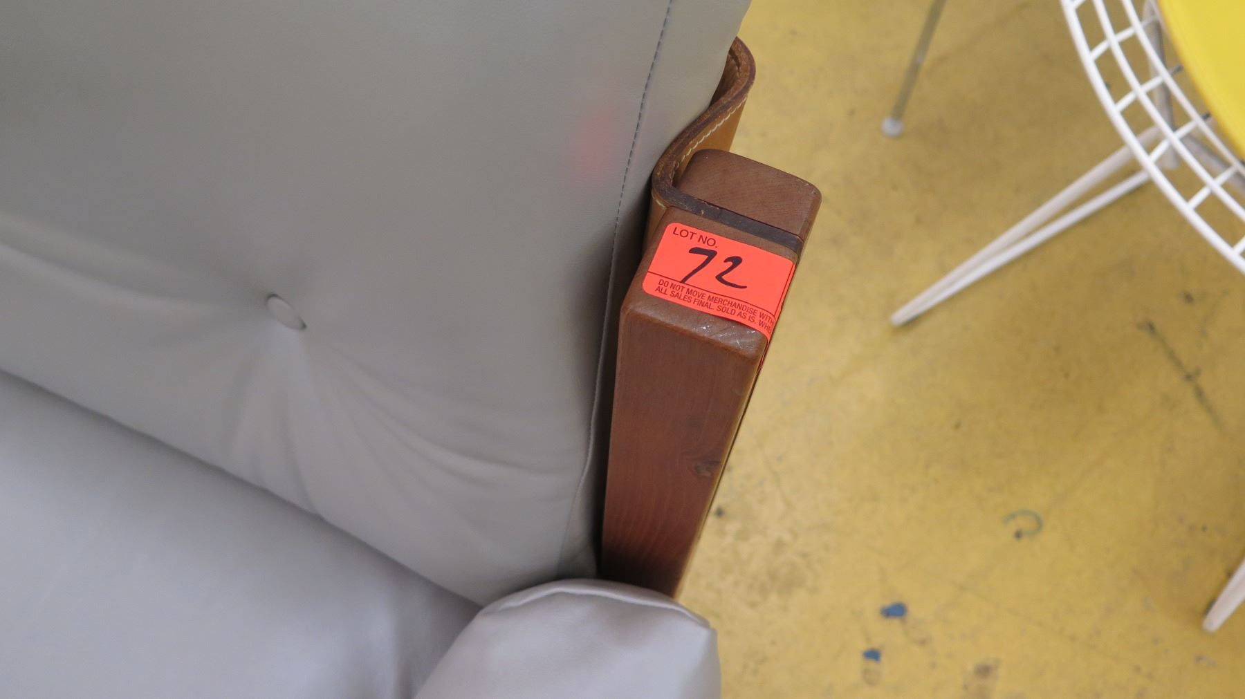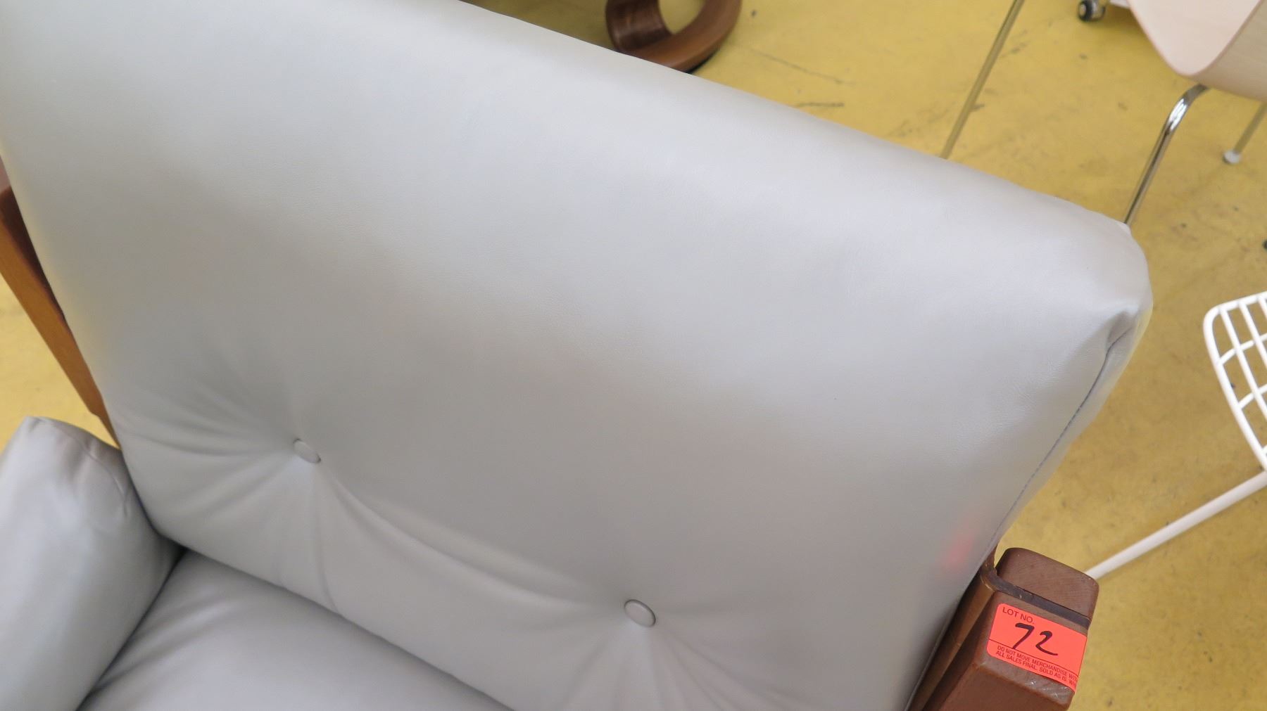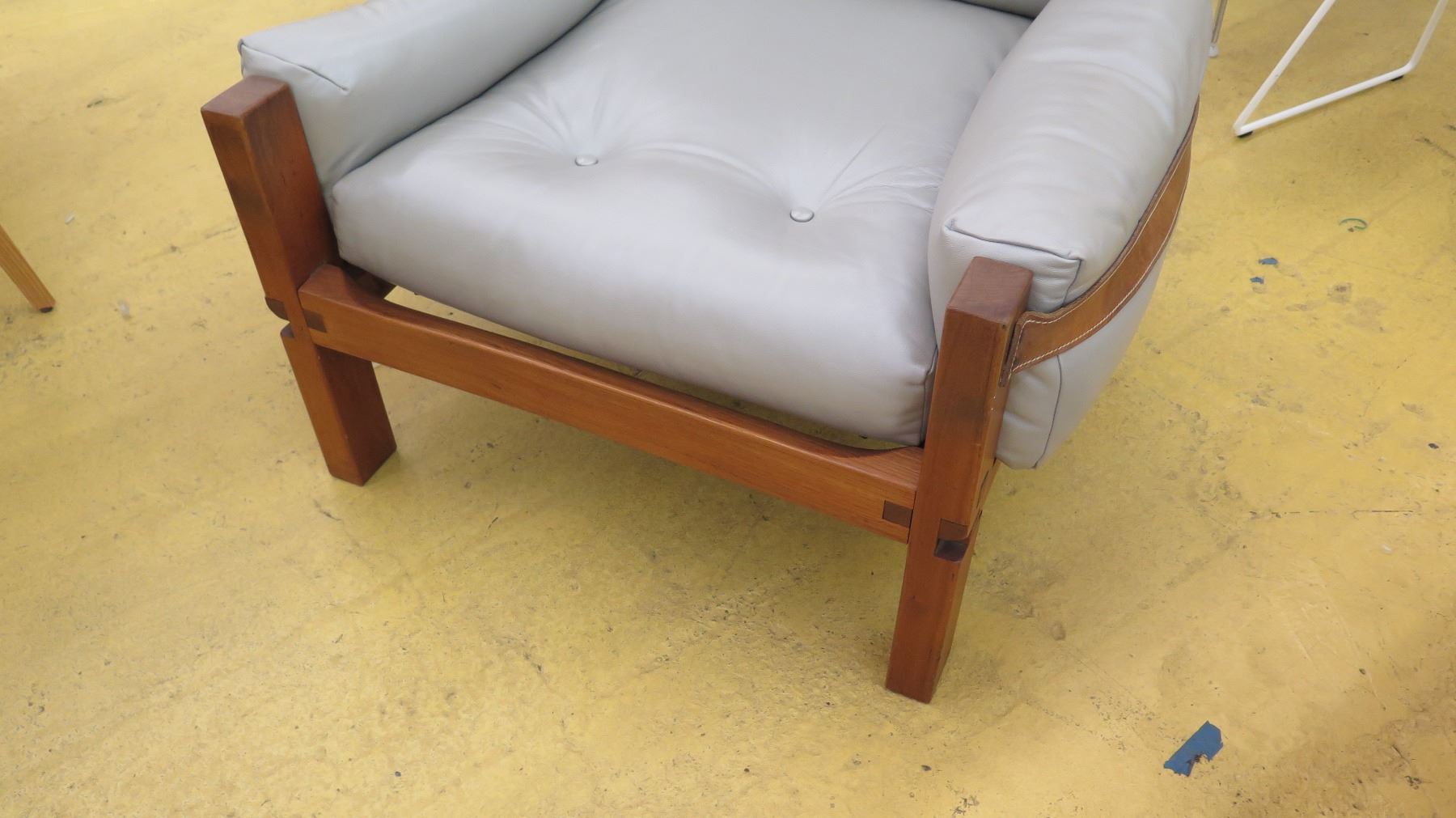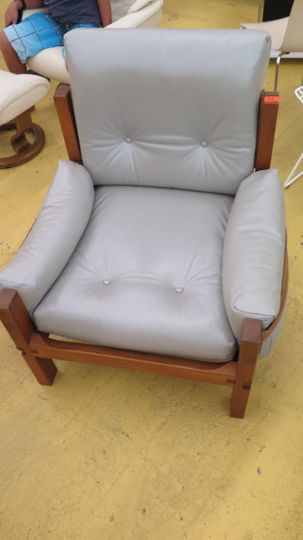 Gray Leather Chair w/Wooden Frame, Leather Strap Accents, Approx. 32" W, 25.5" D. Surface of seat 15" from floor.