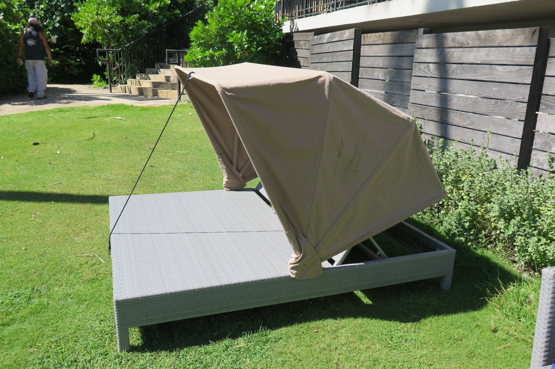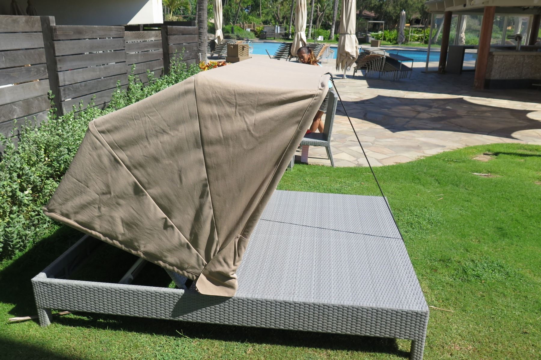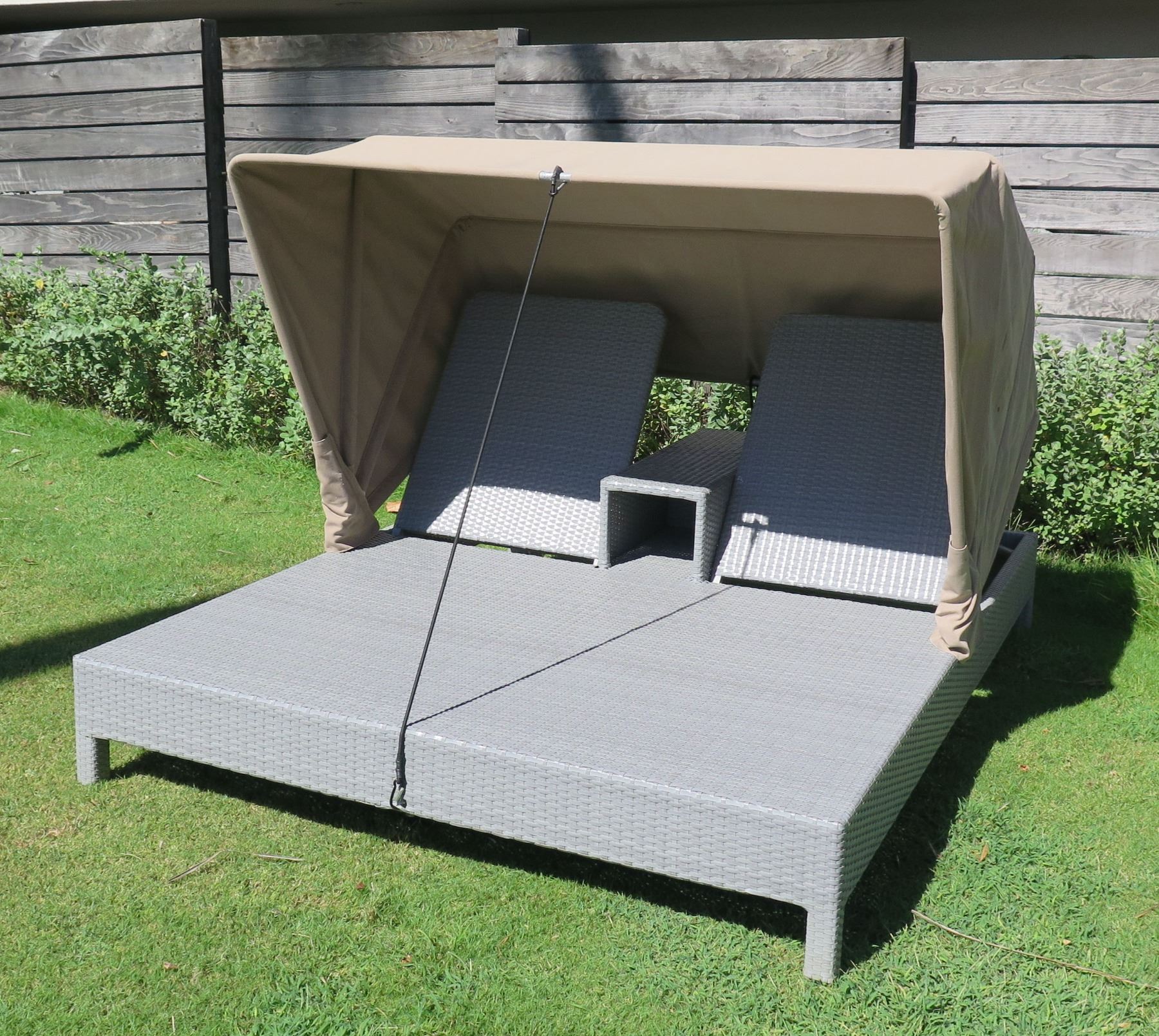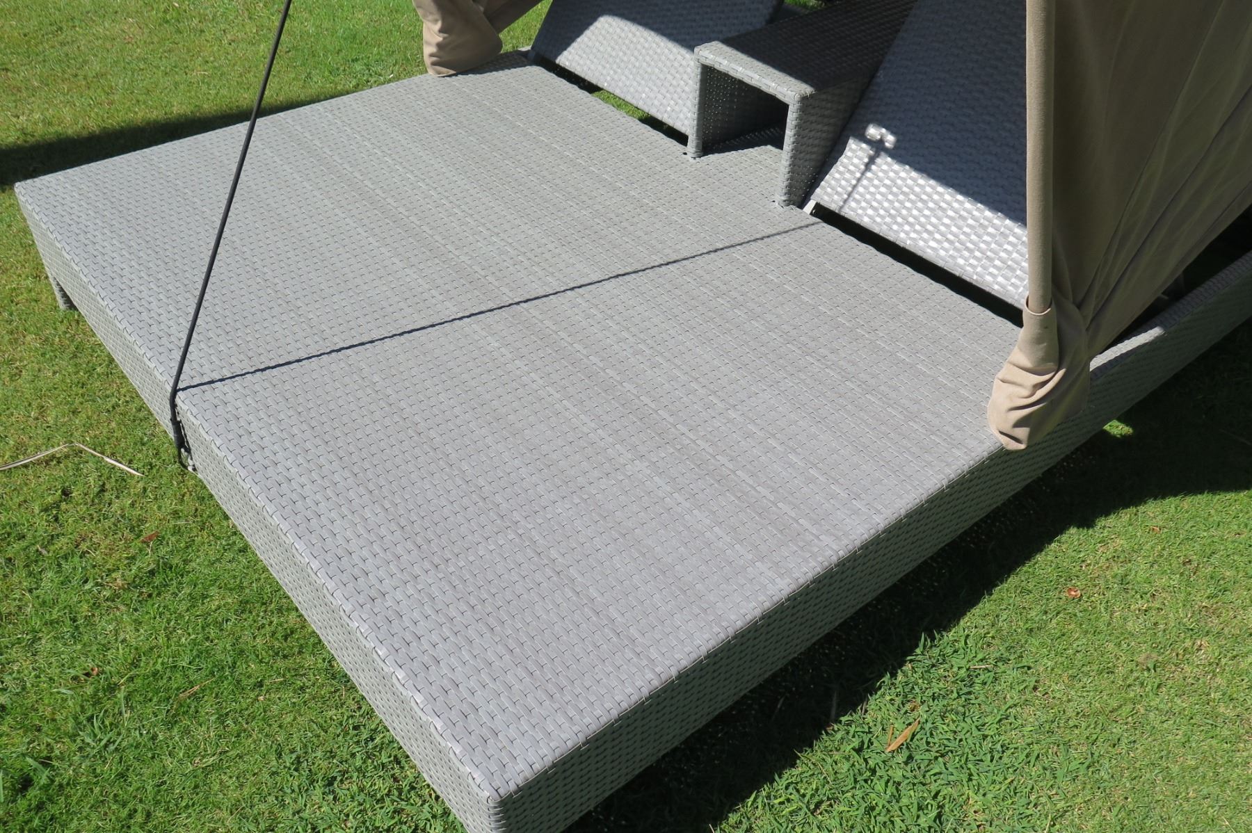 Gray Poolside Lounger for Two w/ Canopy 69" x 84" x 55"H Woven Synthetic Material. Photo shown is a stock photo. Expect to find minor differences in wear and tear consistent with exposure to the elements in an oceanfront resort environment.