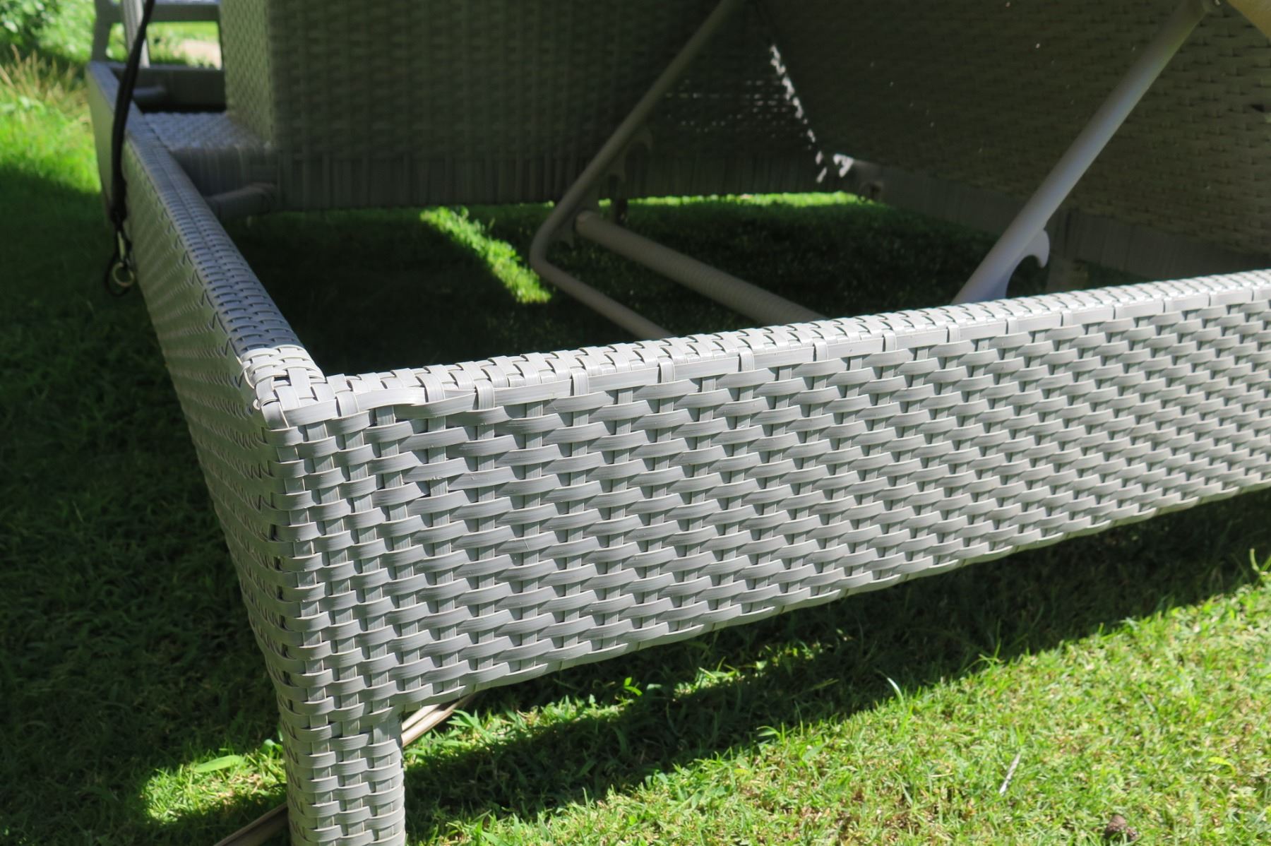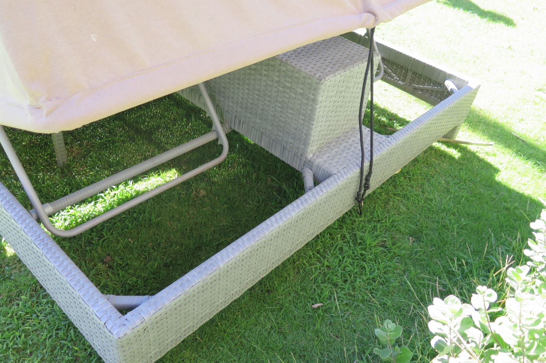 Gray Poolside Lounger for Two w/ Canopy 69" x 84" x 55"H Woven Synthetic Material. Photo shown is a stock photo. Expect to find minor differences in wear and tear consistent with exposure to the elements in an oceanfront resort environment.