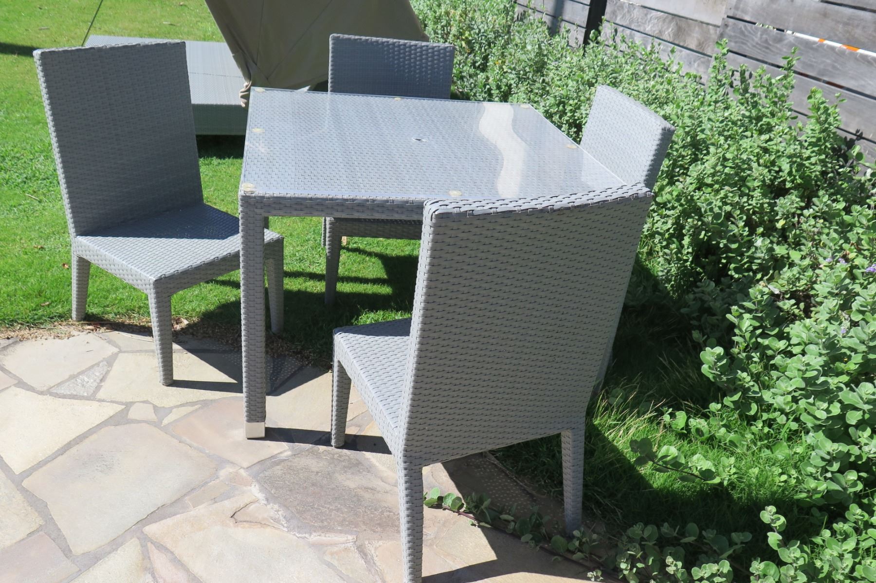 Gray Table w/ Removable Plexiglass Top (41.5"x41.5"x30") & 4 Chairs, Woven Synthetic Material. Photos shown are stock photos. Expect to find minor differences in wear and tear consistent with exposure to the elements in an oceanfront resort environment.