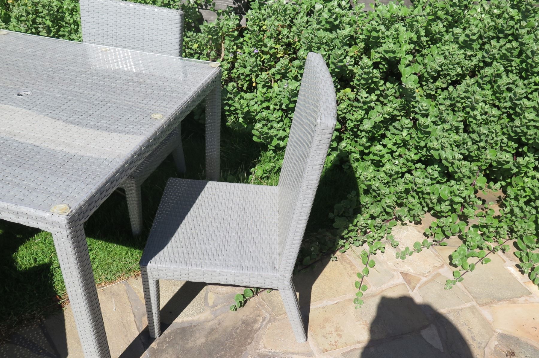 Gray Table w/ Removable Plexiglass Top (41.5"x41.5"x30") & 4 Chairs, Woven Synthetic Material. Photos shown are stock photos. Expect to find minor differences in wear and tear consistent with exposure to the elements in an oceanfront resort environment.