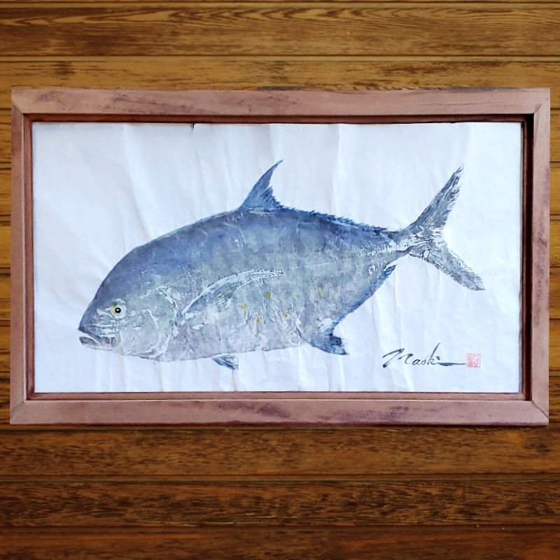 (1) Gyotaku fish painting by Naoki in custom 17.25"x32.5" in custom Koa wood frame.
