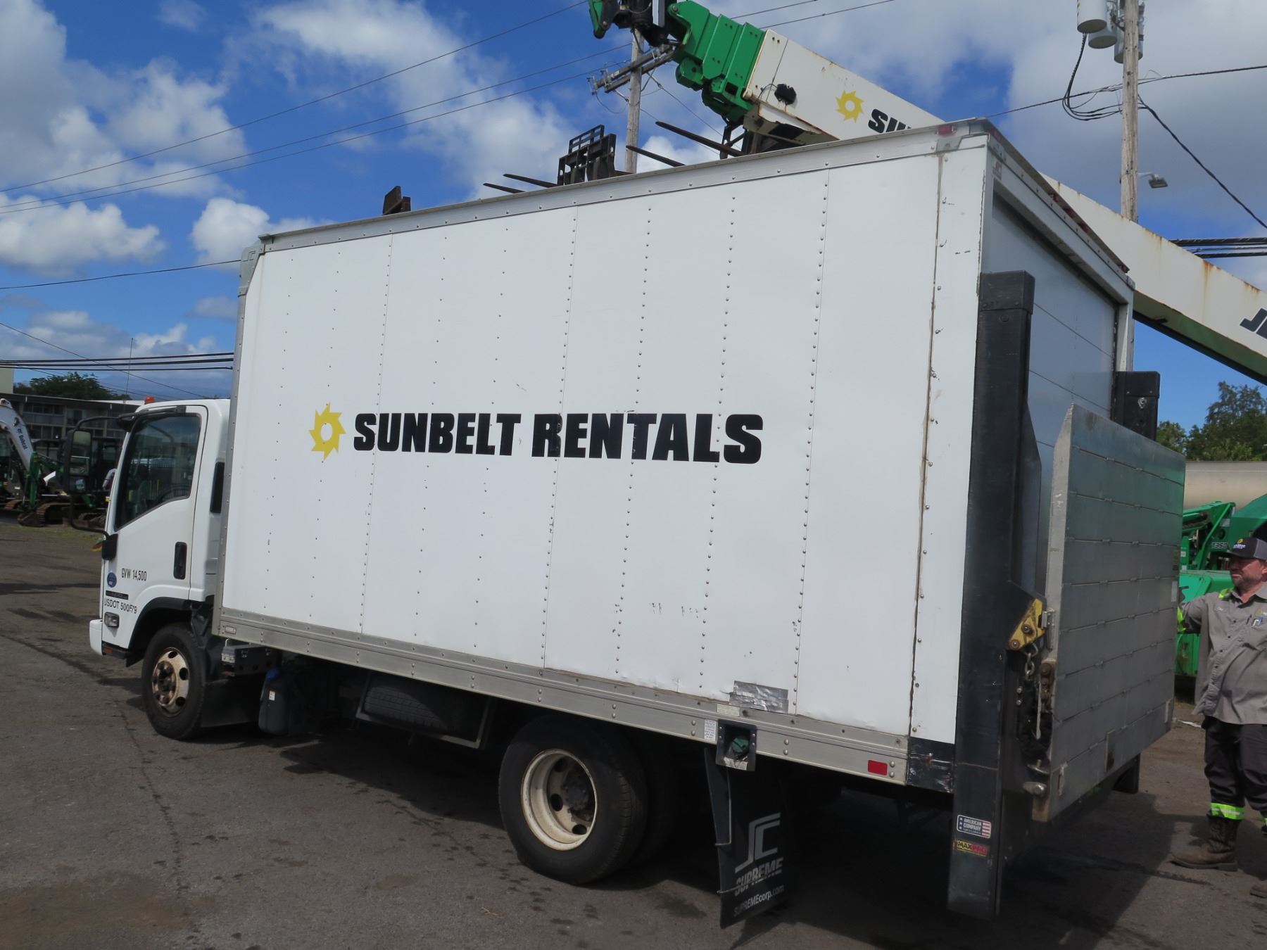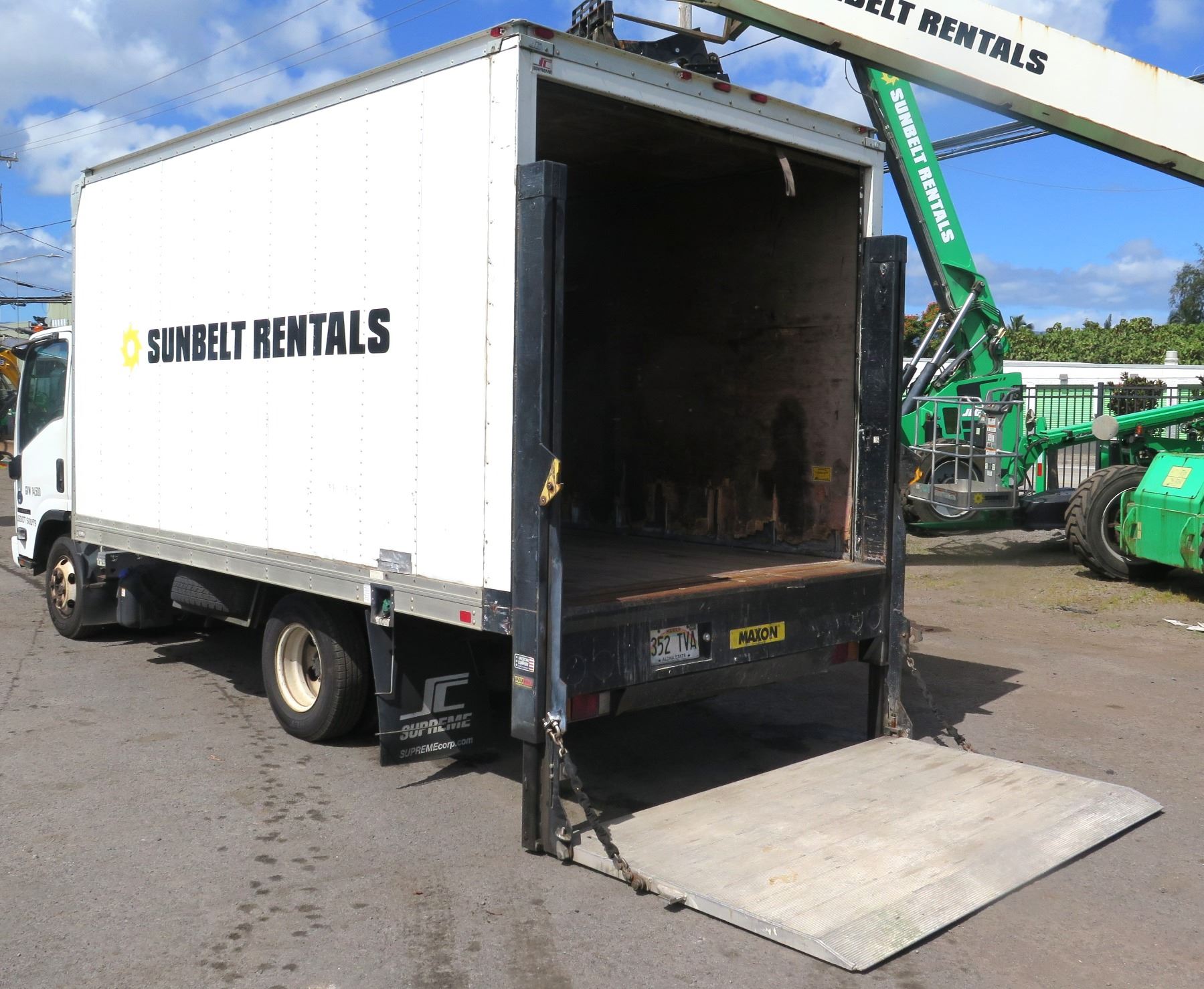 Check engine light is on. VIN: JALC4W168E7005046. 2014 Isuzu Box Truck, 14-Ft Long w/ Liftgate, 144767 Miles, Lic. 352TVA (Starts & Runs - See Video)
