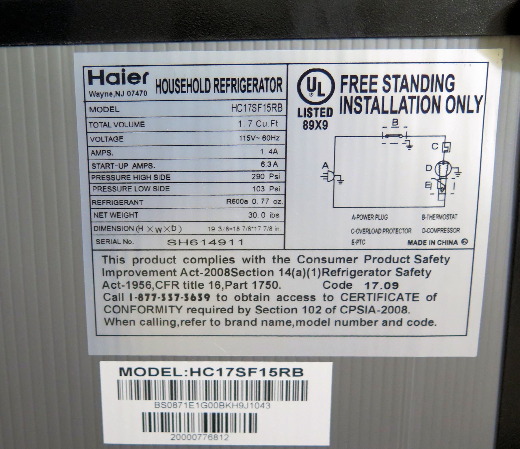 Haier Black Mini Refrigerator 1.7 Cu.Ft. Model HC17SF15RB
