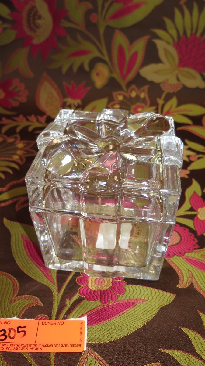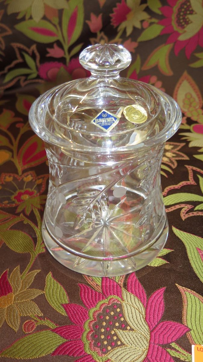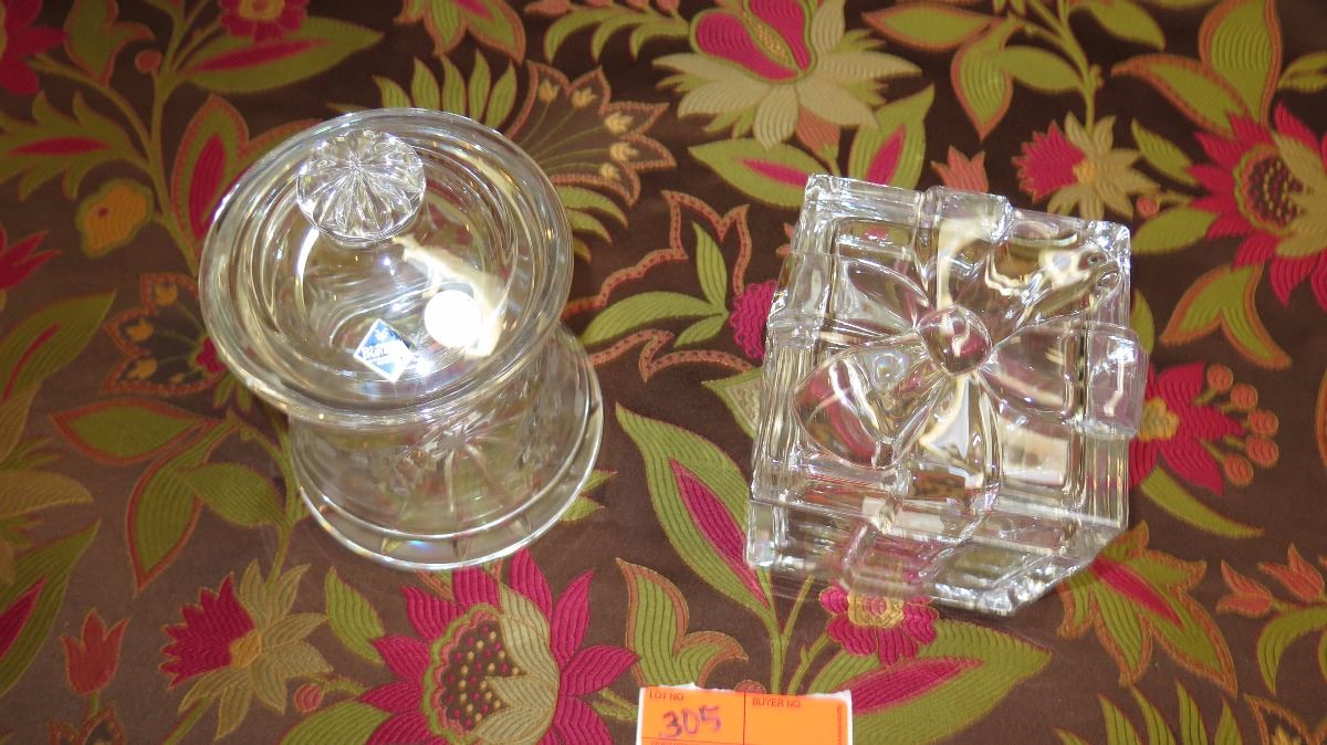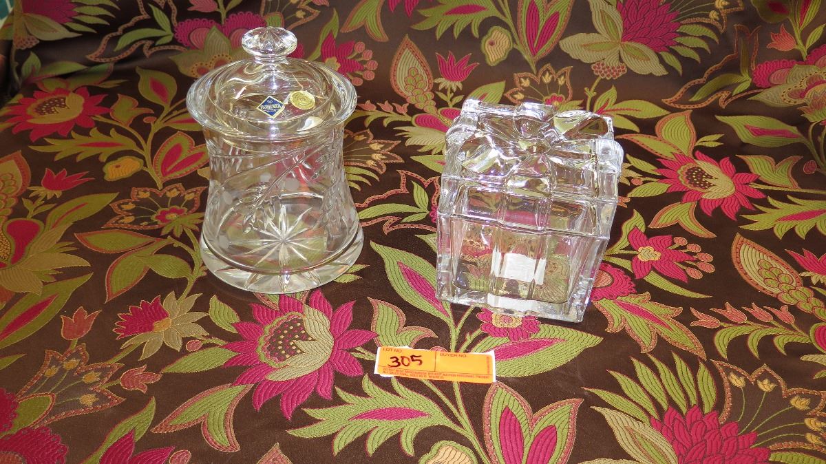 Hand Cut Crystal Jar w/Lid & "Present w/Bow" Lidded Jar - New Cond.
