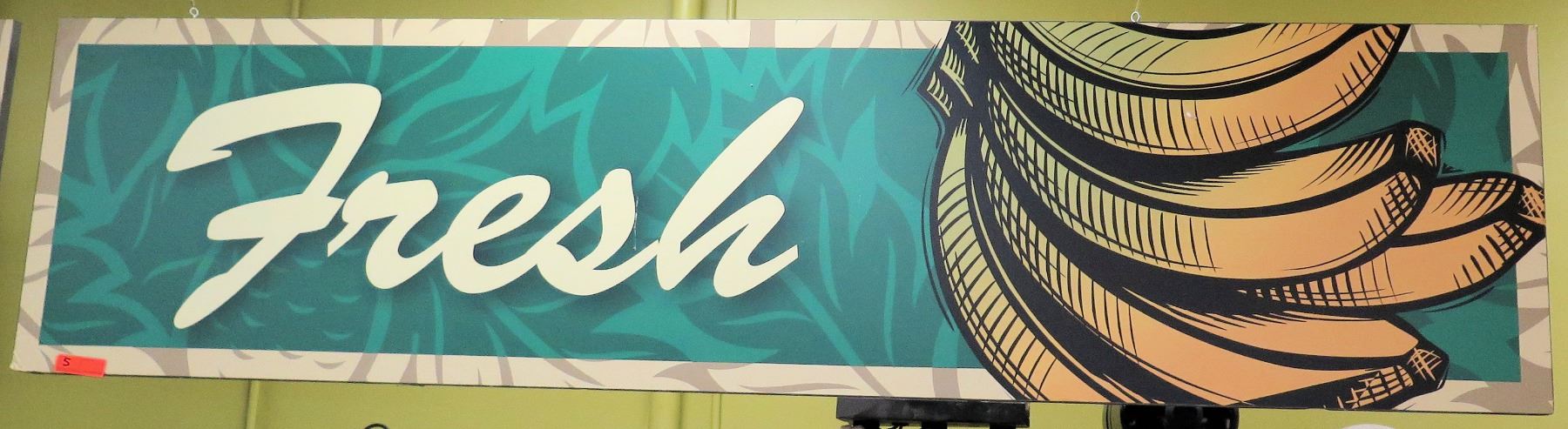 Hanging FRESH Sign with Banana Design. FOOD PRODUCTS AND MERCHANDISE IN THE PICTURES ARE NOT INCLUDED.