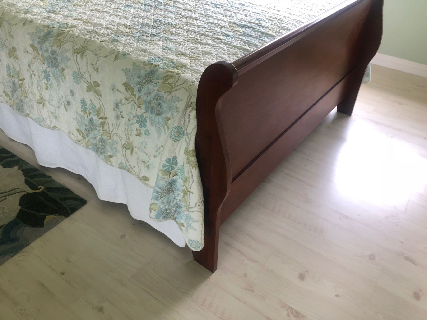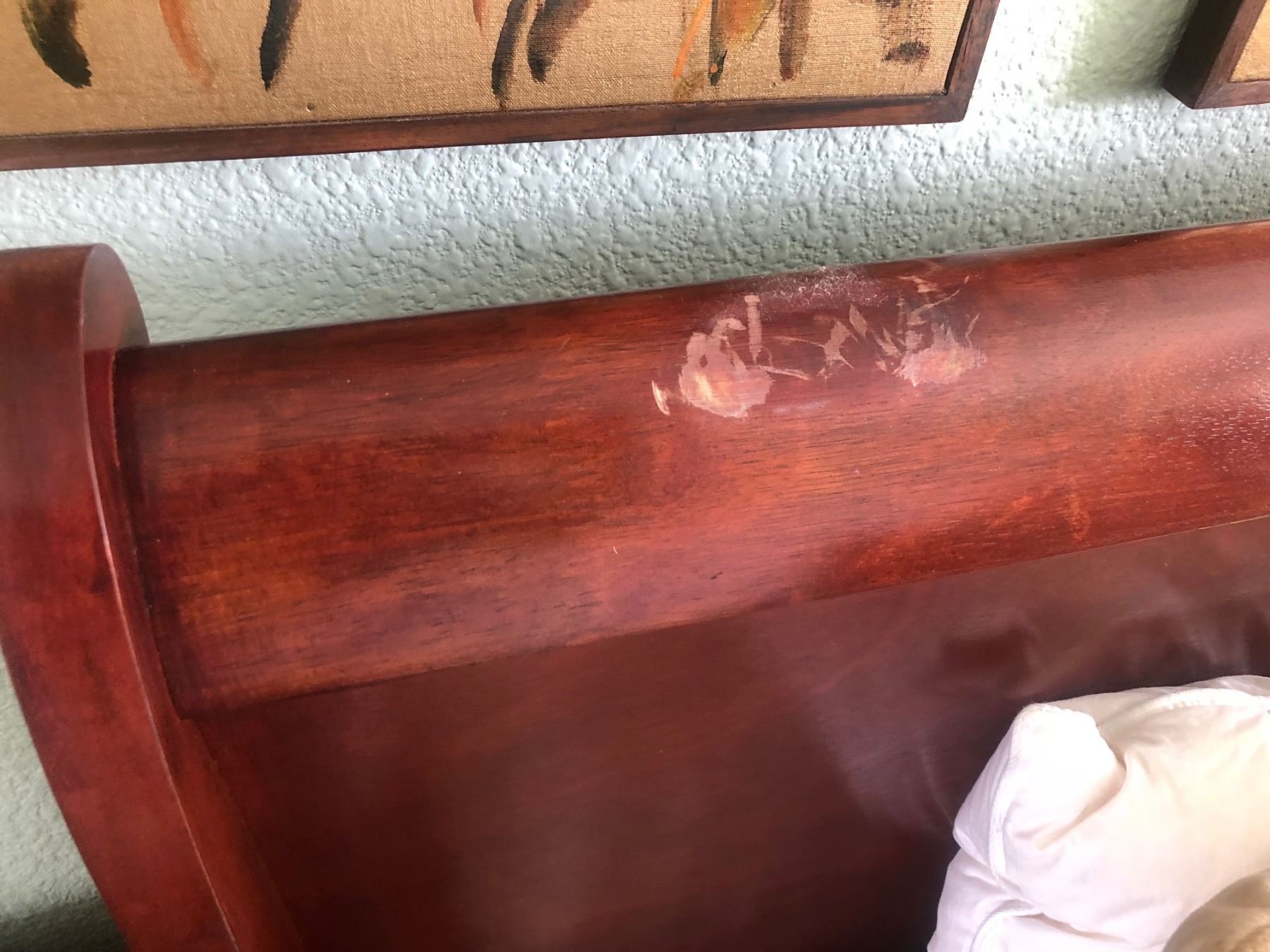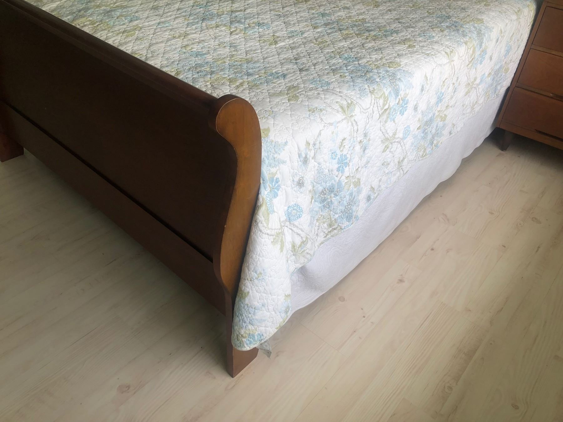 Hardwood Sleigh Bed, Full Size, Headboard/Footboard 5'3, (mattress 4'10 W, 6'7 L) (headboard damage - see last picture)