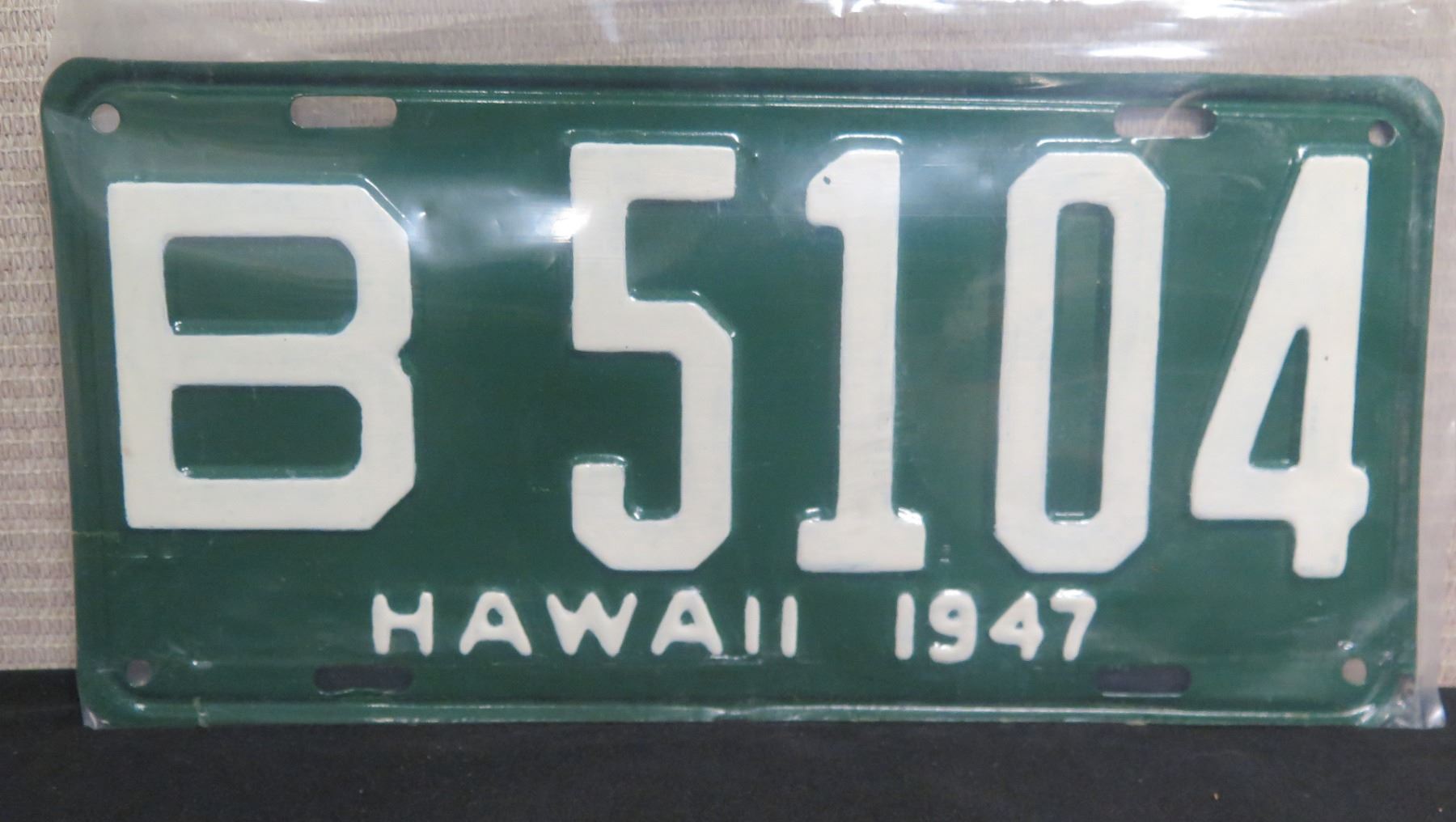 Hawaii 1947 Green License Plate B5104, 13"x6.5"