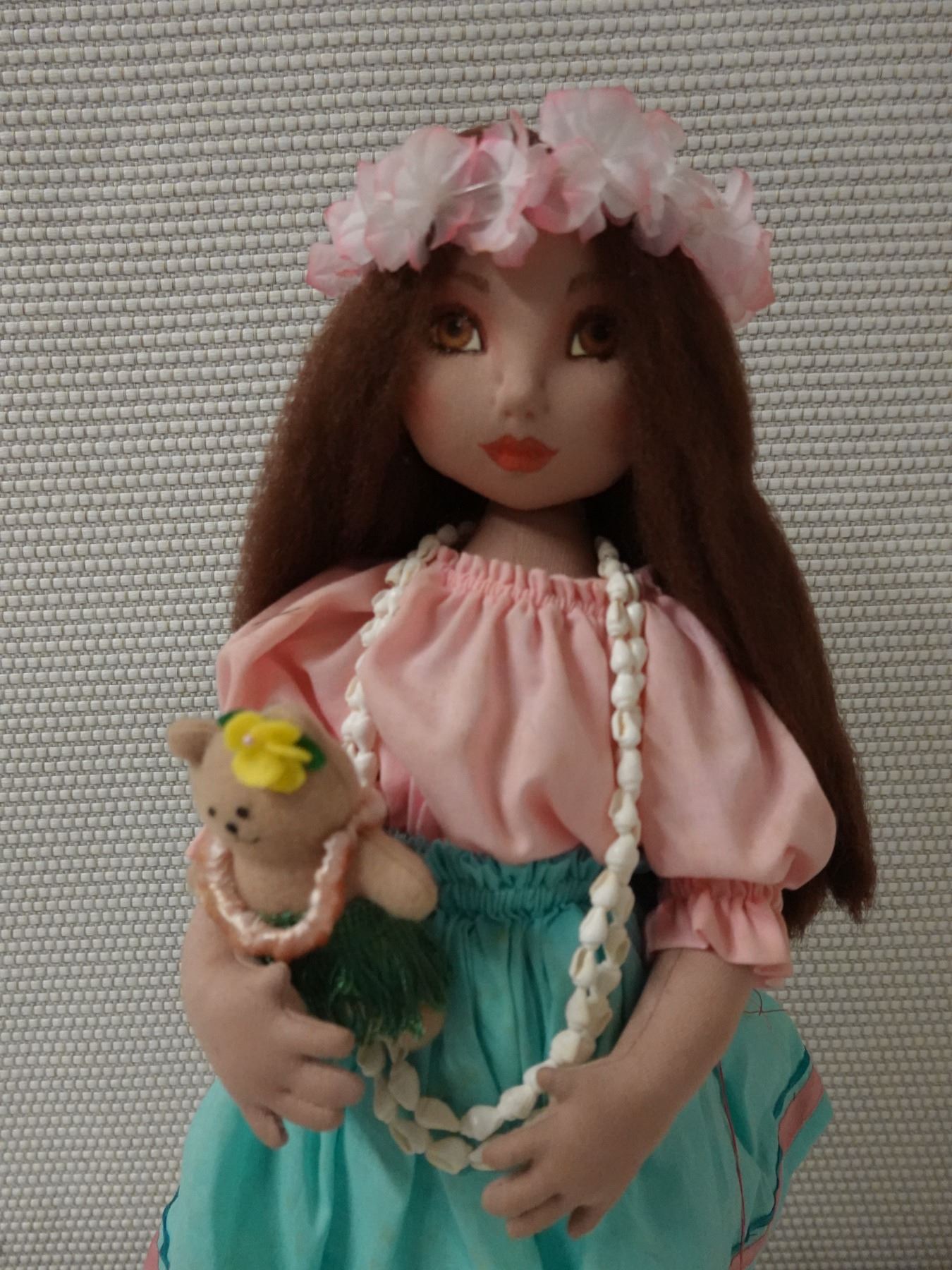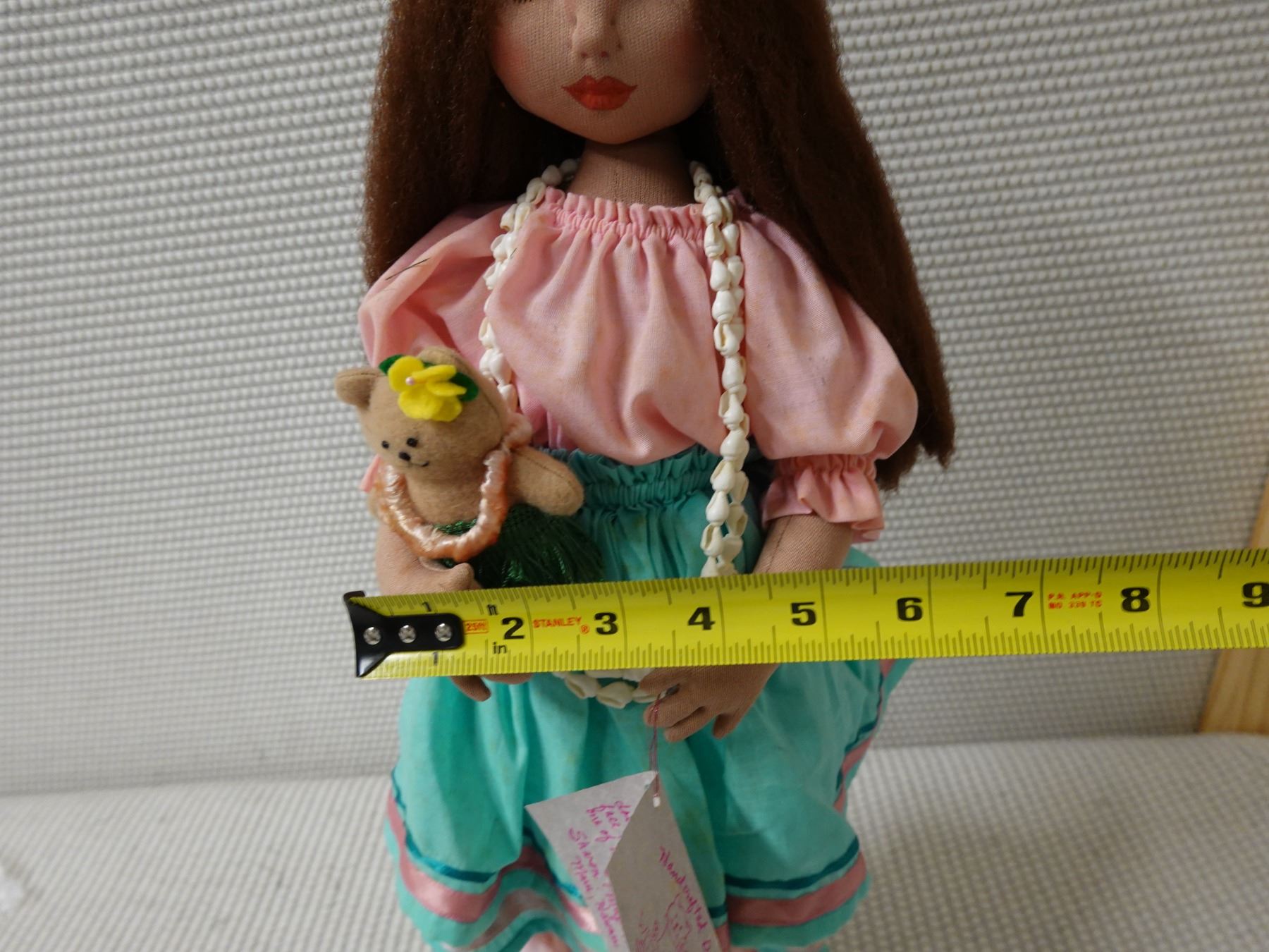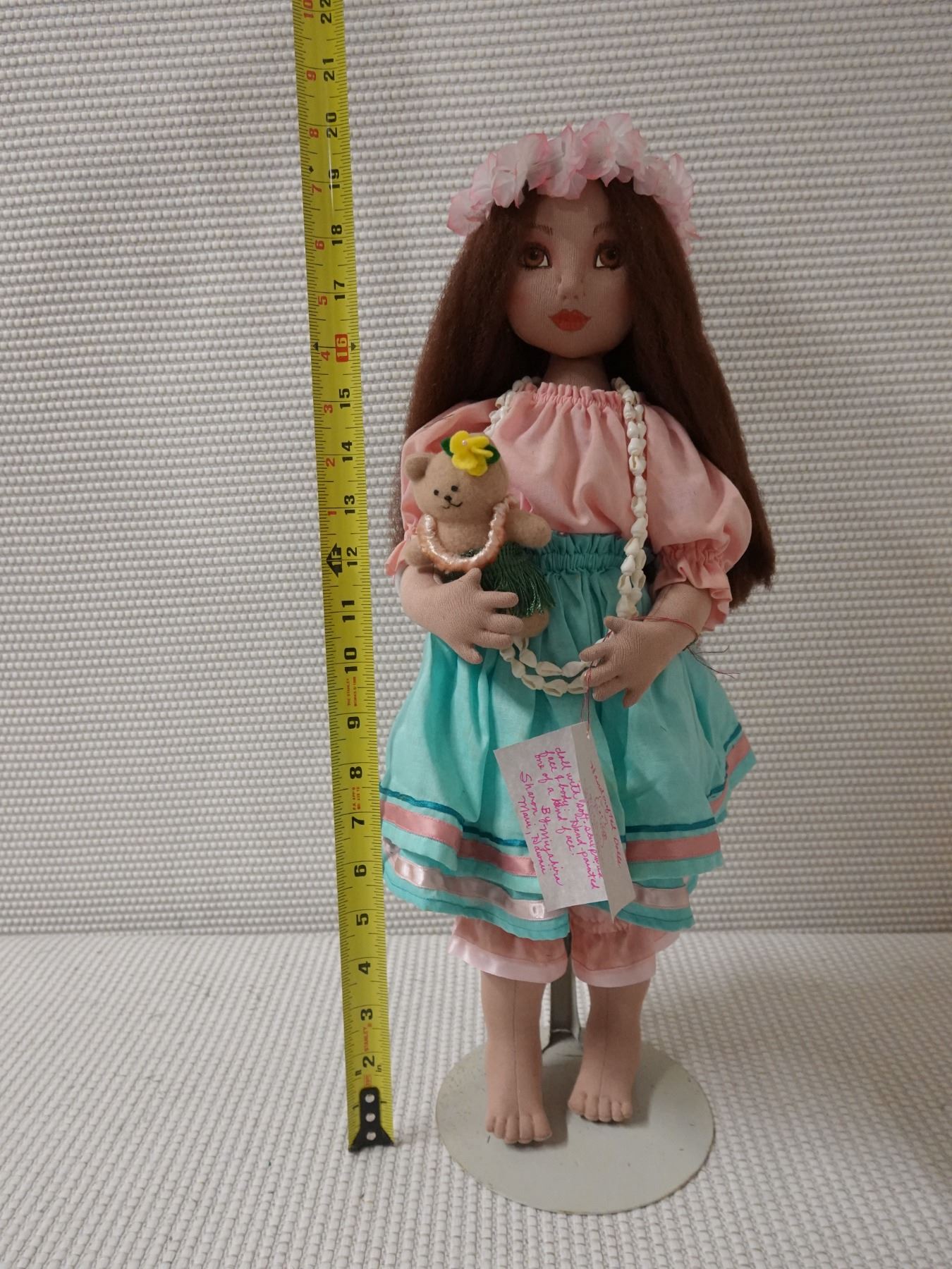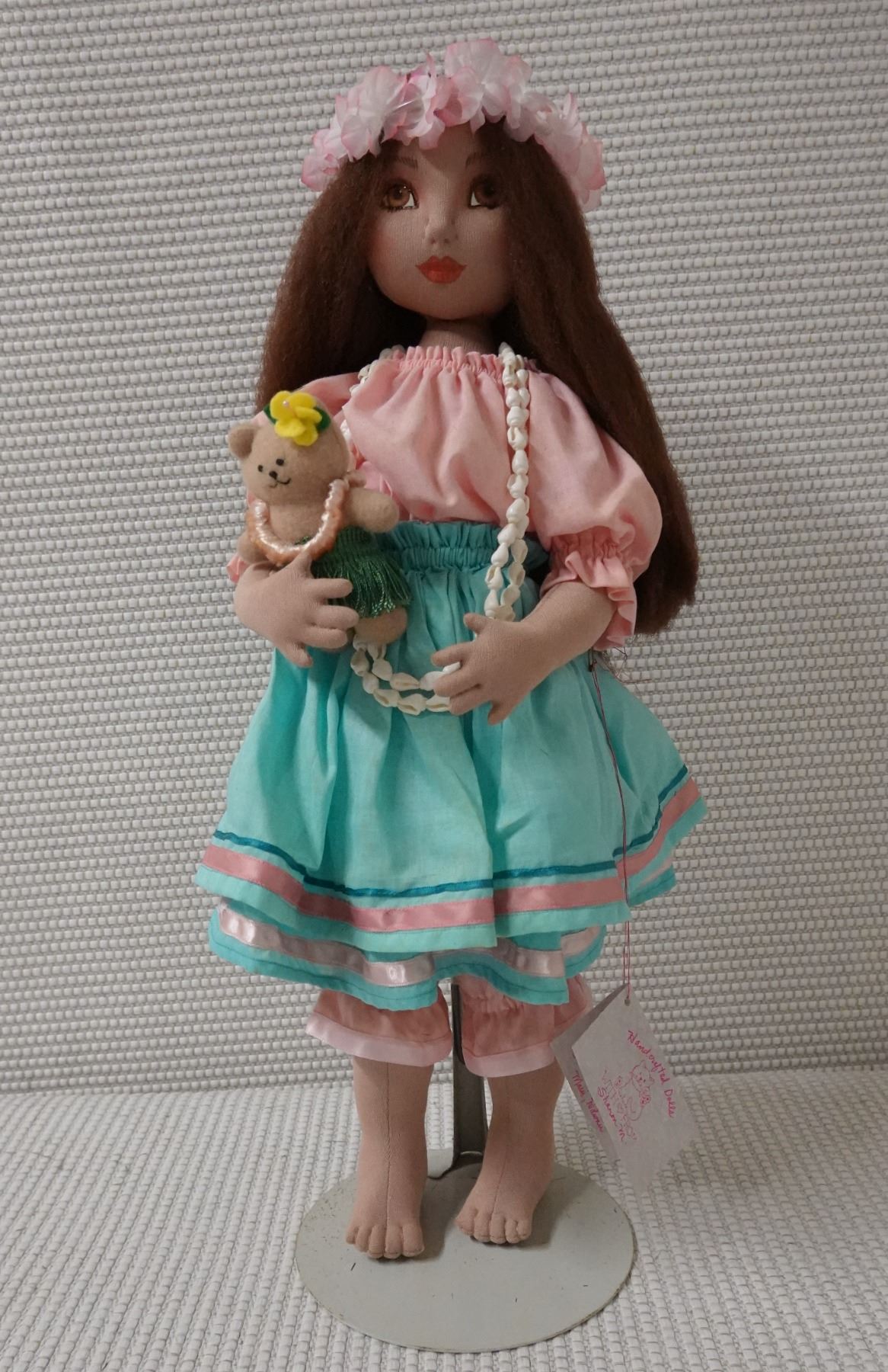 Hawaiian Cloth Doll in Blue Kahiko Costume w/ Bear by Sharon Miyahira 20"H