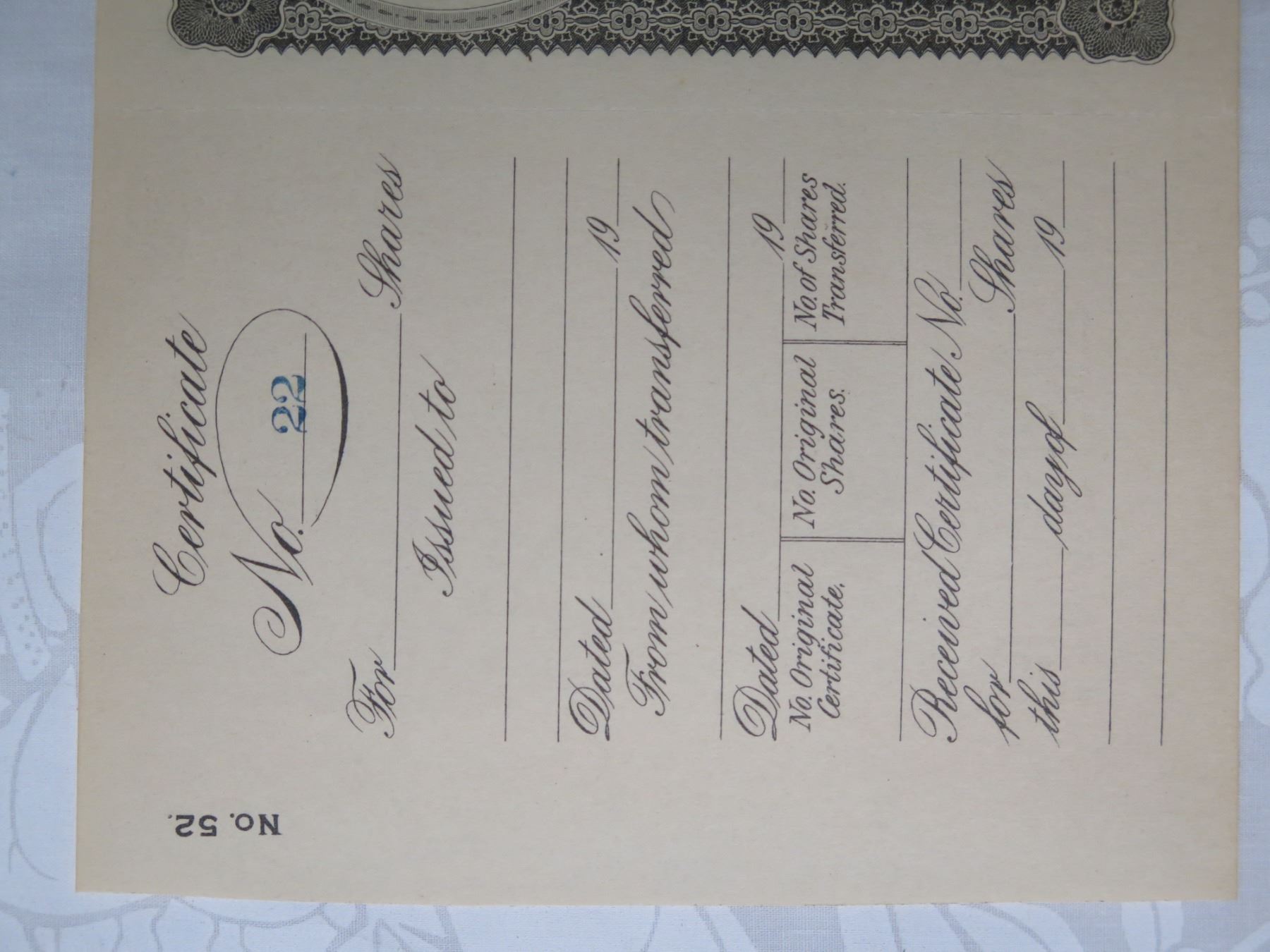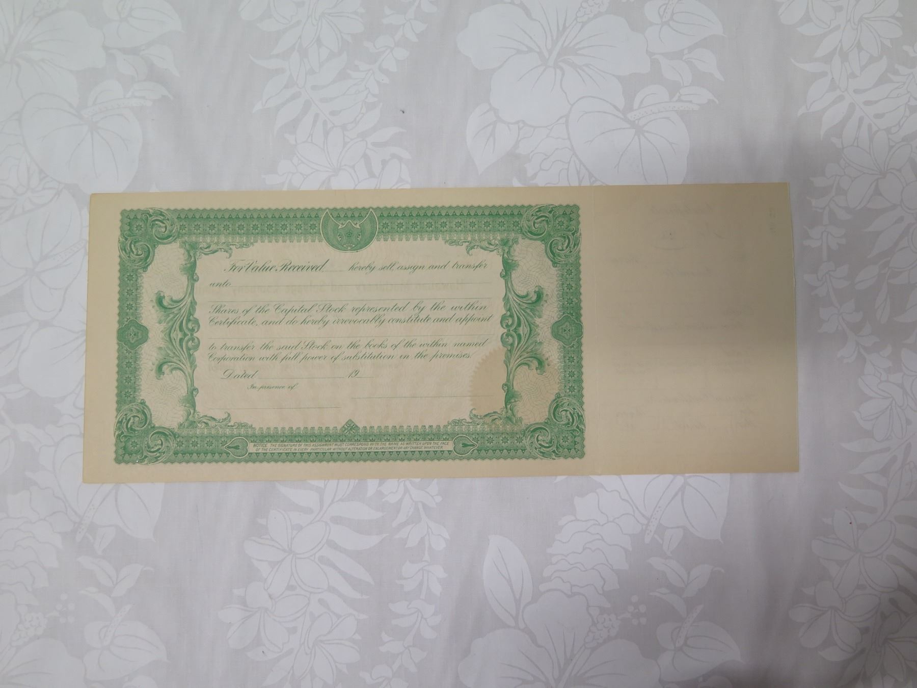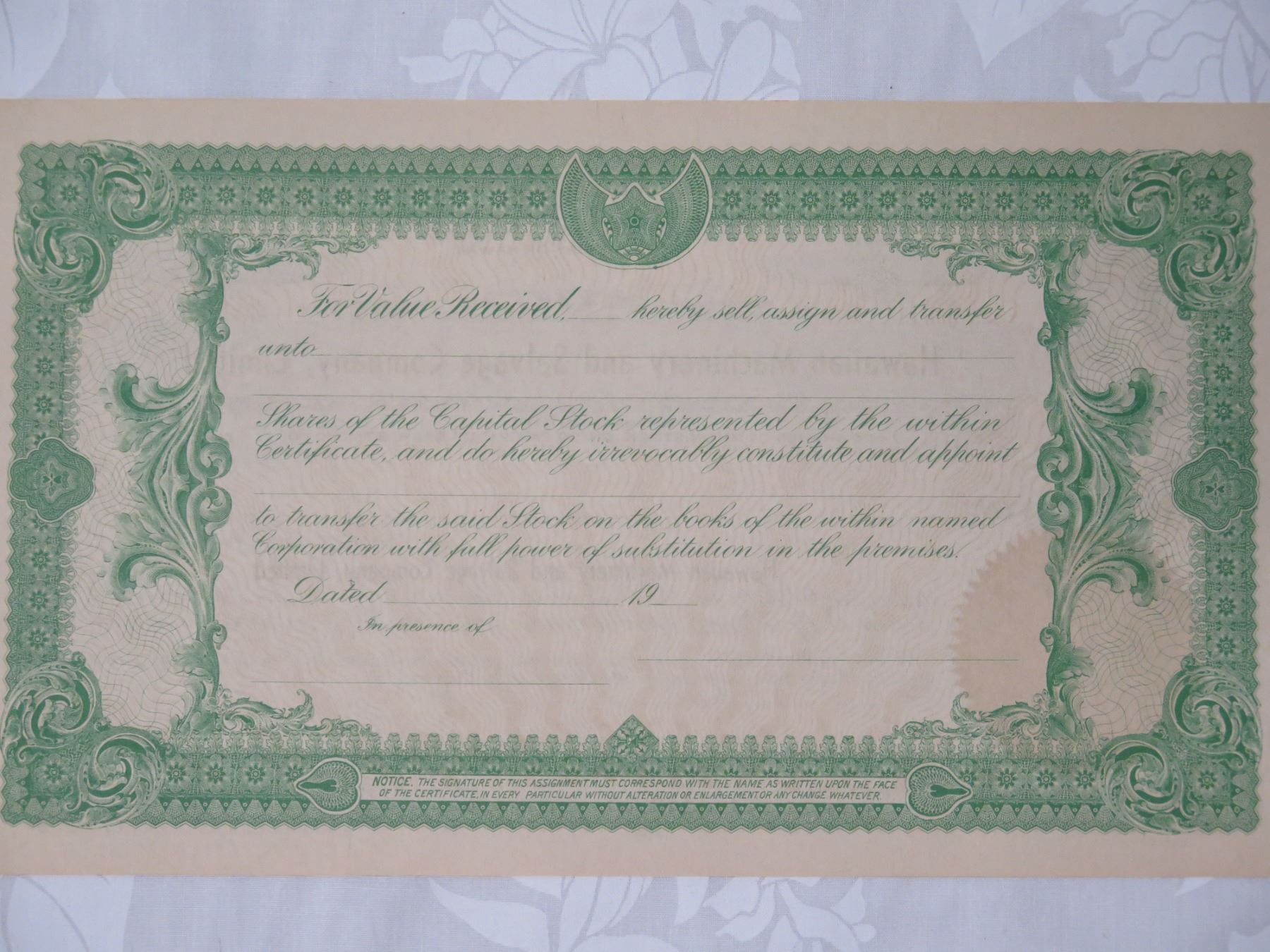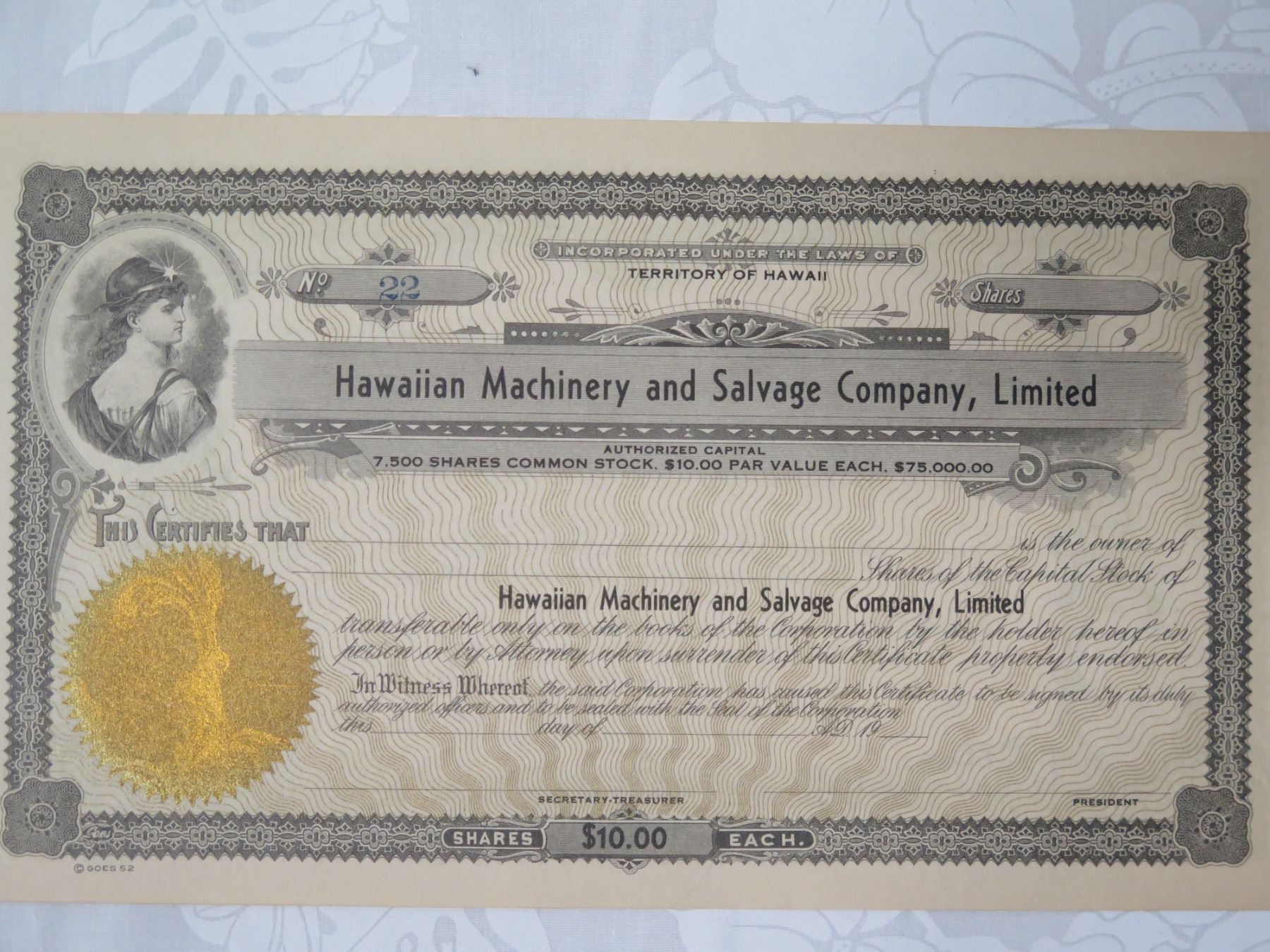Hawaiian Machinery and Salvage Company, Limited Stock Certificate (no cash value) 14"x3.75"