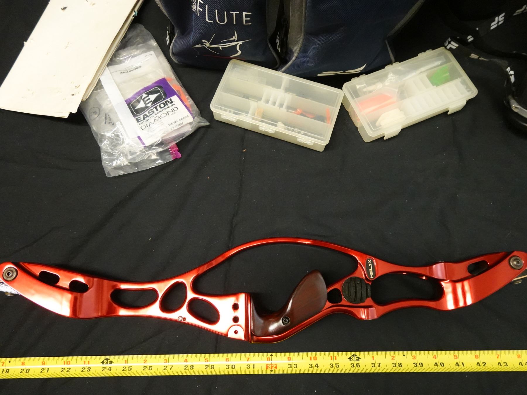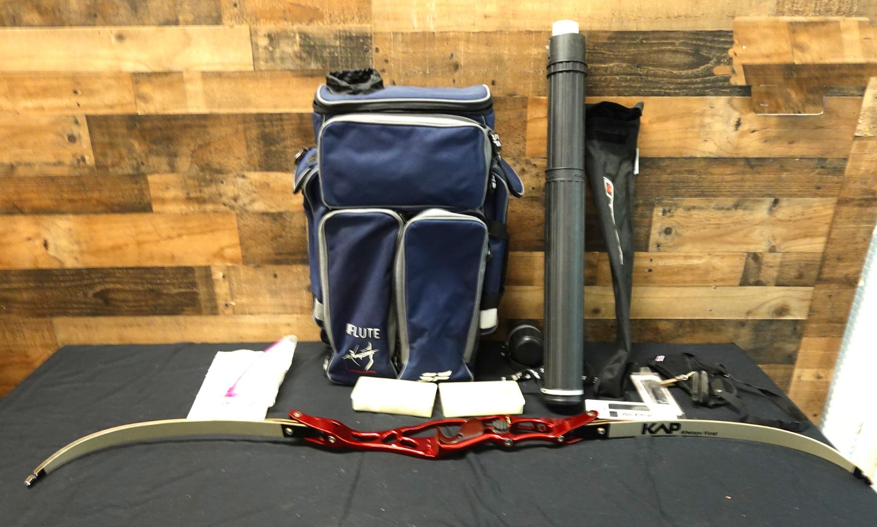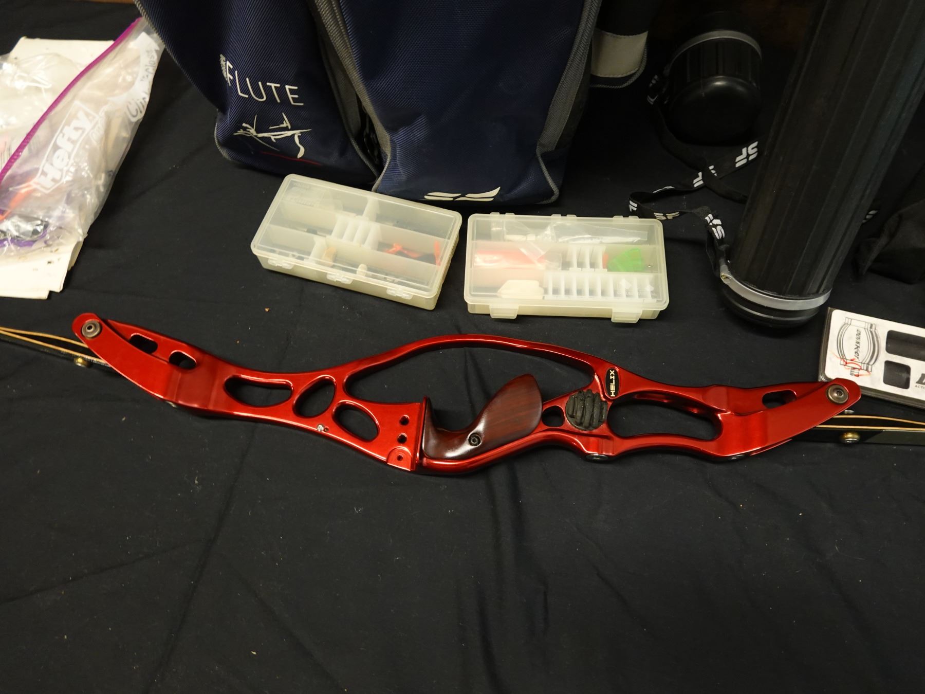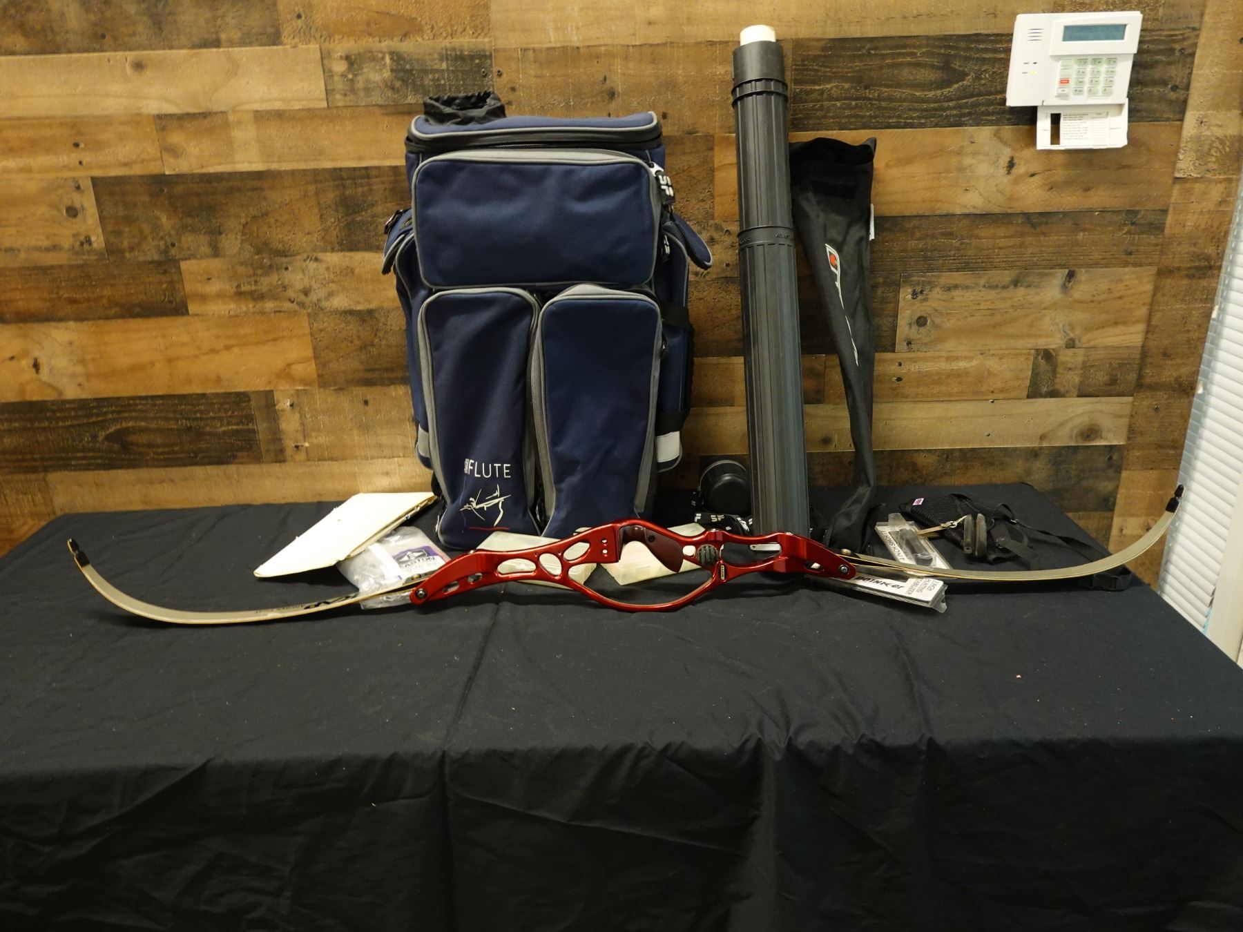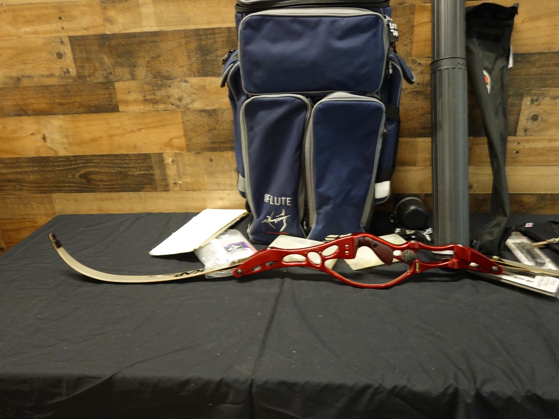 Seller reports this is a Hoyt Helix right handed riser and Win&Win Kap carbon 32 pound limbs. The Flute field backpack is included with arrow/target hard tube, rain cover, padded slots for limbs and risers, and a fully loaded box of repair bits and bobs for your new bow.