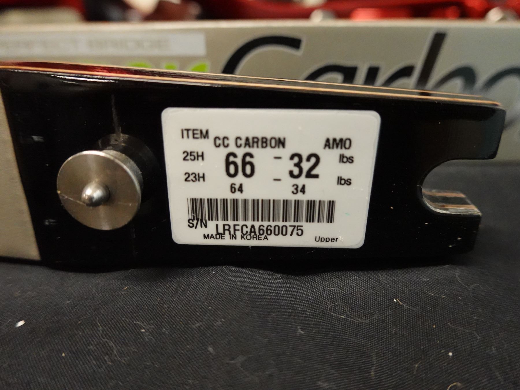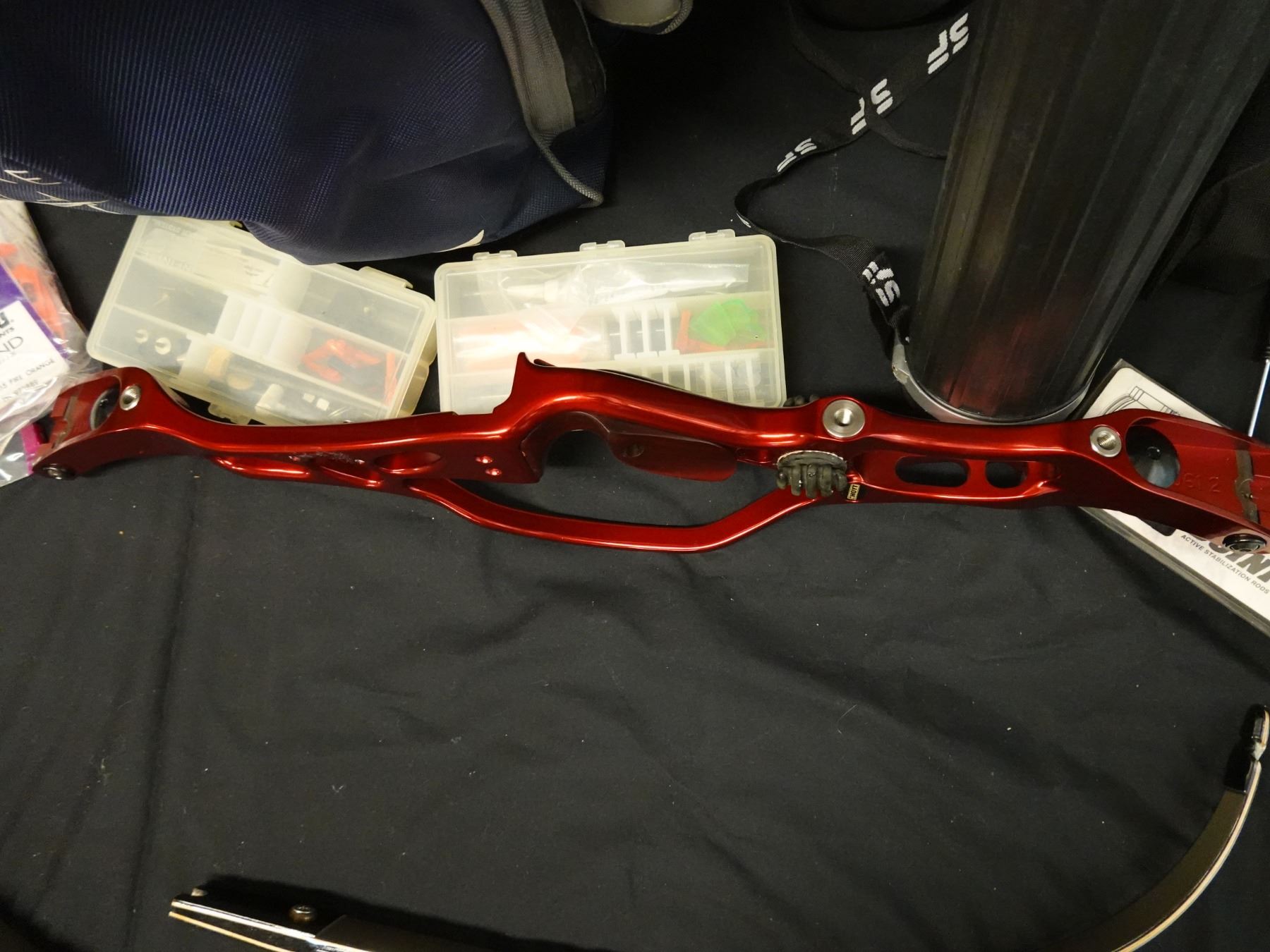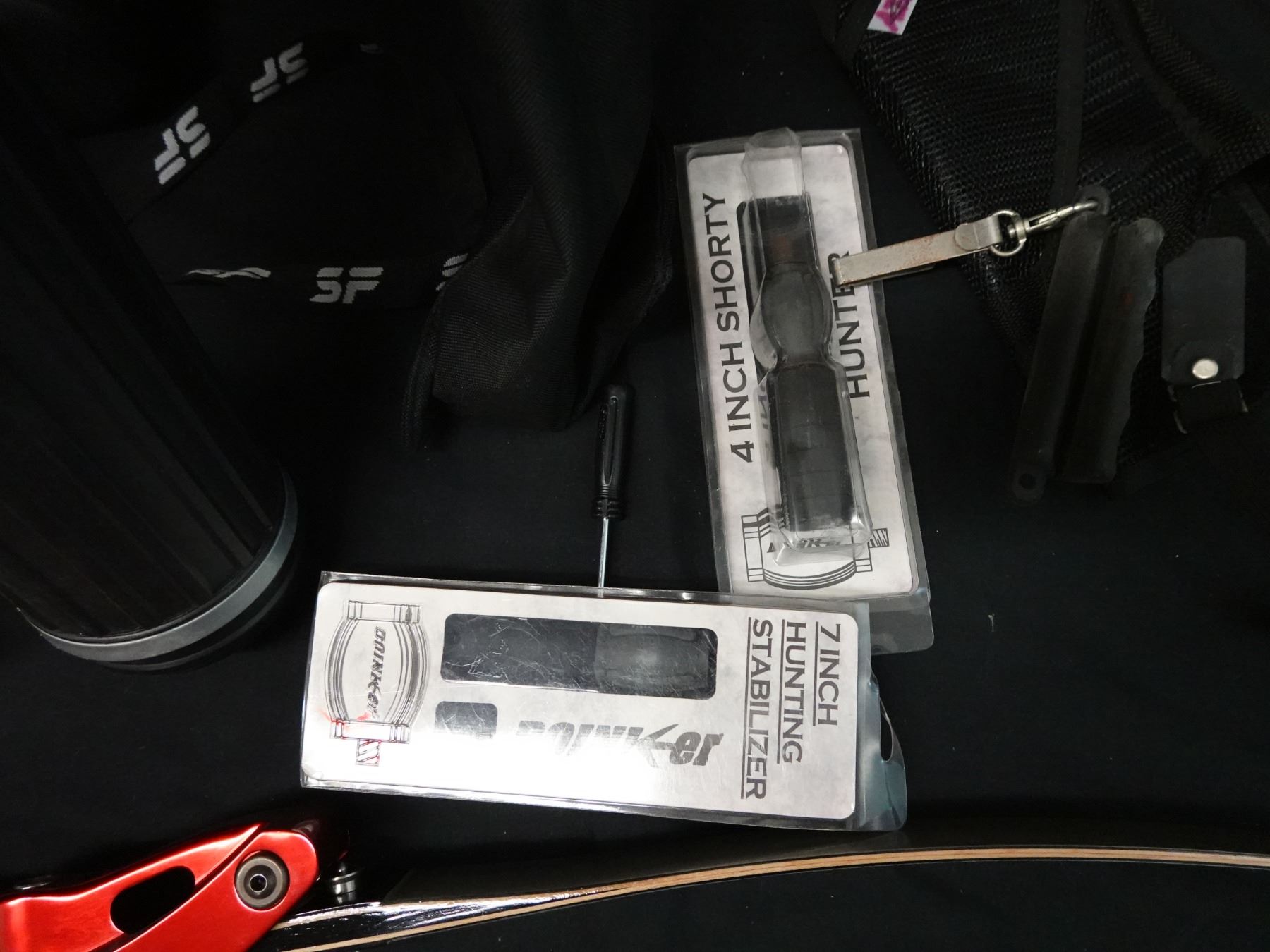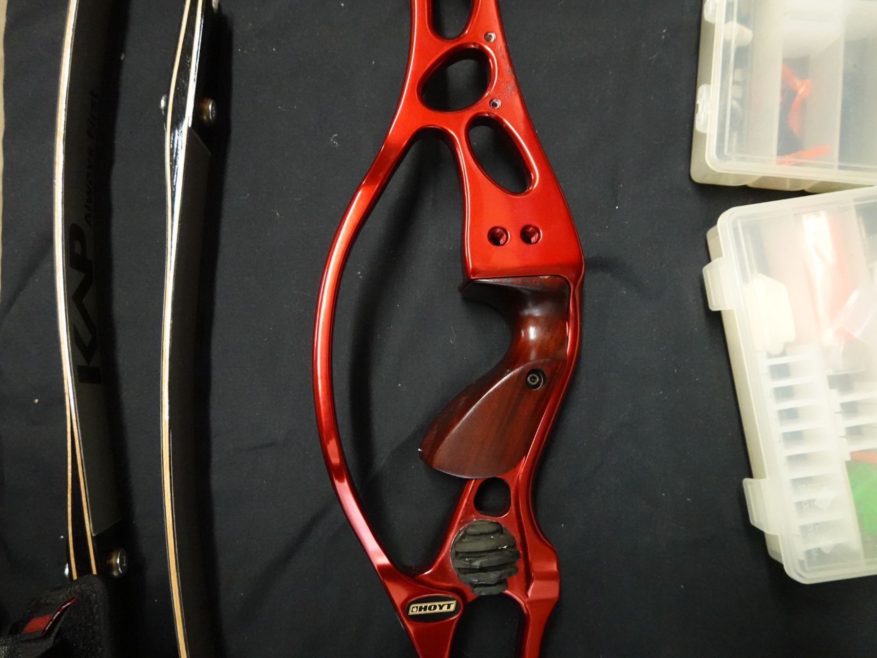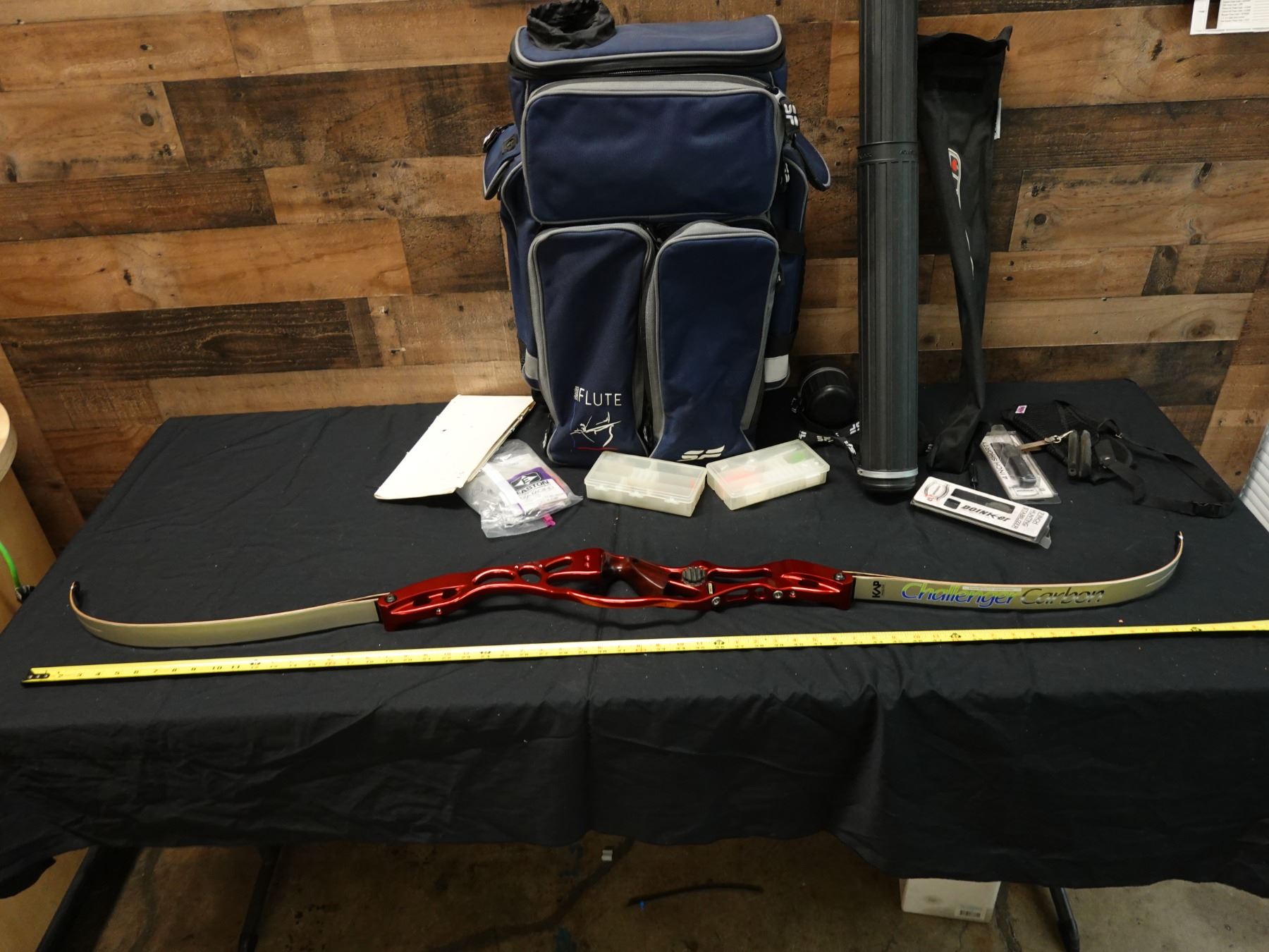 Seller reports this is a Hoyt Helix right handed riser and Win&Win Kap carbon 32 pound limbs. The Flute field backpack is included with arrow/target hard tube, rain cover, padded slots for limbs and risers, and a fully loaded box of repair bits and bobs for your new bow.