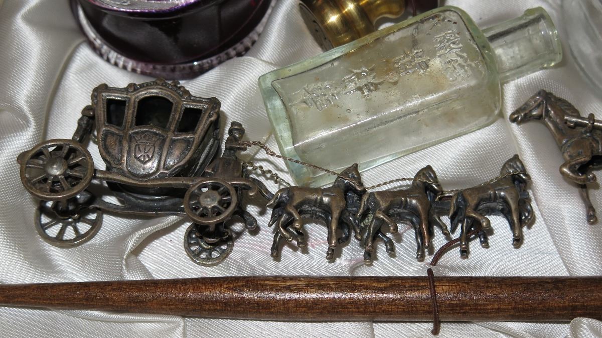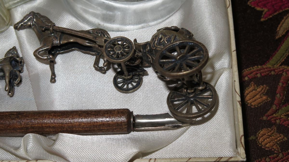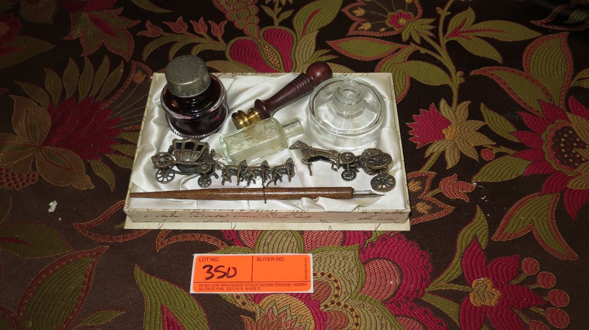 Inkwell w/Pen, Monogram Stamp, Old Bottle, Miniature Horse-Drawn Carriages