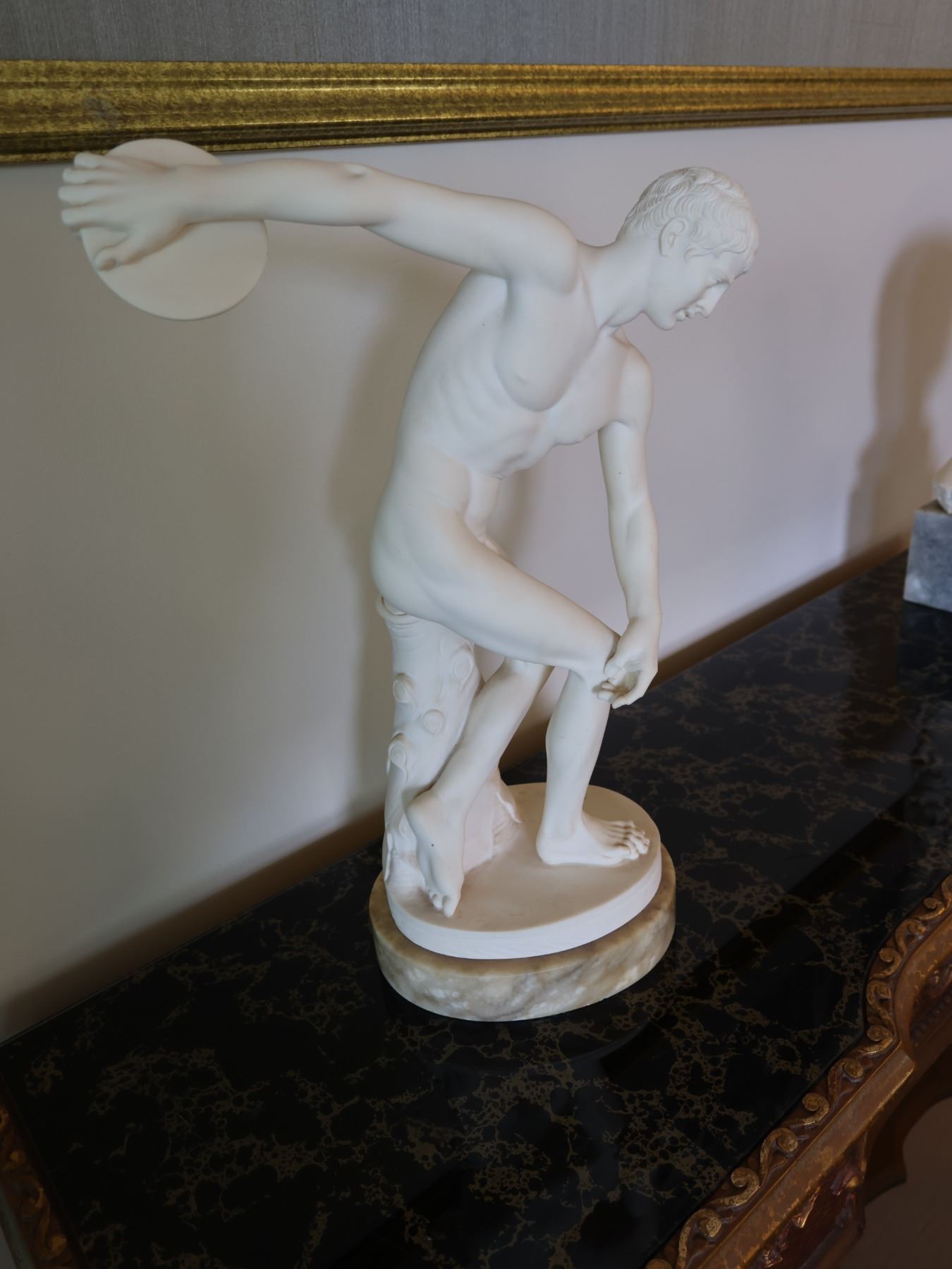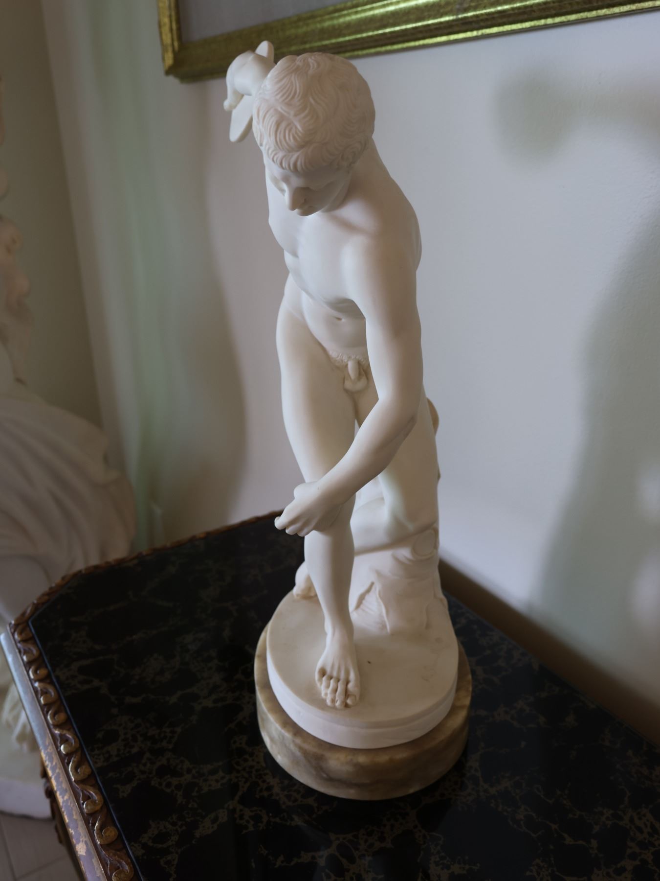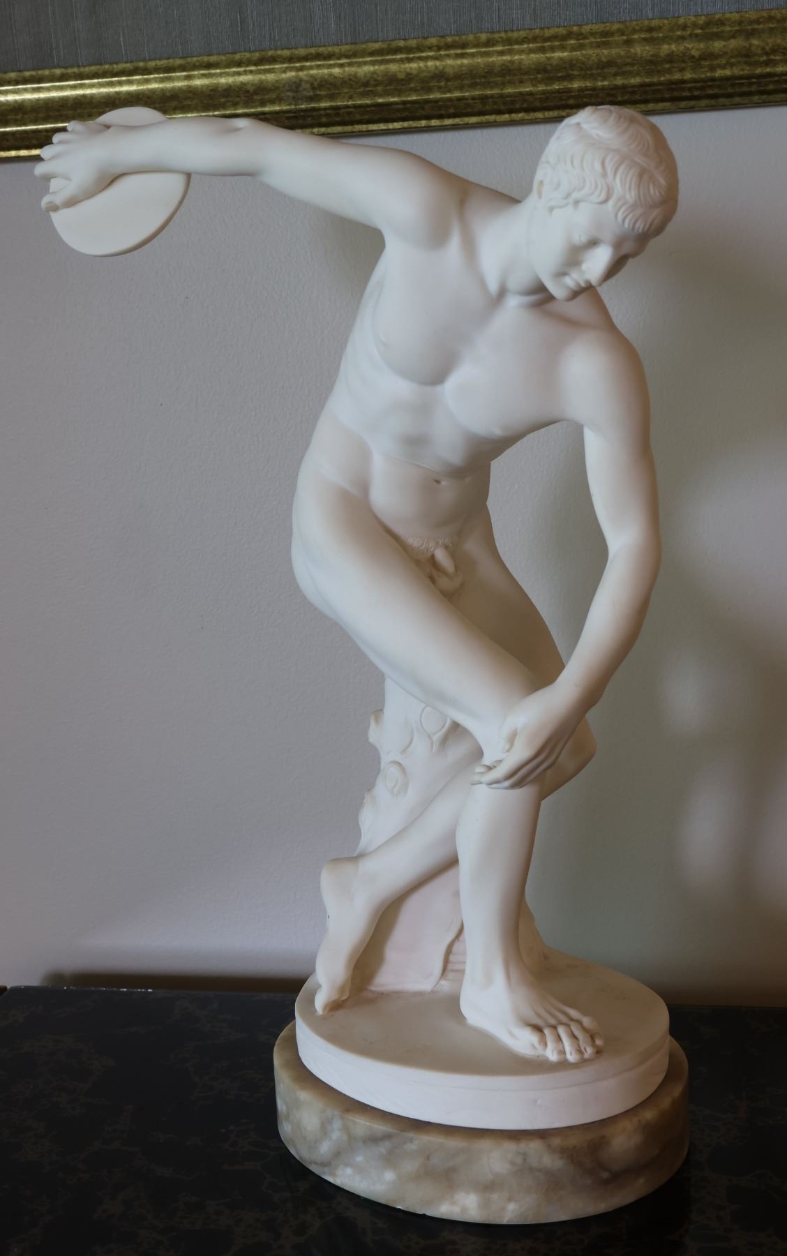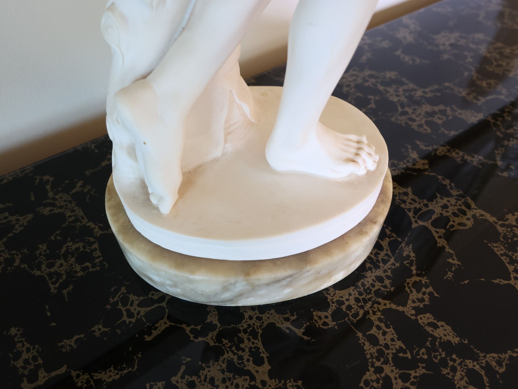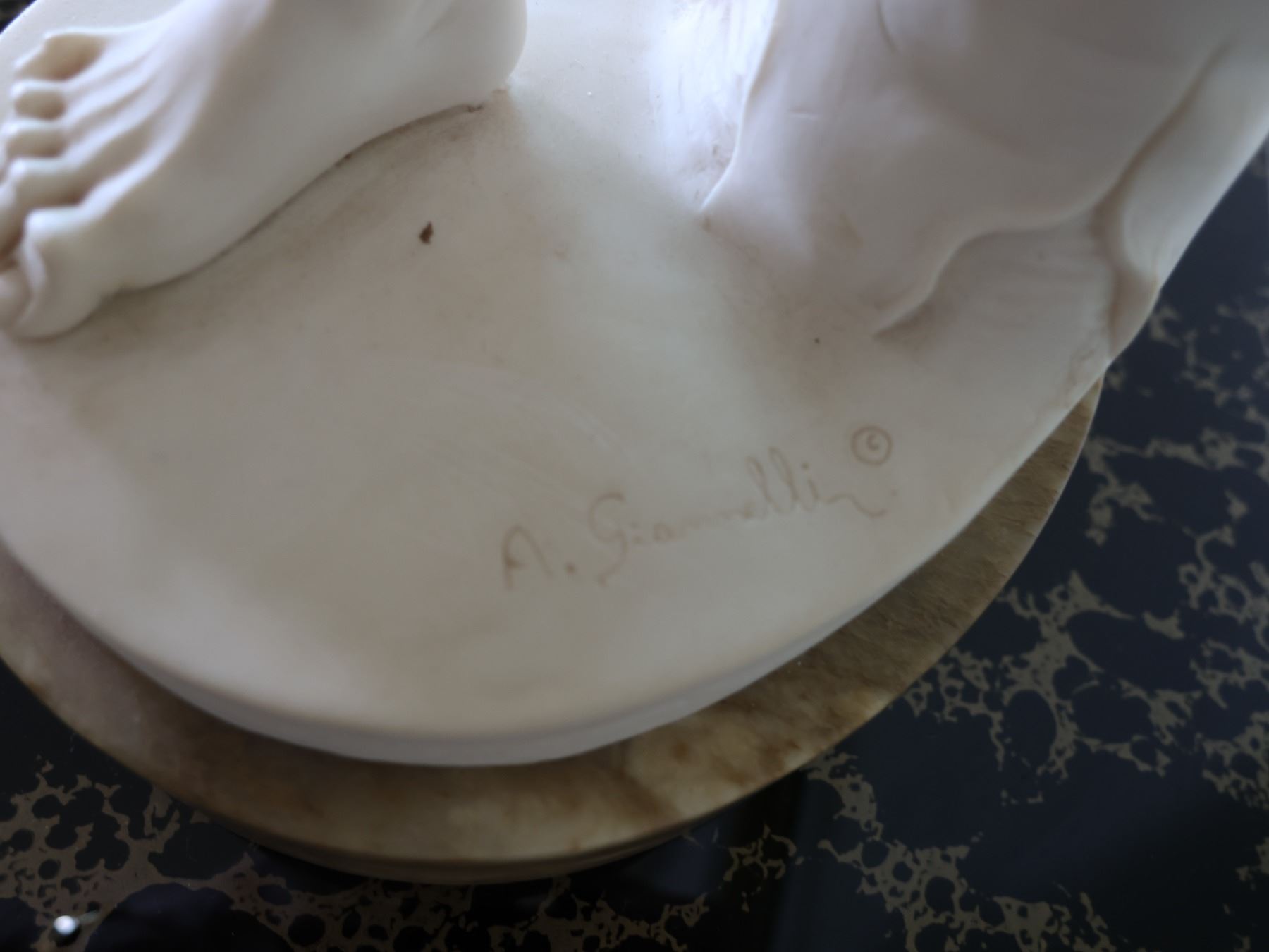 Italian White Marble Sculpture of a Male Discus Thrower Signed by Arnaldo Giannelli 7" Dia (base), 18"H