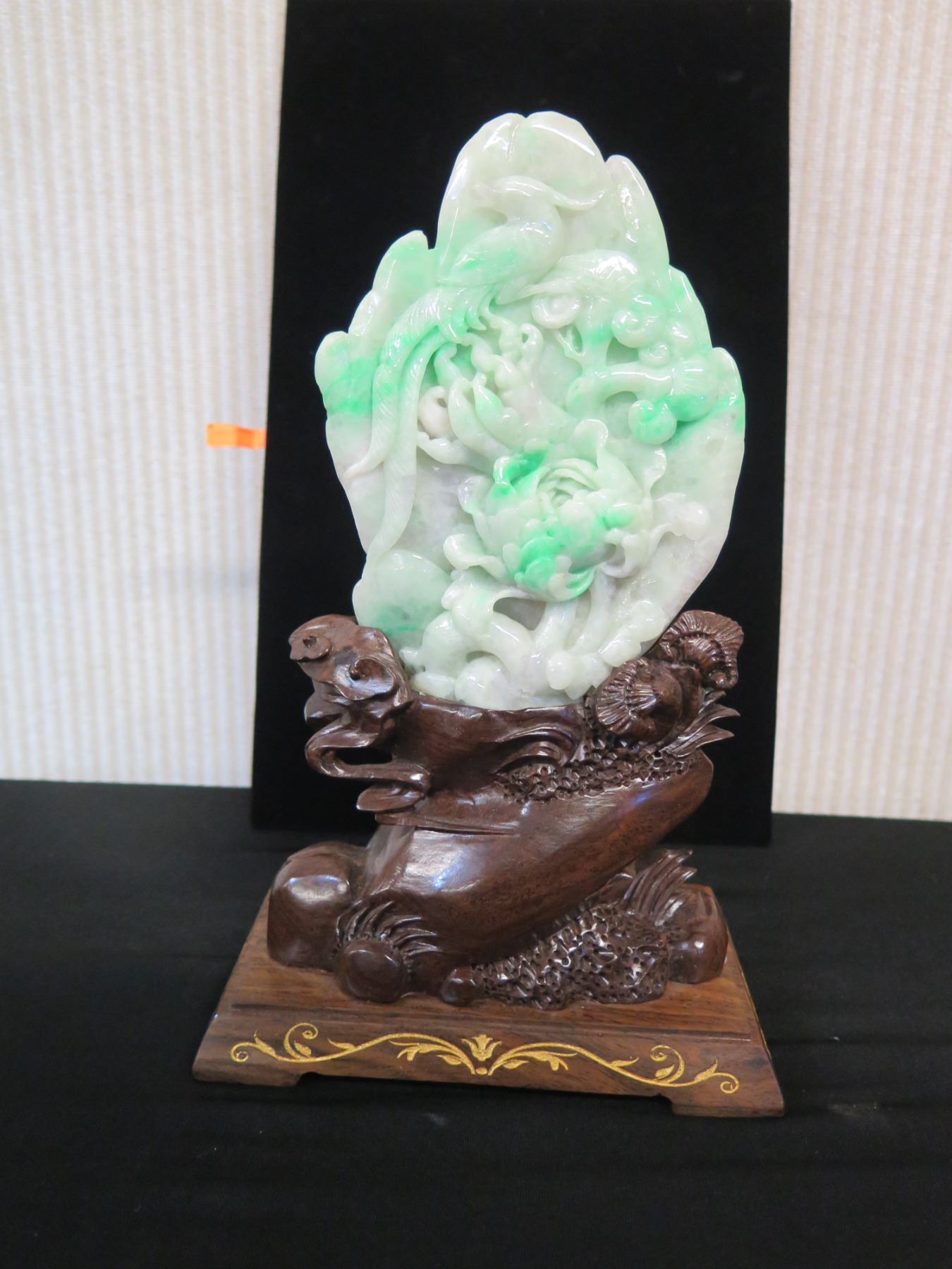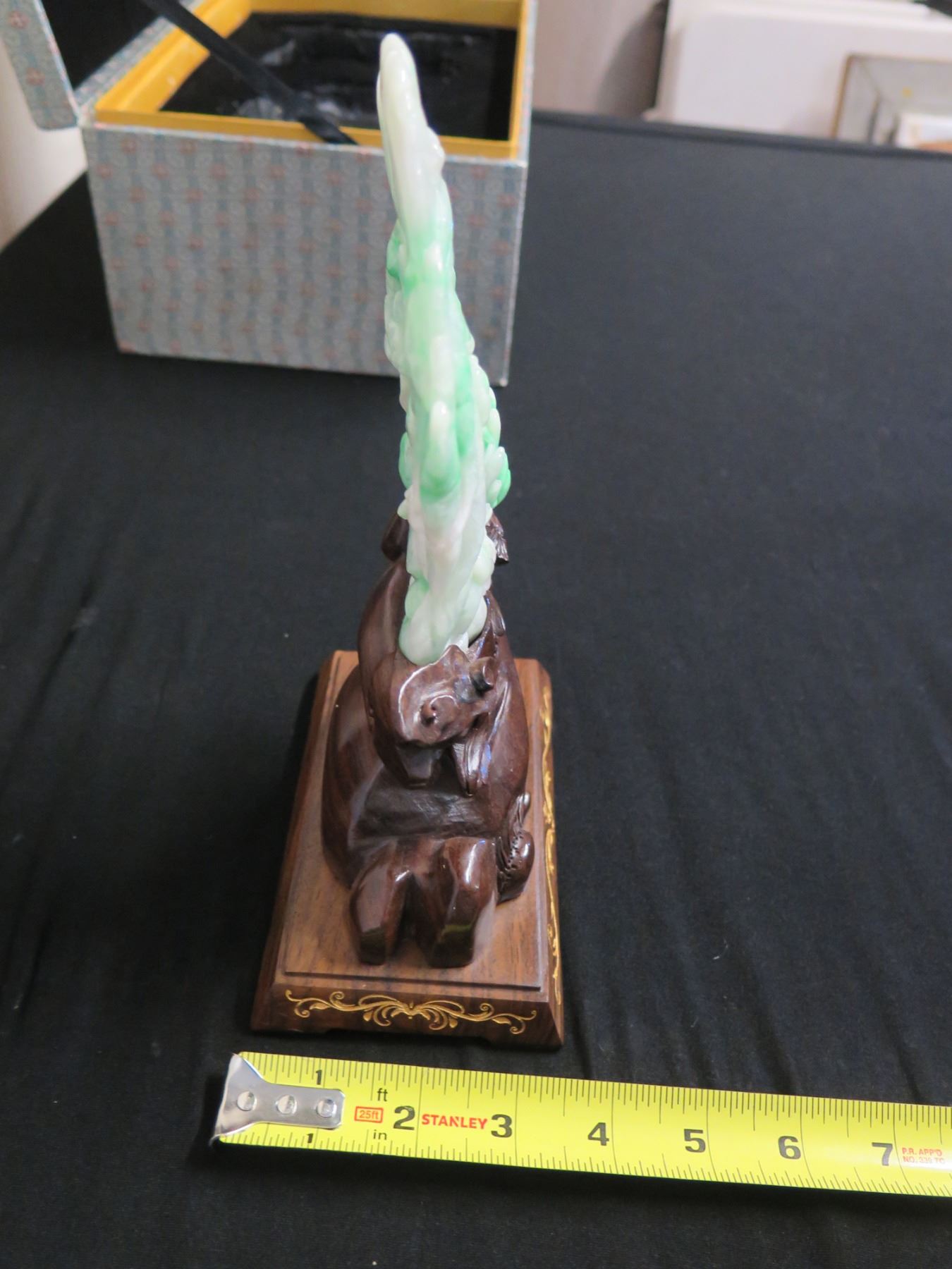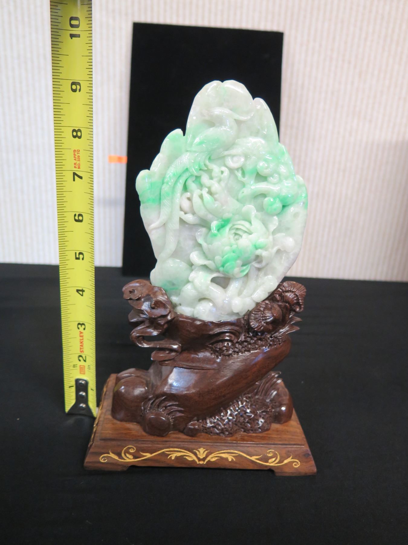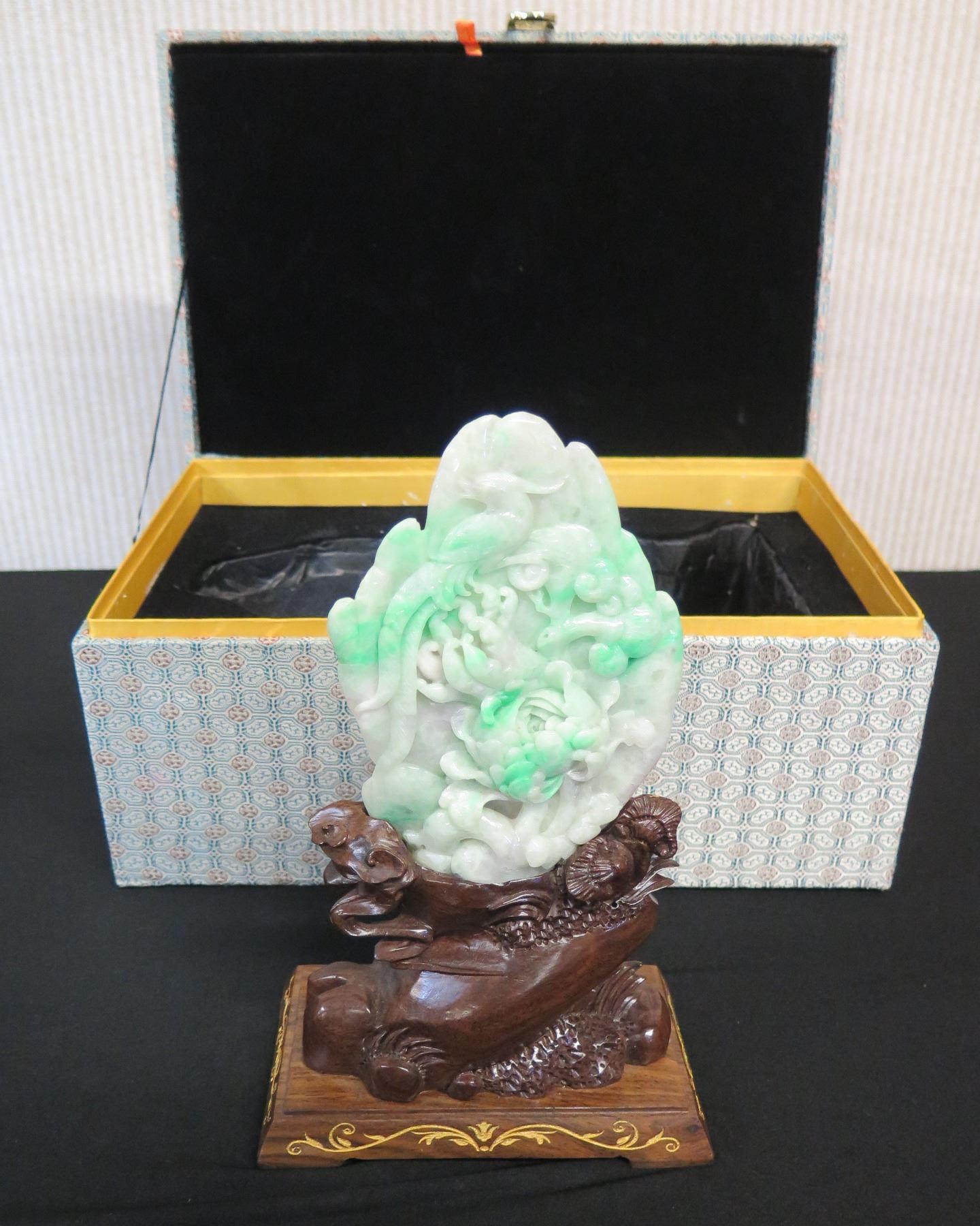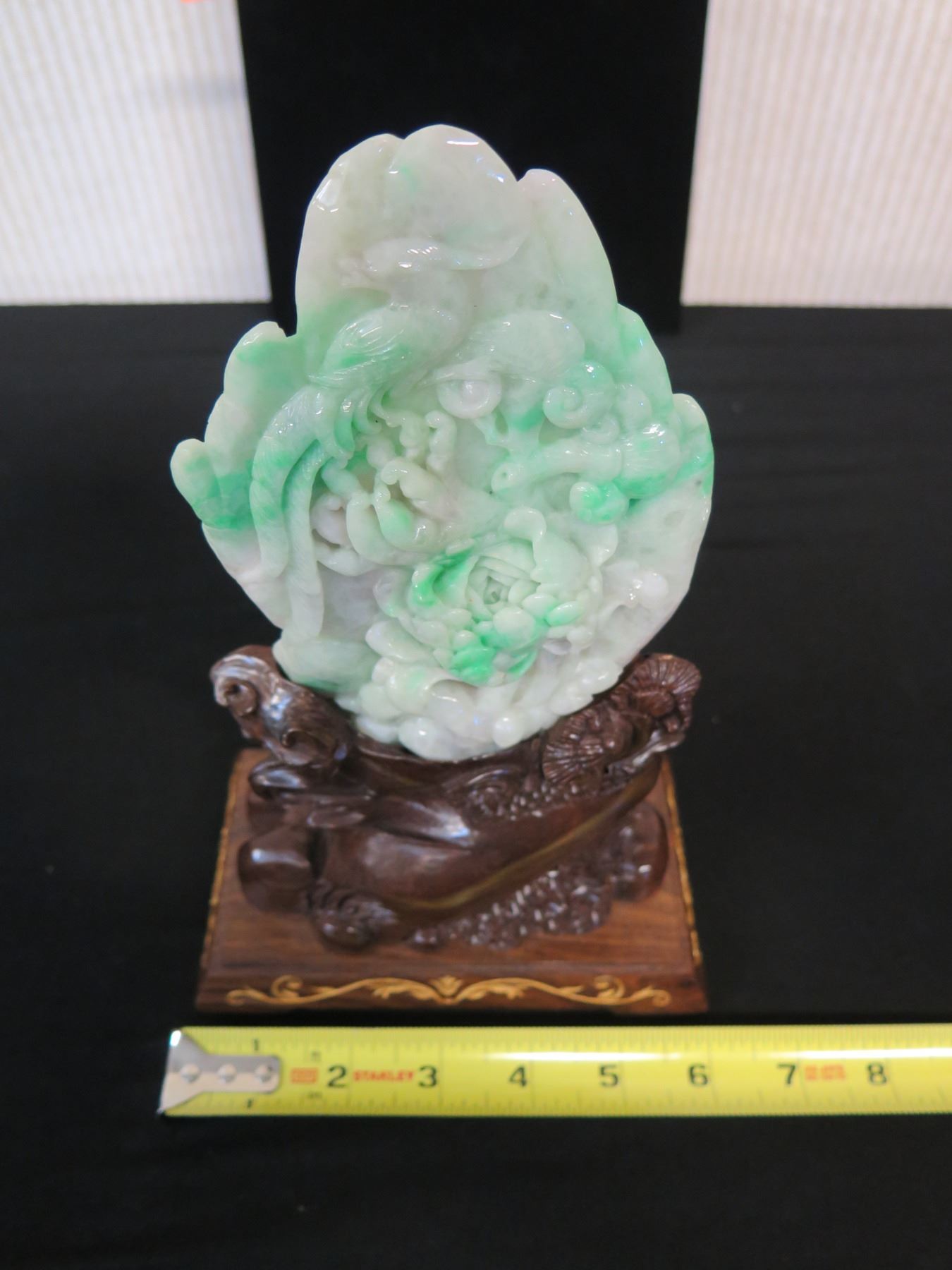 Jade Floral Décor on Wooden Stand 6" x 4" x 9.5"H in Hinged Box. The currently owner reported that this was purchased for $12K.