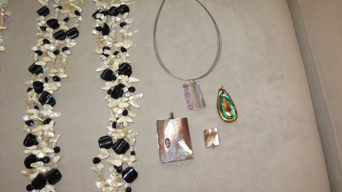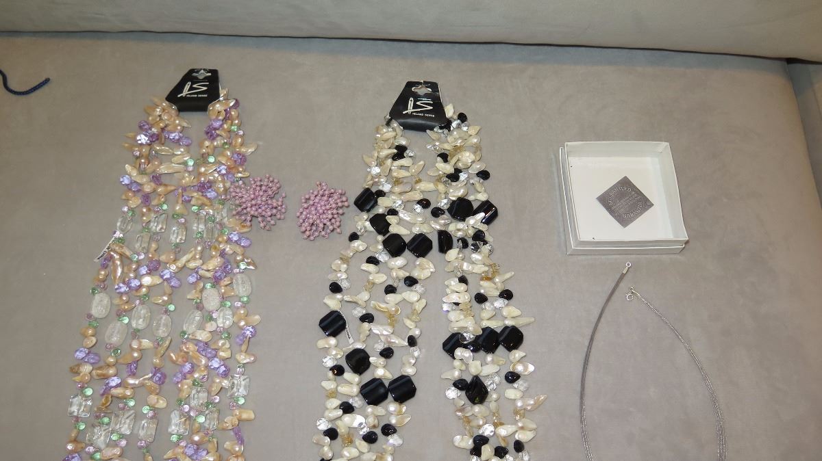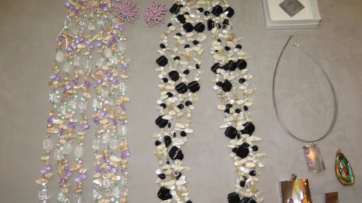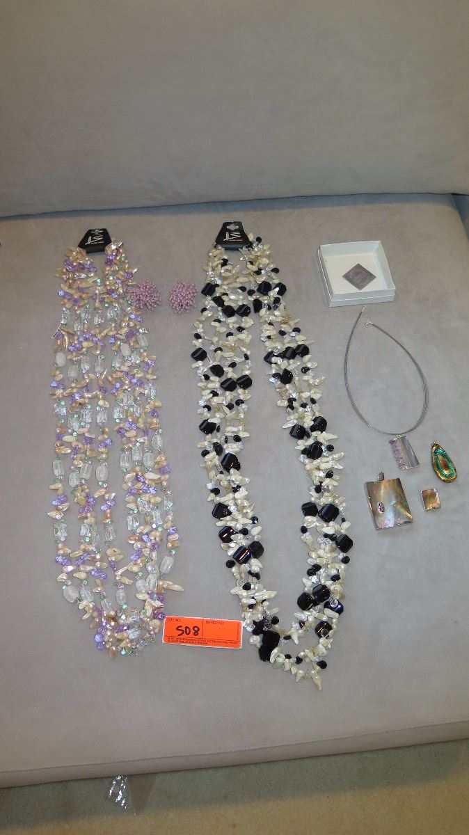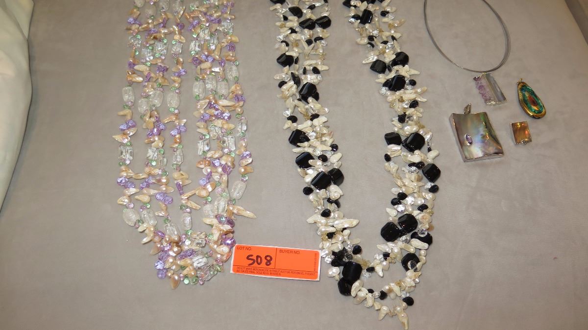 Jewelry: 2 Multi-Strand Glass/Bead Necklaces, Rope Chain w/4 Pendants, Earrings