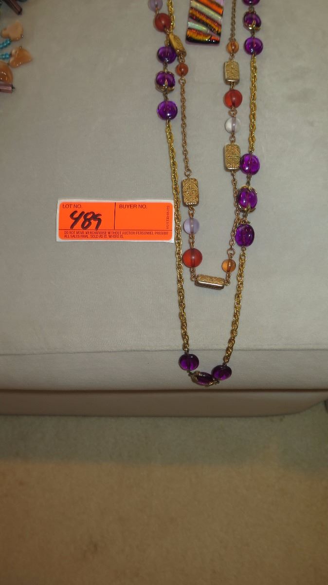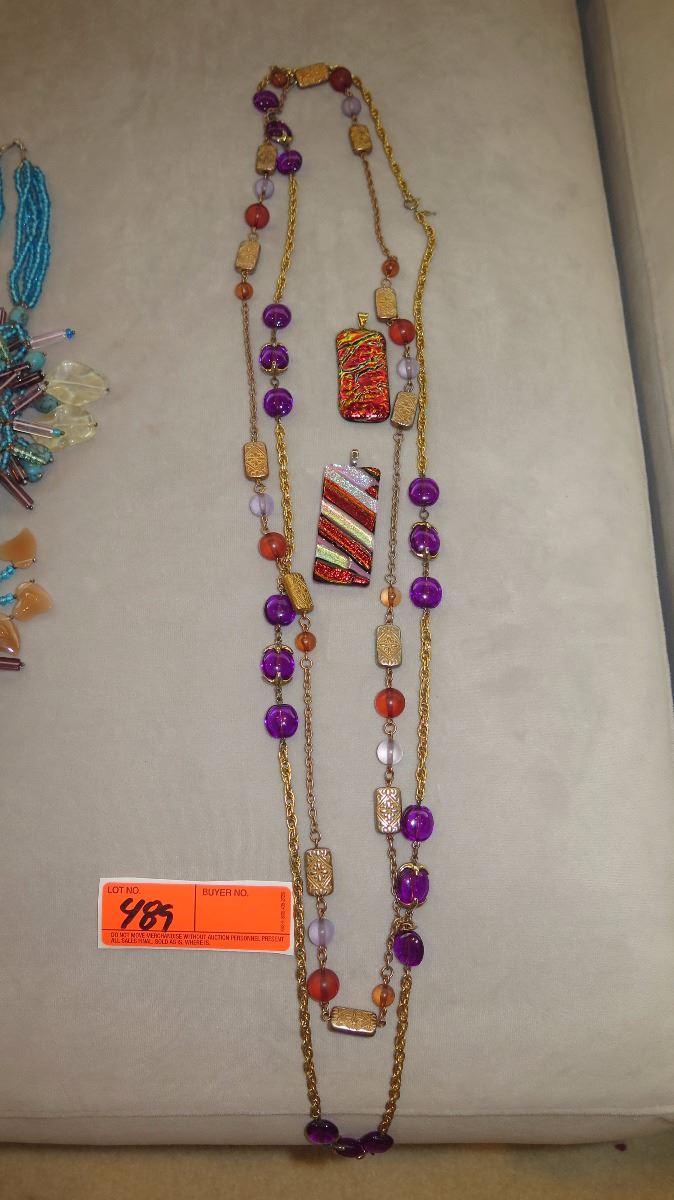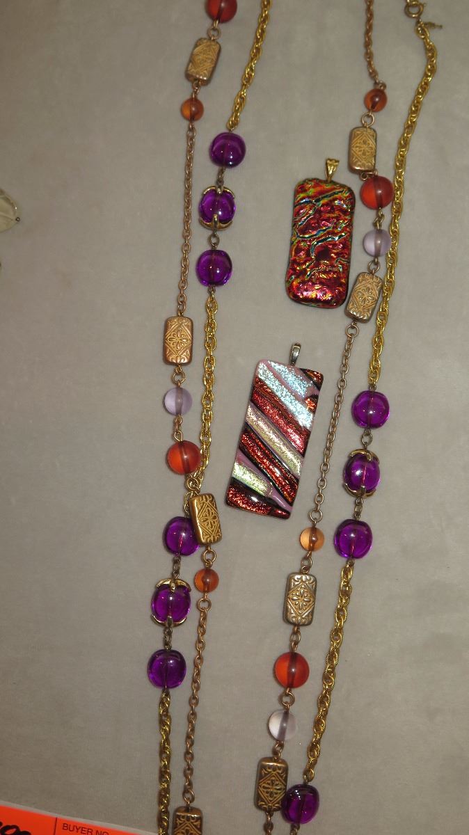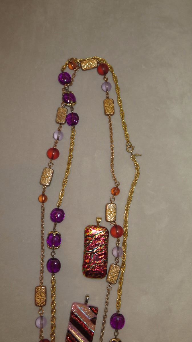 Jewelry: 2 Purple/Orange Glass Bead Necklaces, 2 Colorful Glass Pendants