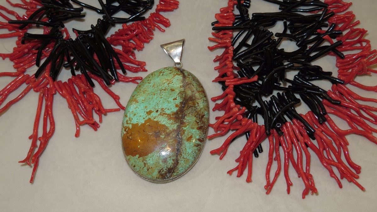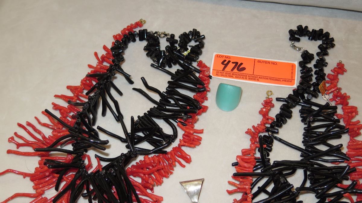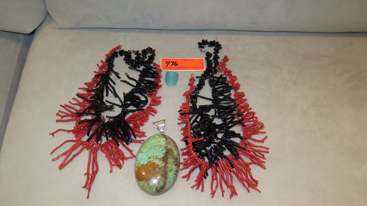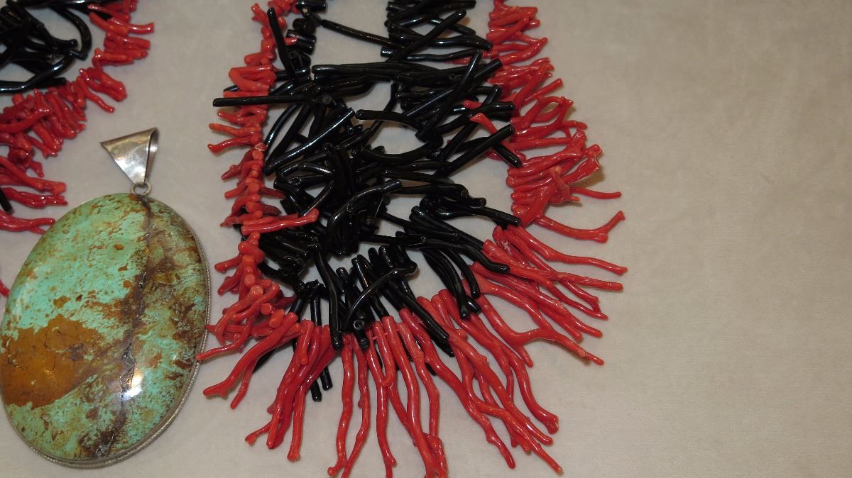 Jewelry: 4 Faux Coral Drape Necklaces (Red/Black), Lrg Heirloom Oval Stone Pendant