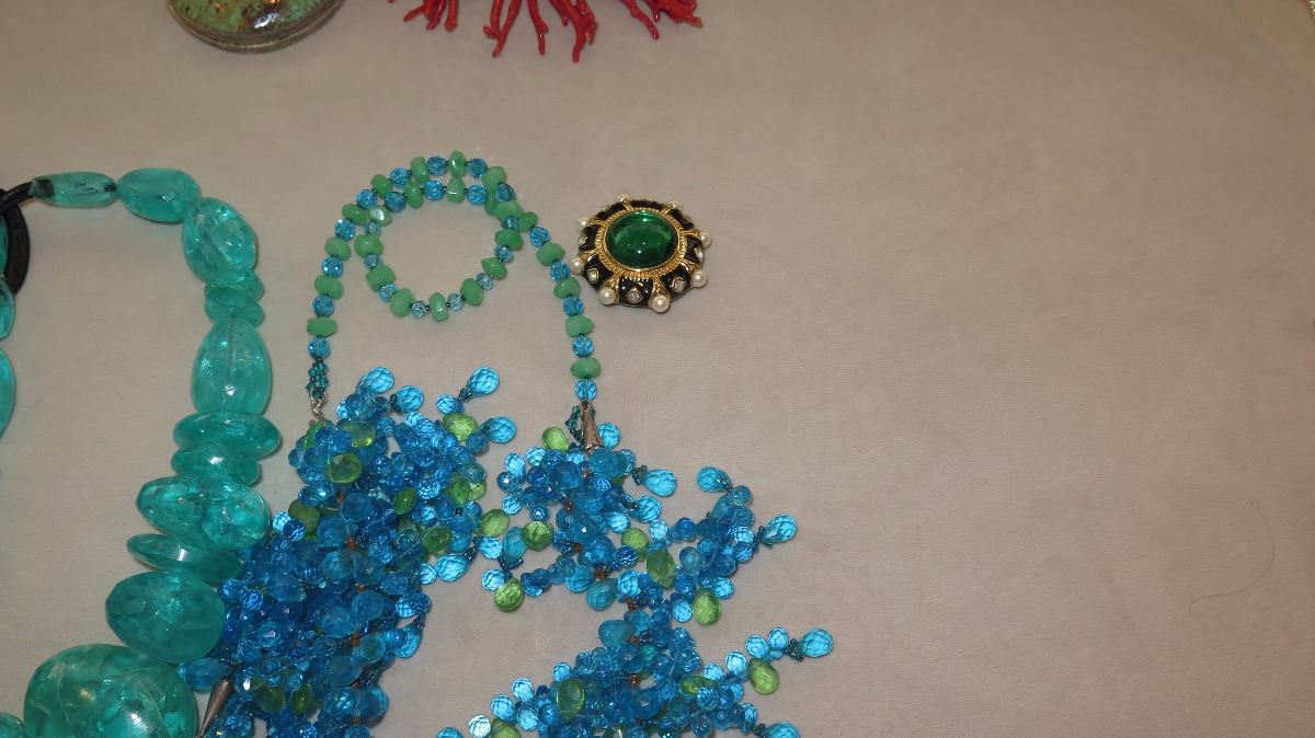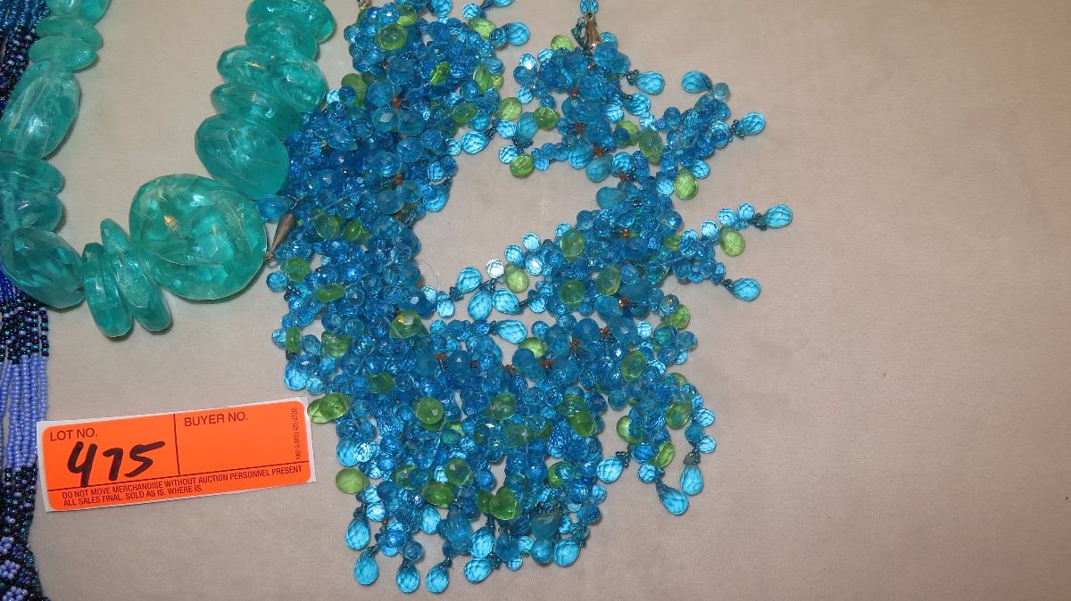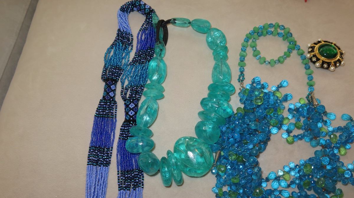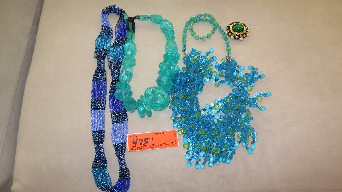 Jewelry: 4 Misc. Aqua/Blue Bead Necklaces (various styles, lengths), Brooch Pin