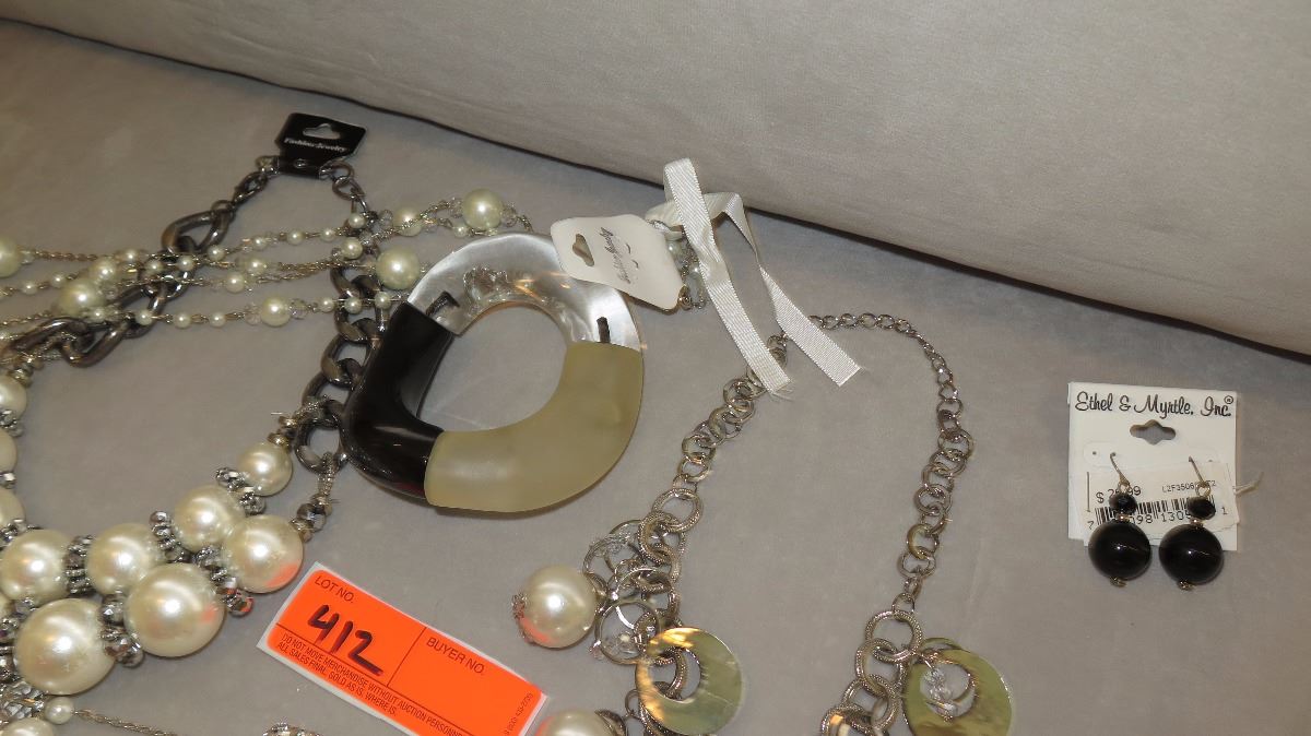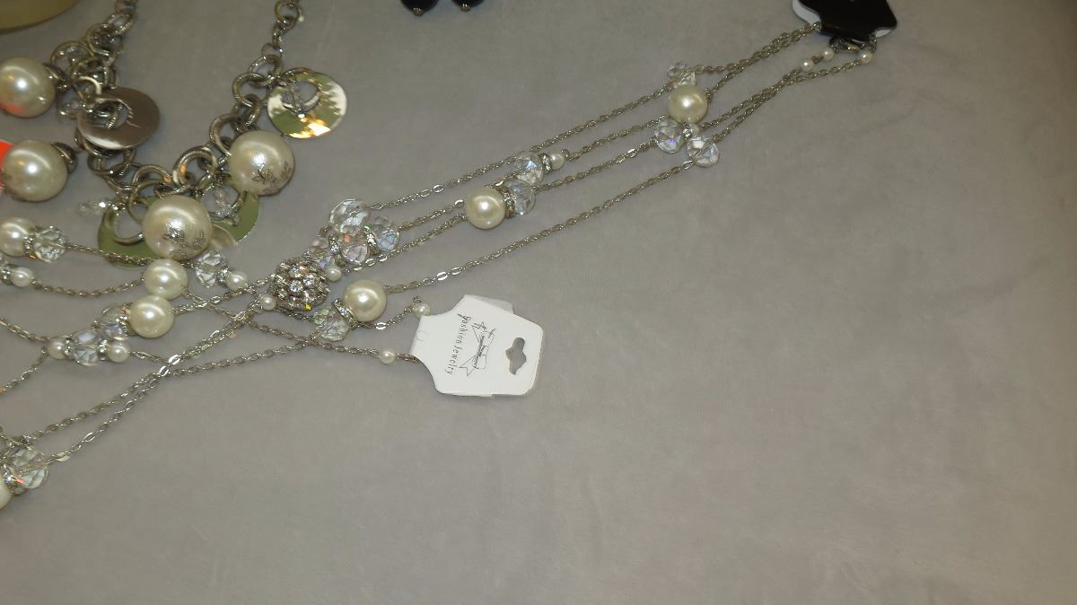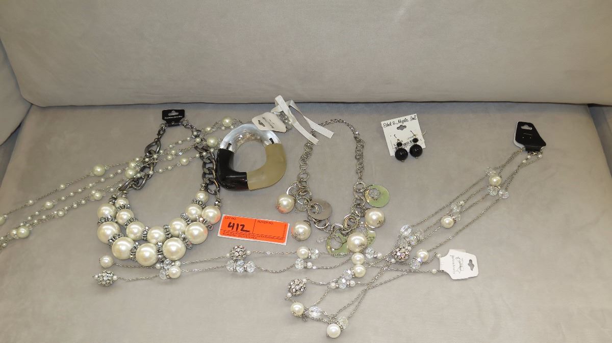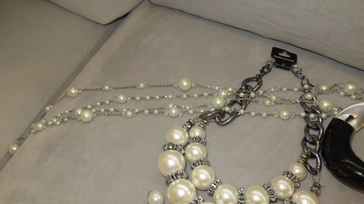Jewelry: 5 White Pearl Necklaces (various styles, lengths), Lucite Bracelet
