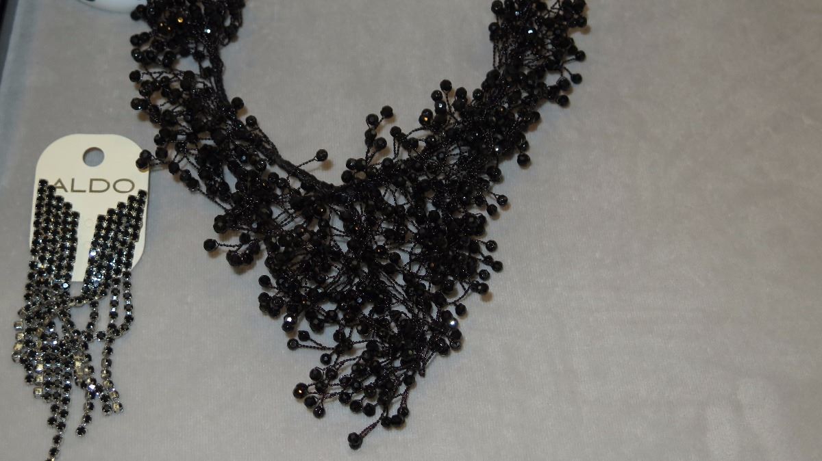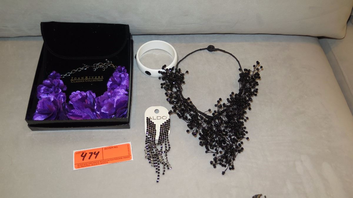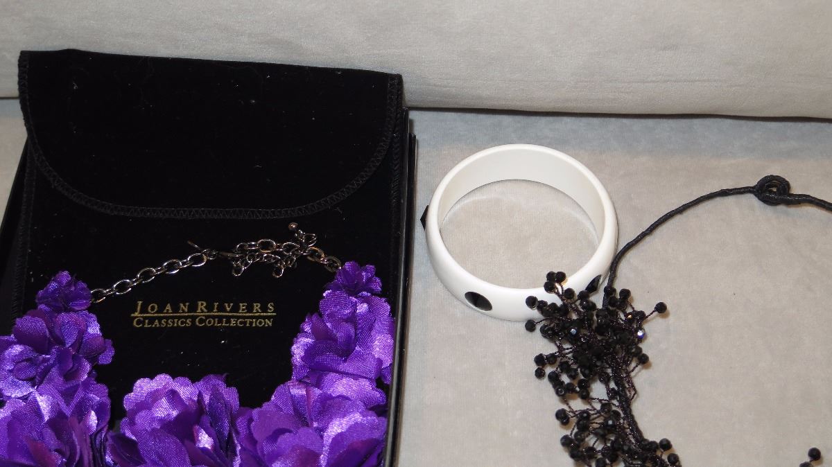 Jewelry: Black Bead Waterfall Necklace, Blk Rhinestone Cascade Earrings, Purple Satin Floral Necklace, Bracelet