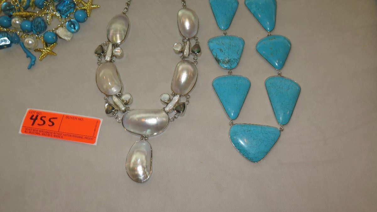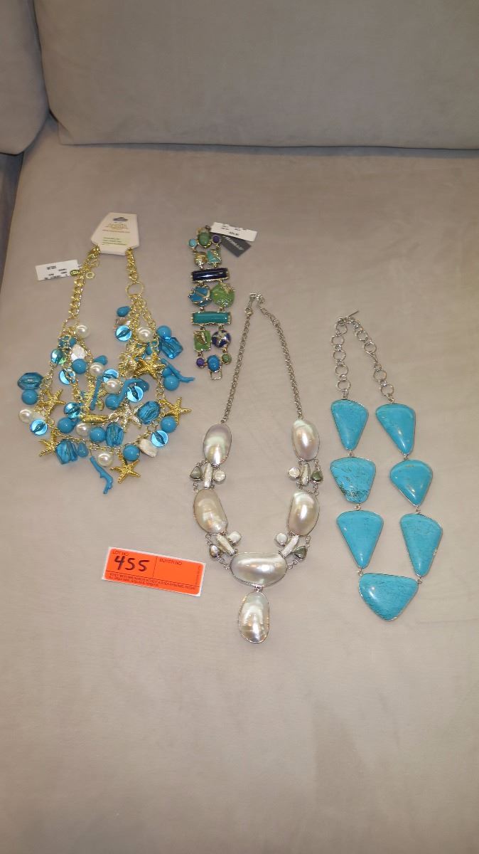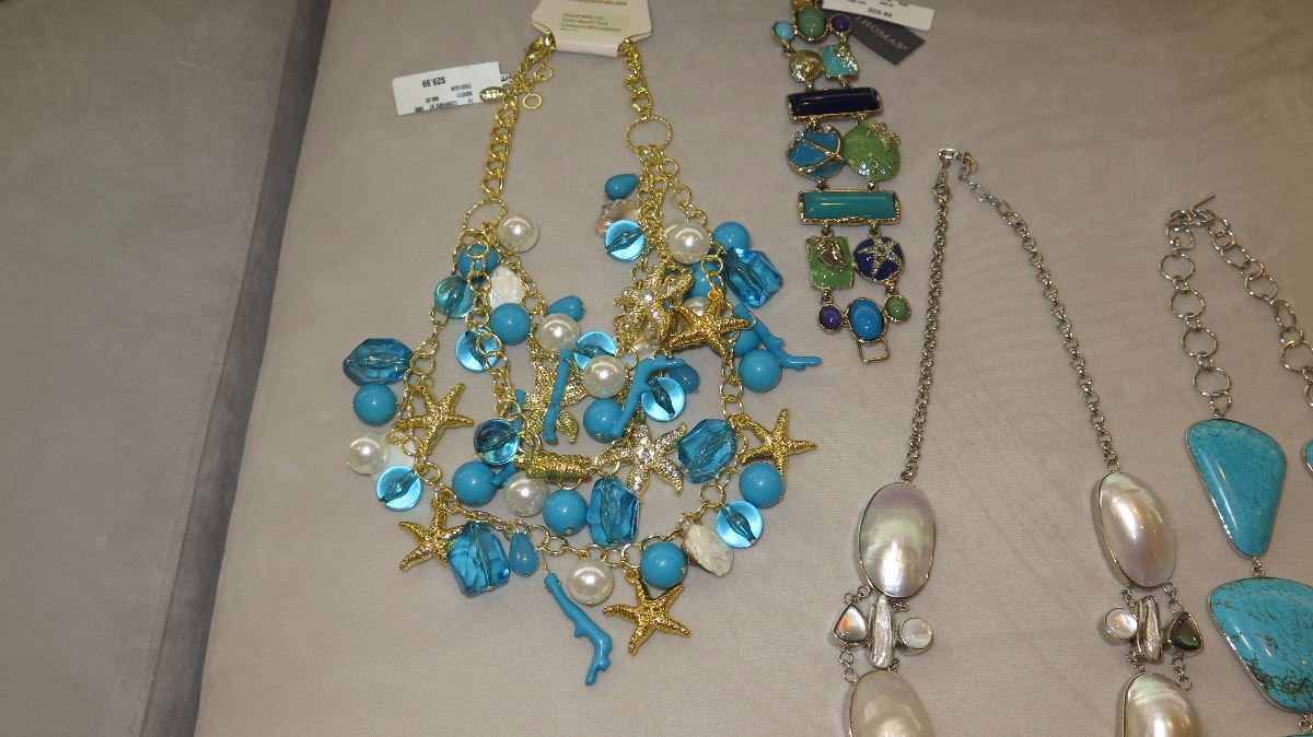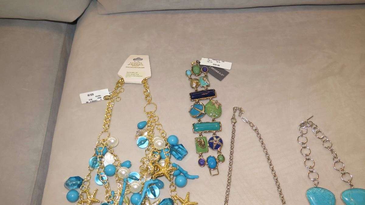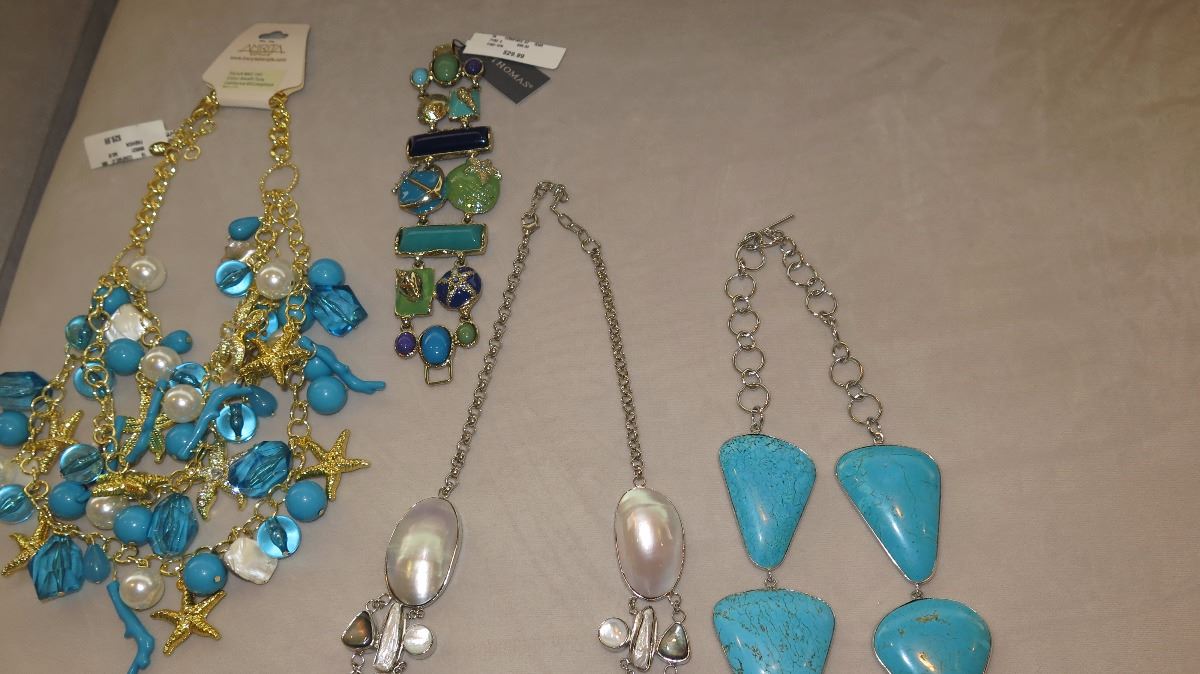 Jewelry: Blue/Gold Tone Seashells Motif Cluster Drape Necklace, Bracelet, 2 Necklaces