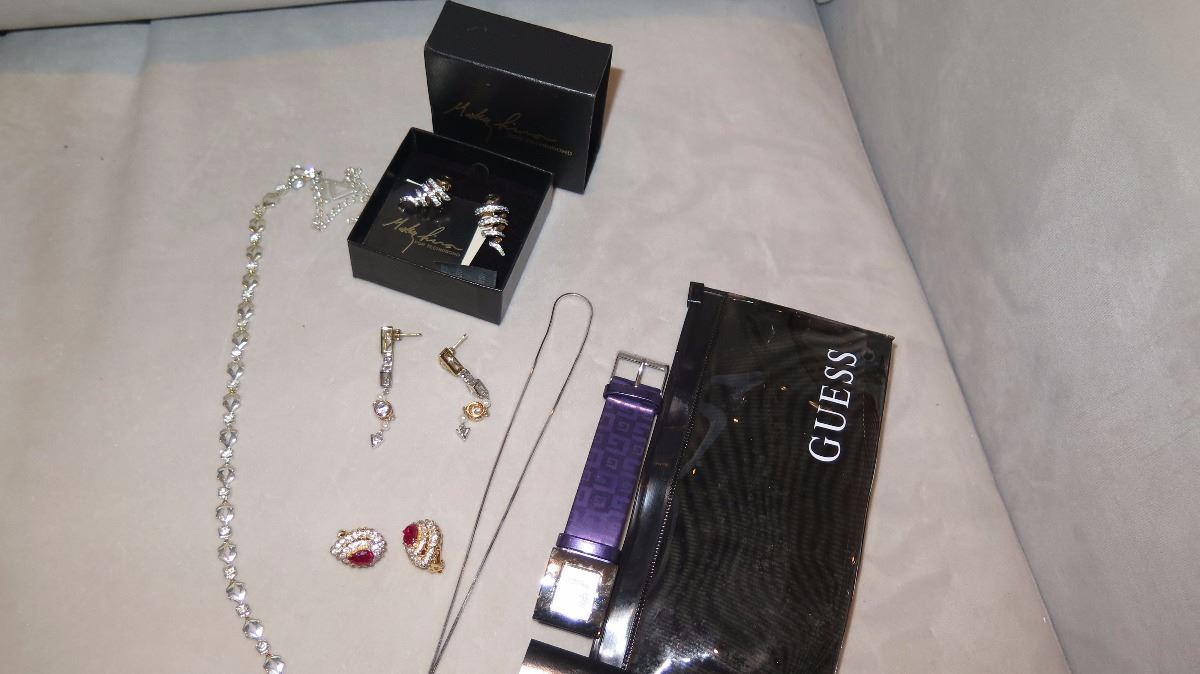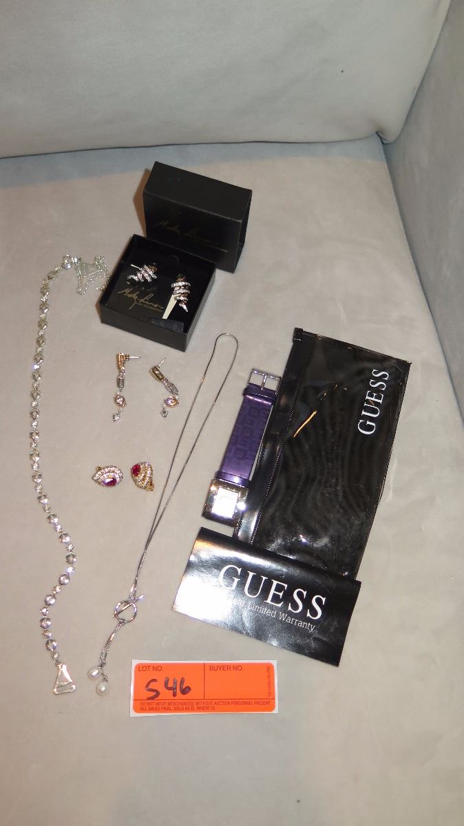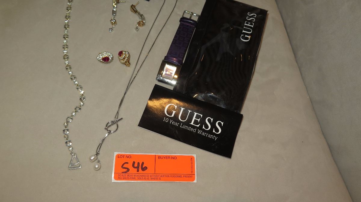 Jewelry: Dangling Pearl Necklace, Bead Necklace, Rhinestone Earrings, Faux Ruby Earrings, Watch