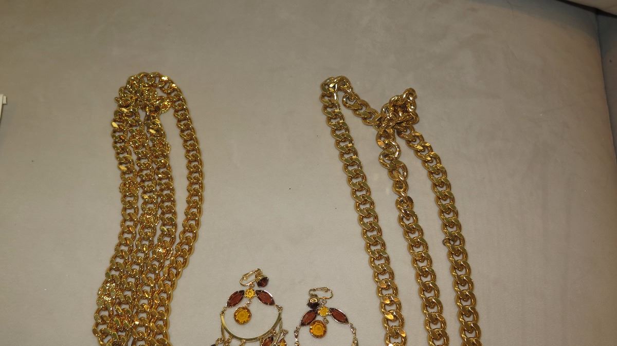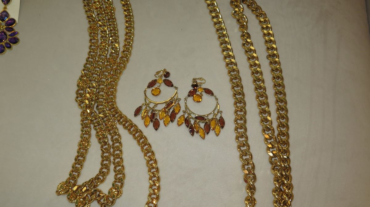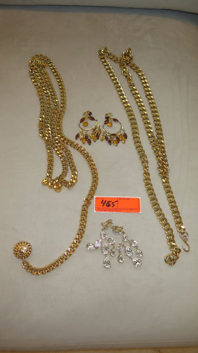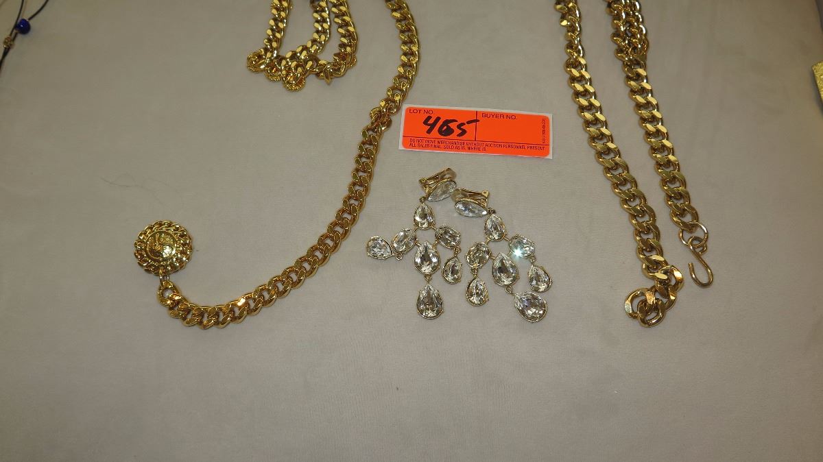 Jewelry: Gold Tone Link Chain Necklace, Belt, 2 Pairs Dangling Earrings