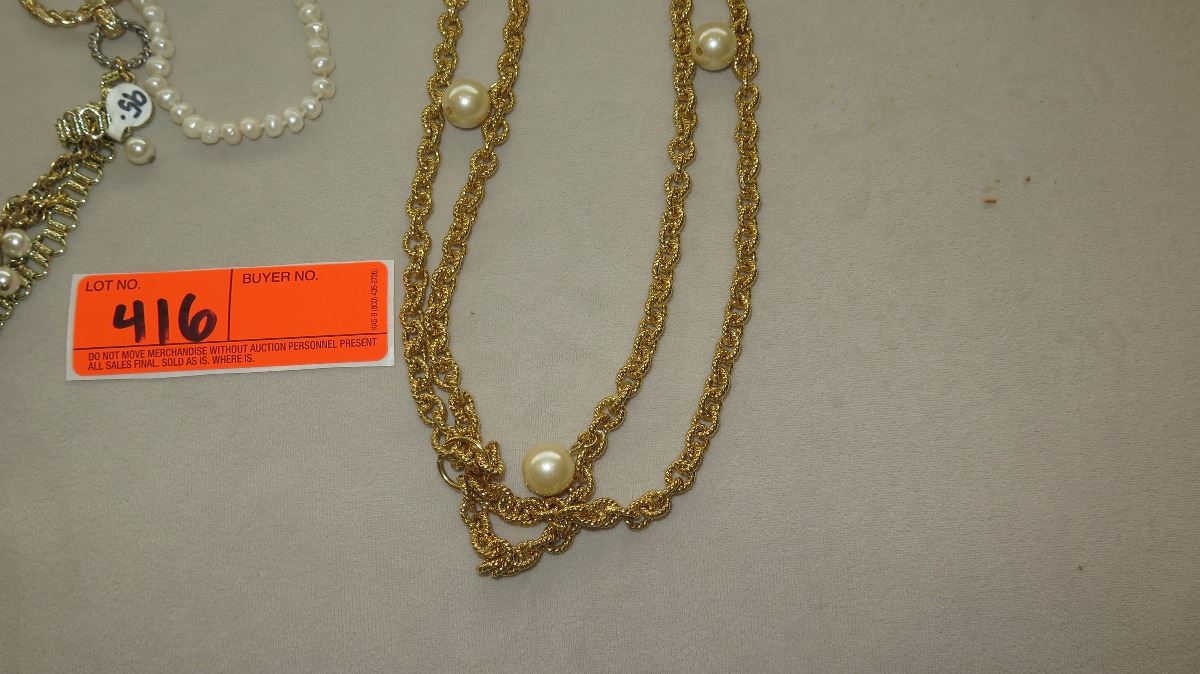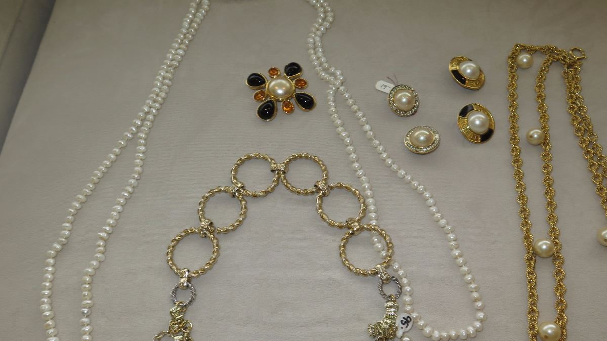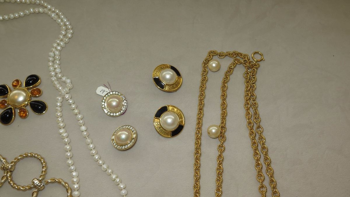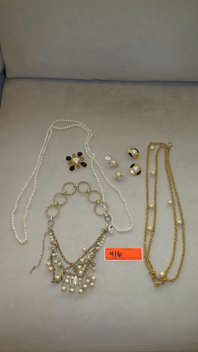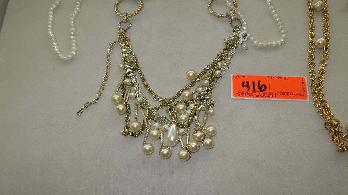 Jewelry: Multi-Strand Drape Necklace w/Dangling Pearls, 2 Misc. Pearl Necklaces, 2 Prs. Pearl Earrings, Brooch Pin