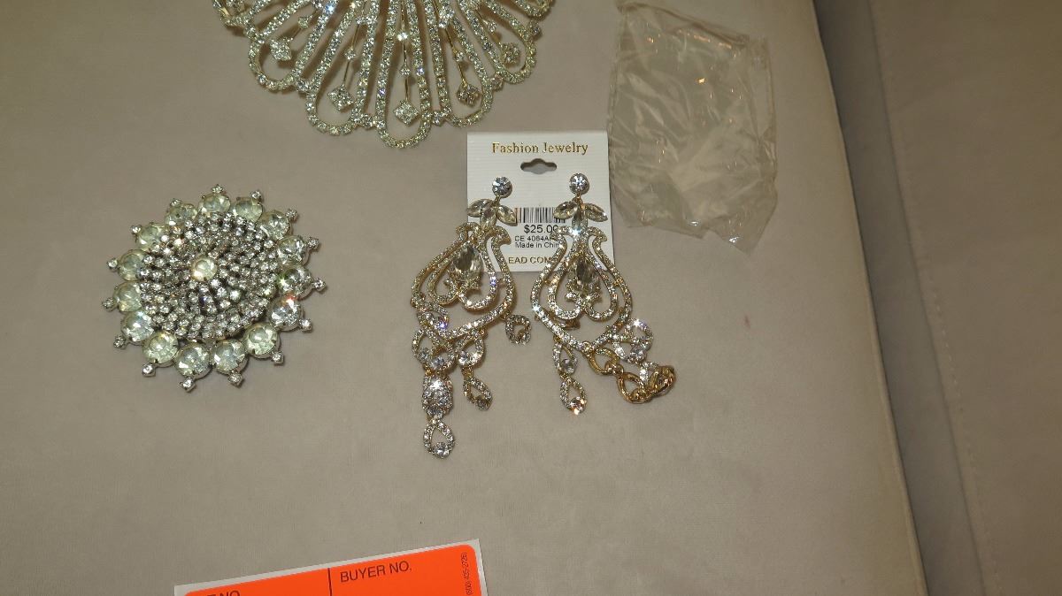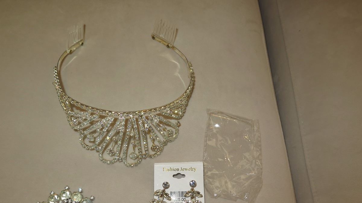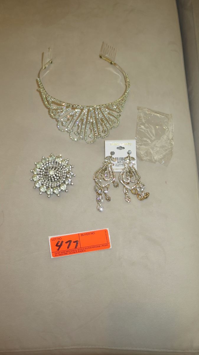 Jewelry: Rhinestone Tiara, Rhinestone Cascade Earrings, Rhinestone Brooch Pin