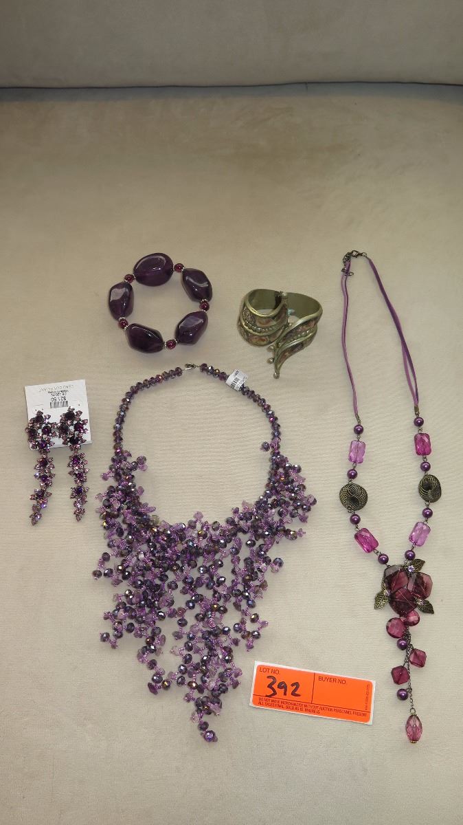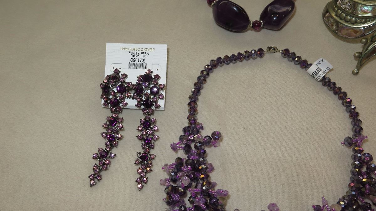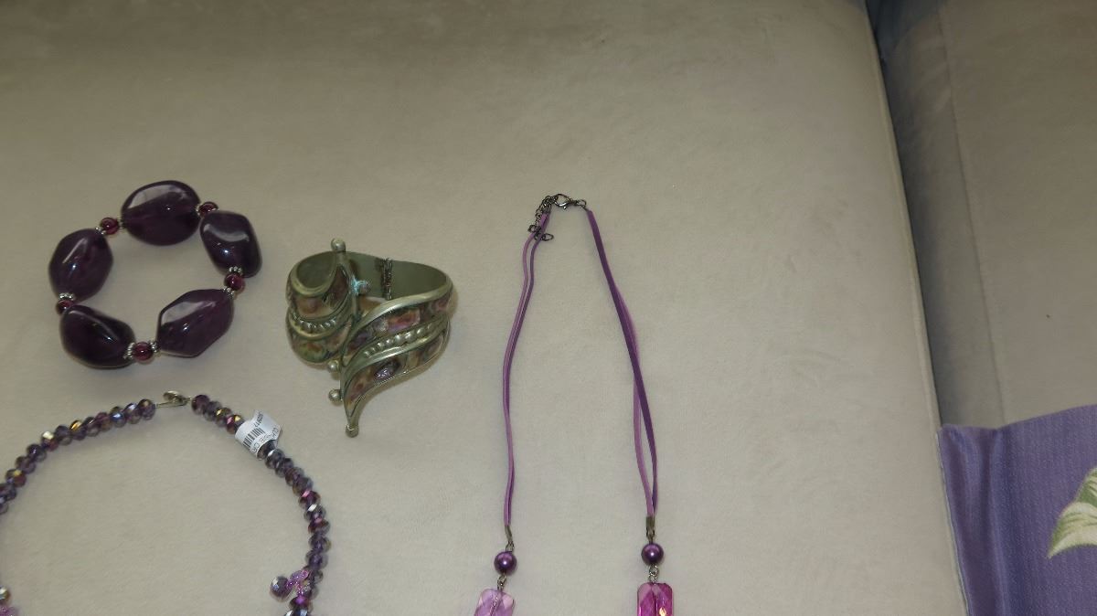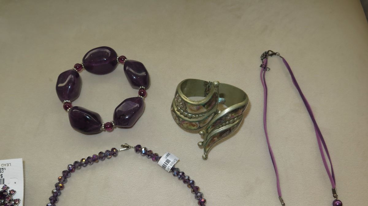 Jewelry: Violet Beaded Waterfall Drape Necklace, Purple Rhinestone Earrings, Dangle Necklace, 2 Bracelets,