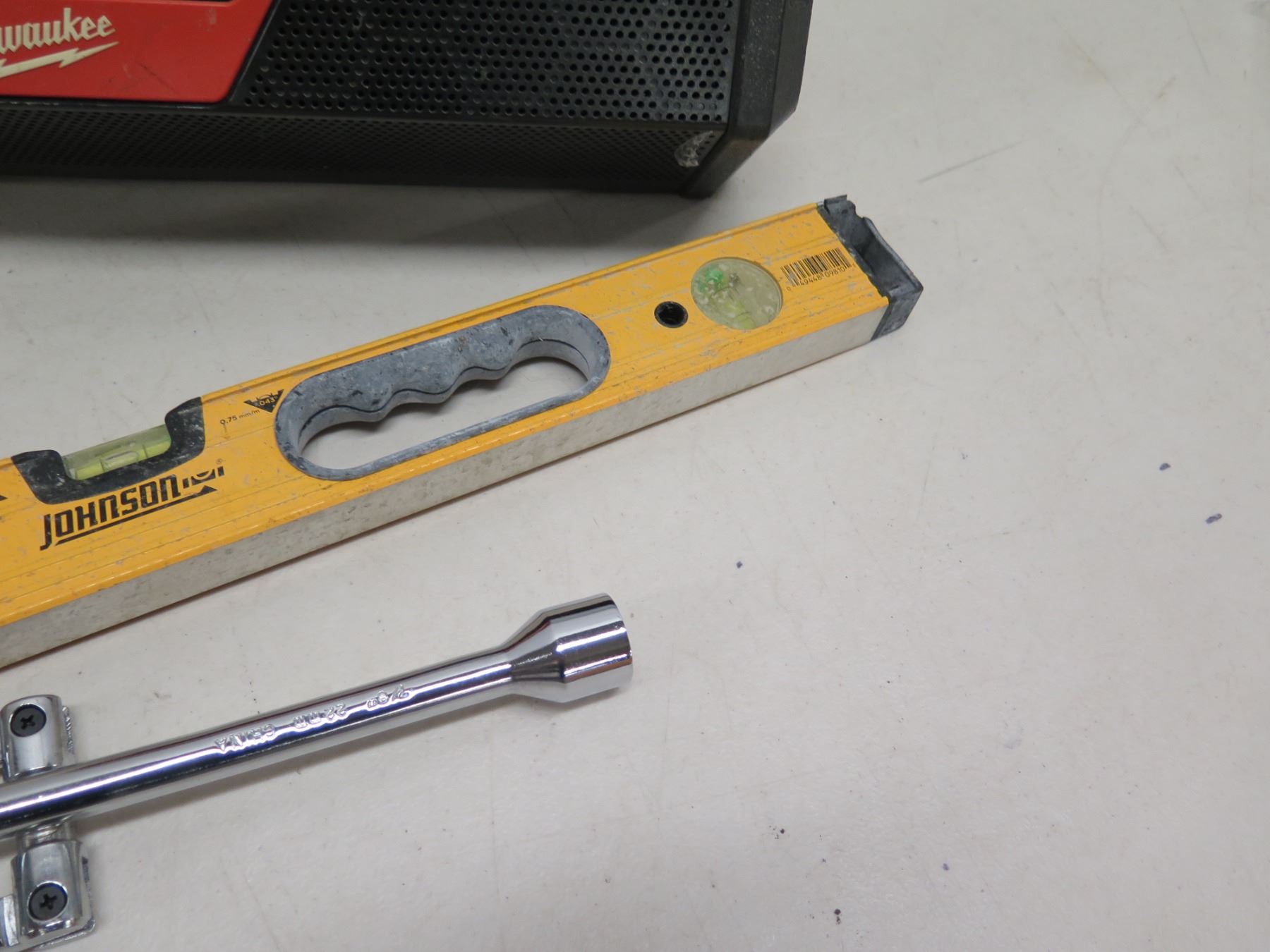 Johnson Level, DeWalt Battery, Tire Irons & Milwaukee Jobsite Speaker