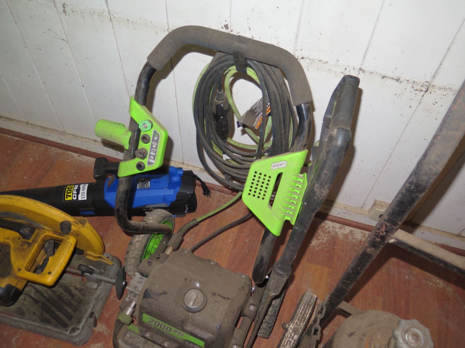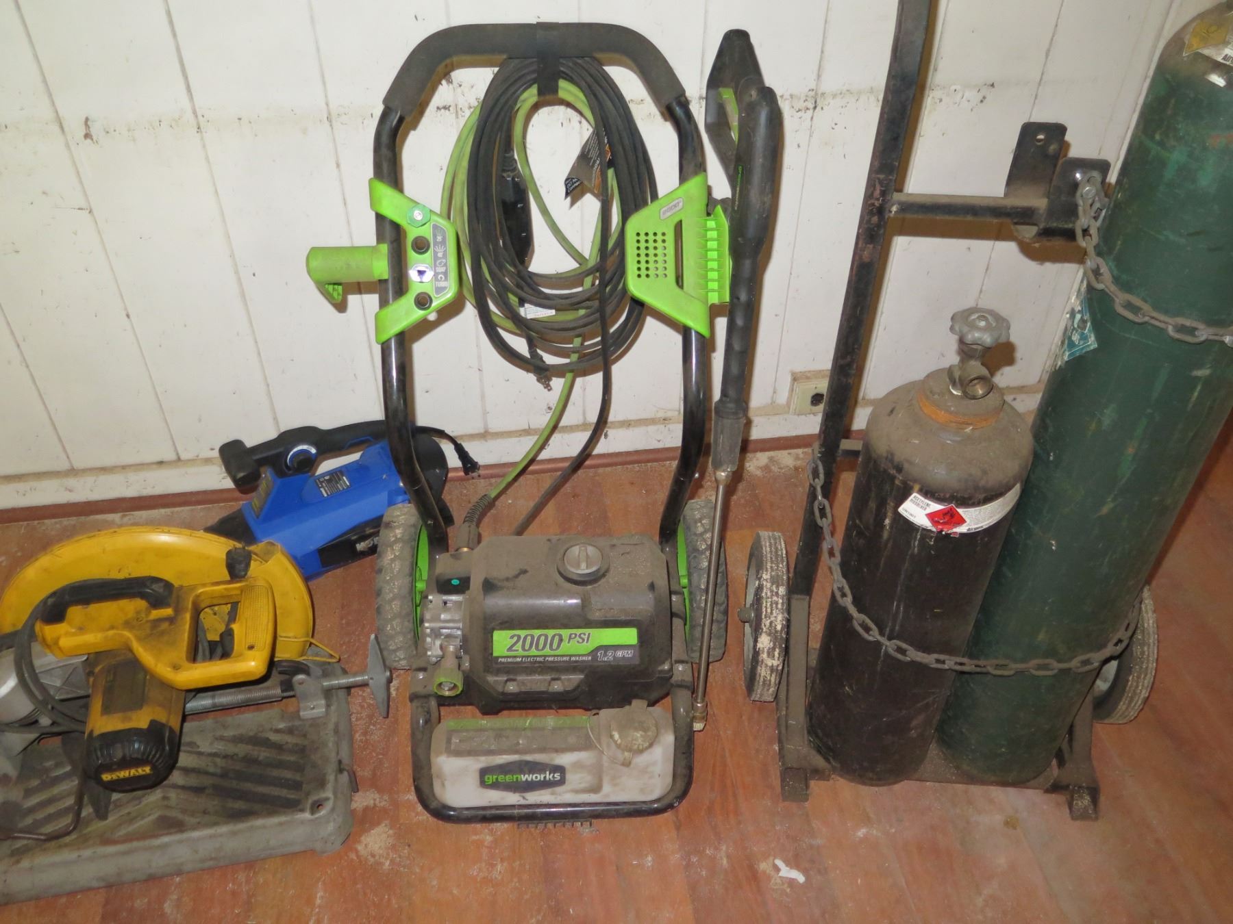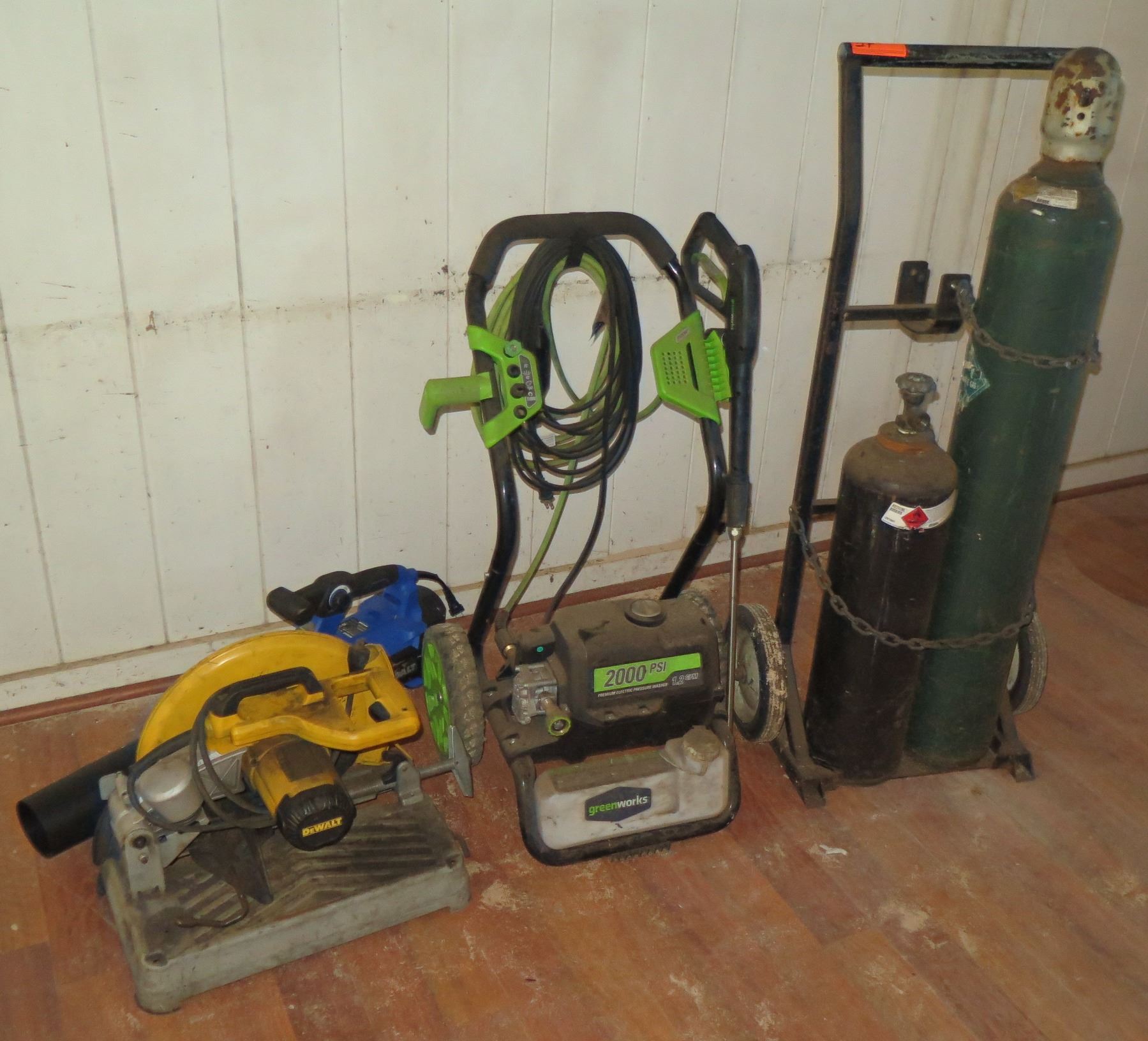 DeWalt D28715 Chop Saw, GreenWorks 2000 PSI Pressure Washer, Tanks, Blower, etc. All are untested. Sold as is. These are in Kailua.