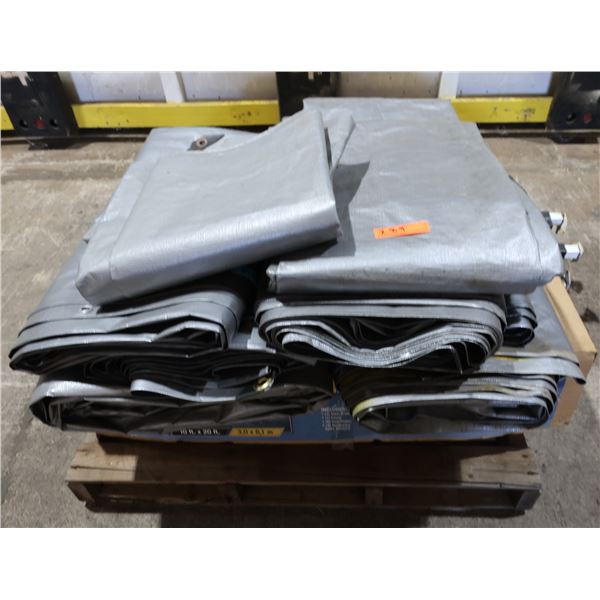 Contents of Pallet: Multiple Gray Tarps, Tent in Black Case, ShelterLogic Tent Canopy, etc