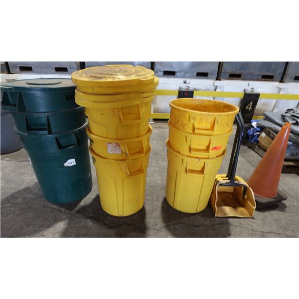 Multiple Brute Waste Cans, Dustpans & Orange Safety Cones