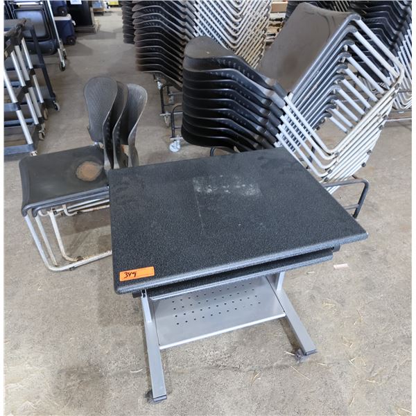 Metal Desk w/ Stone Top & Approx. 13 Stacking Plastic Chairs