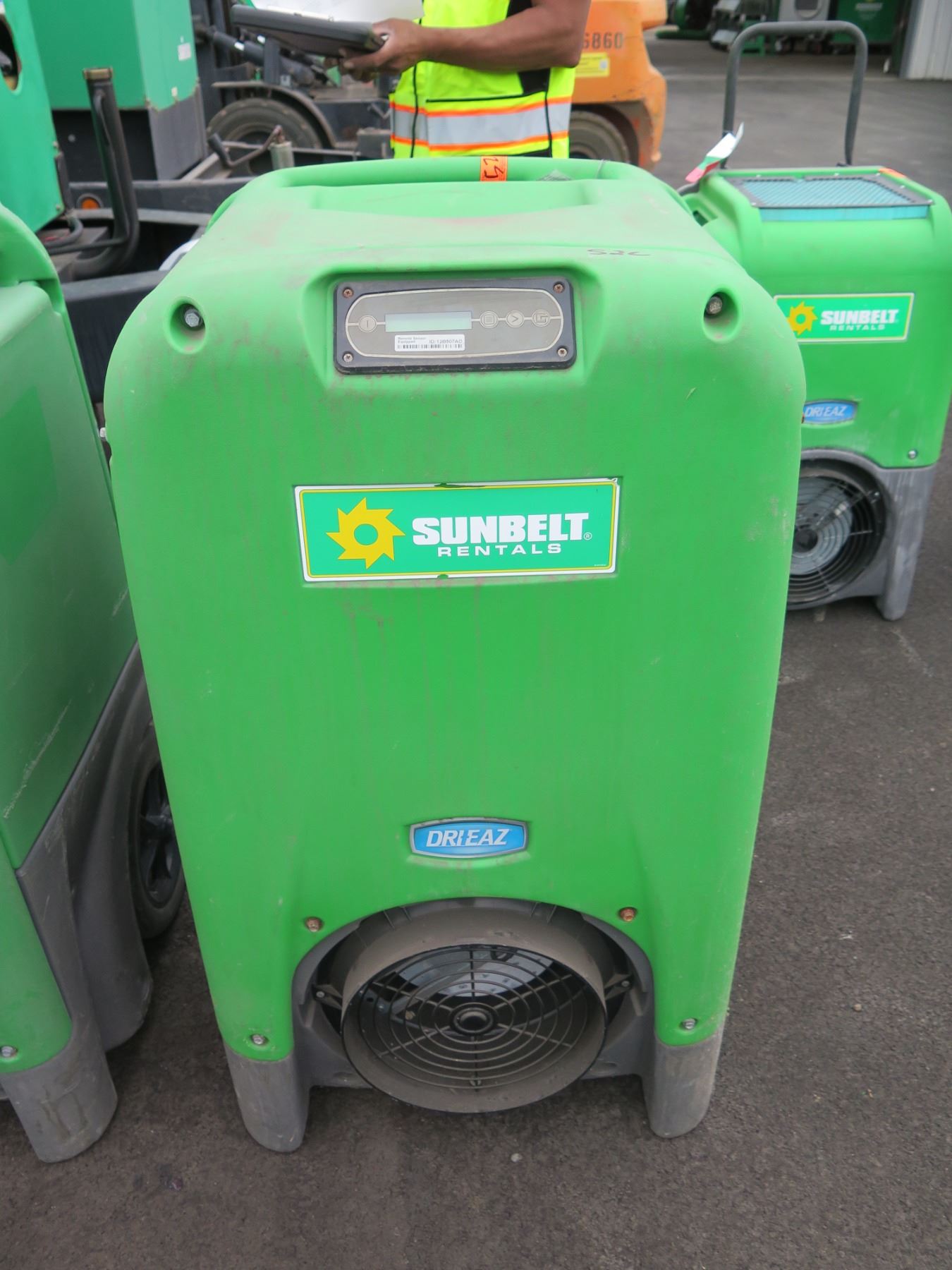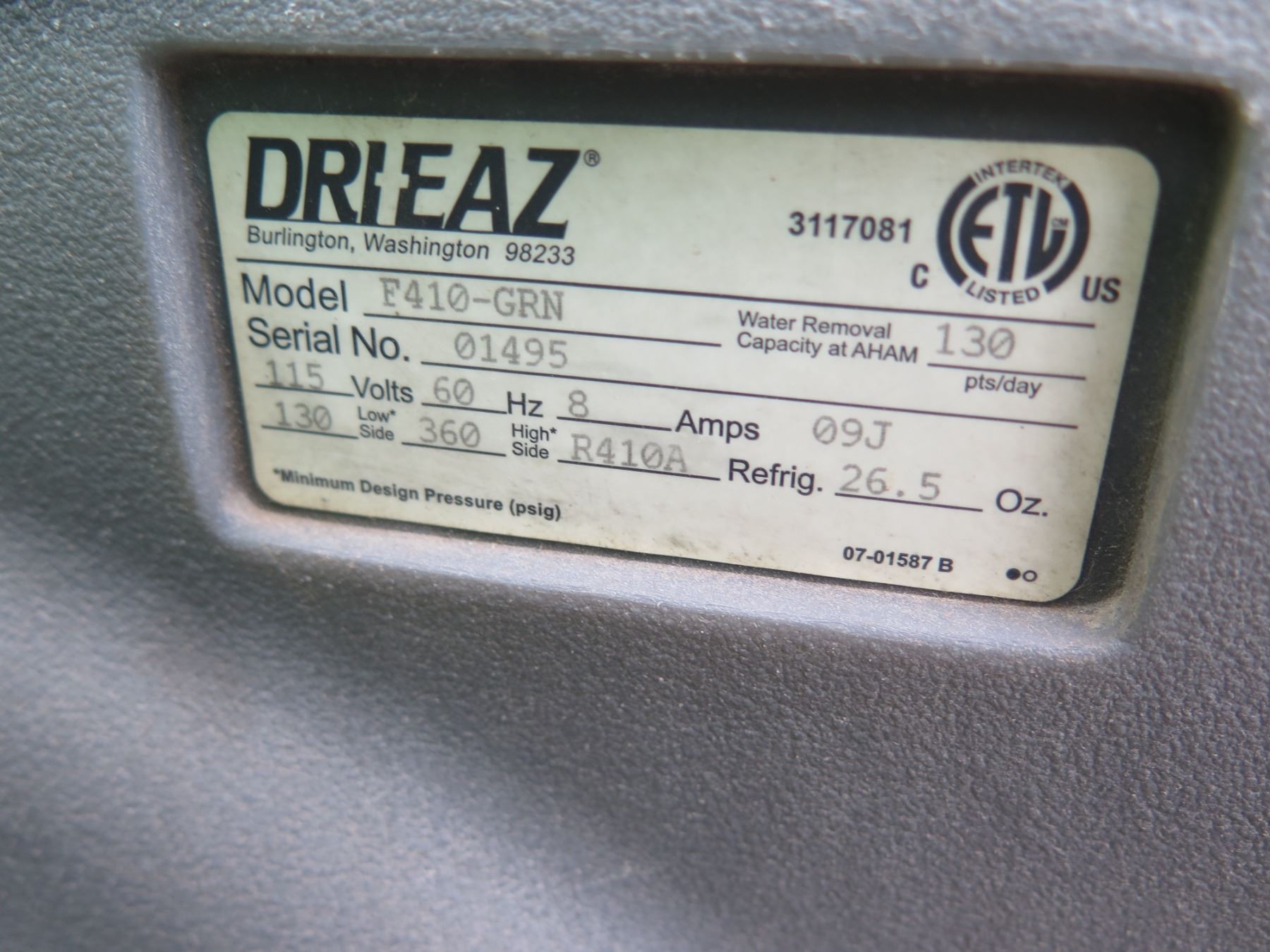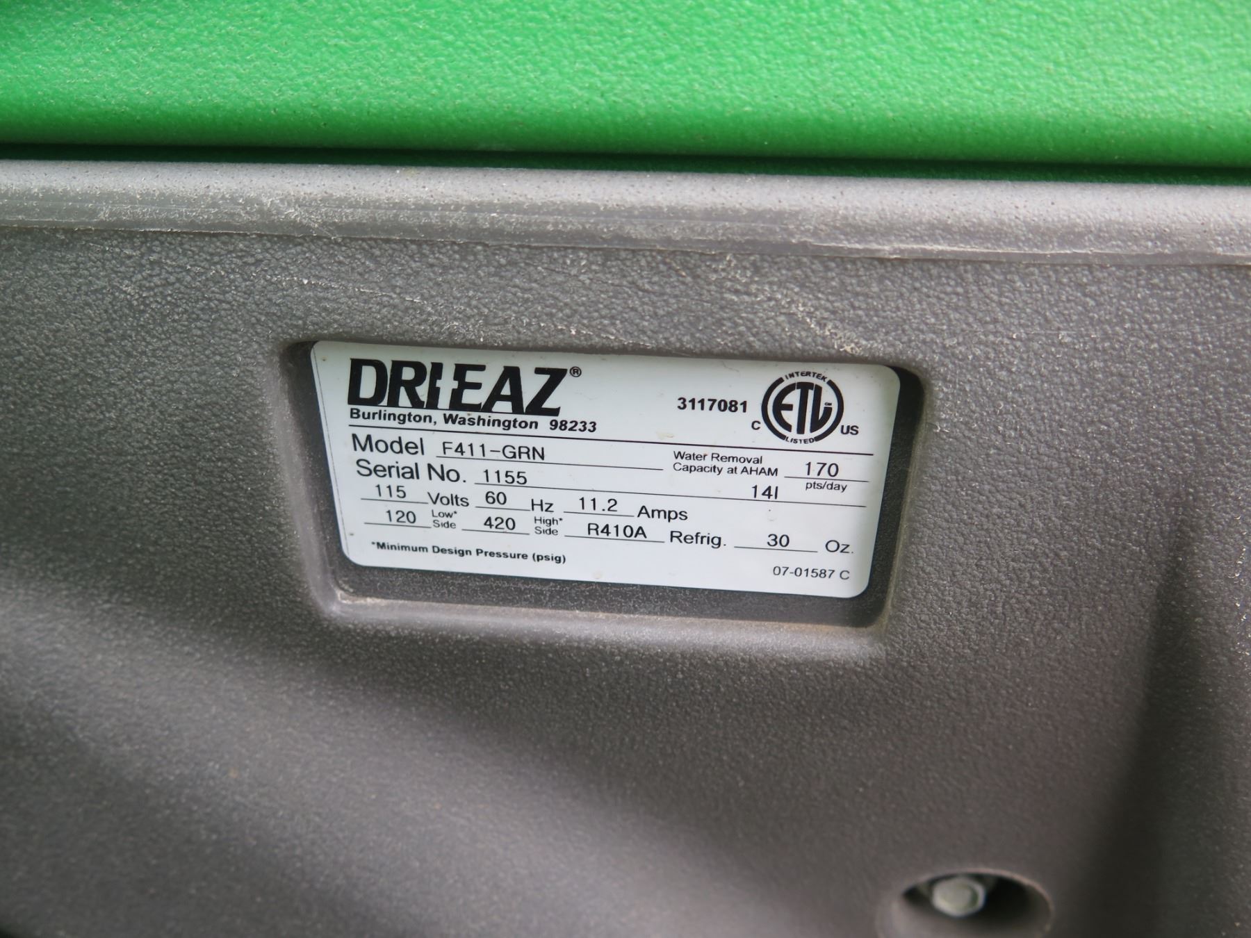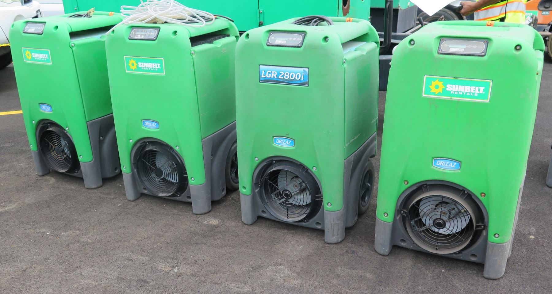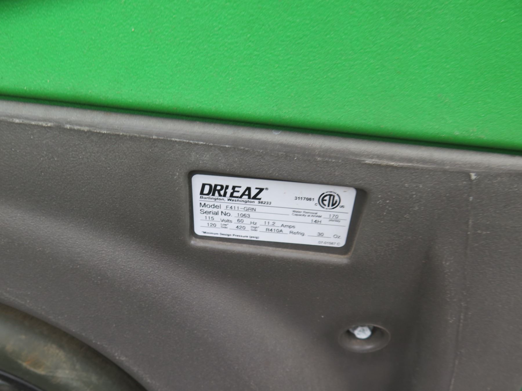 Qty 4 Dri-EAZ Industrial Dehumidifiers: 2 @ model F210-GRN & 2 F411-GRN, Needs Repair. Seller reports that these turn on and have the appearance of working, but do not seem to remove moisture out of the air efficiently after running for 45 minutes to an hour.