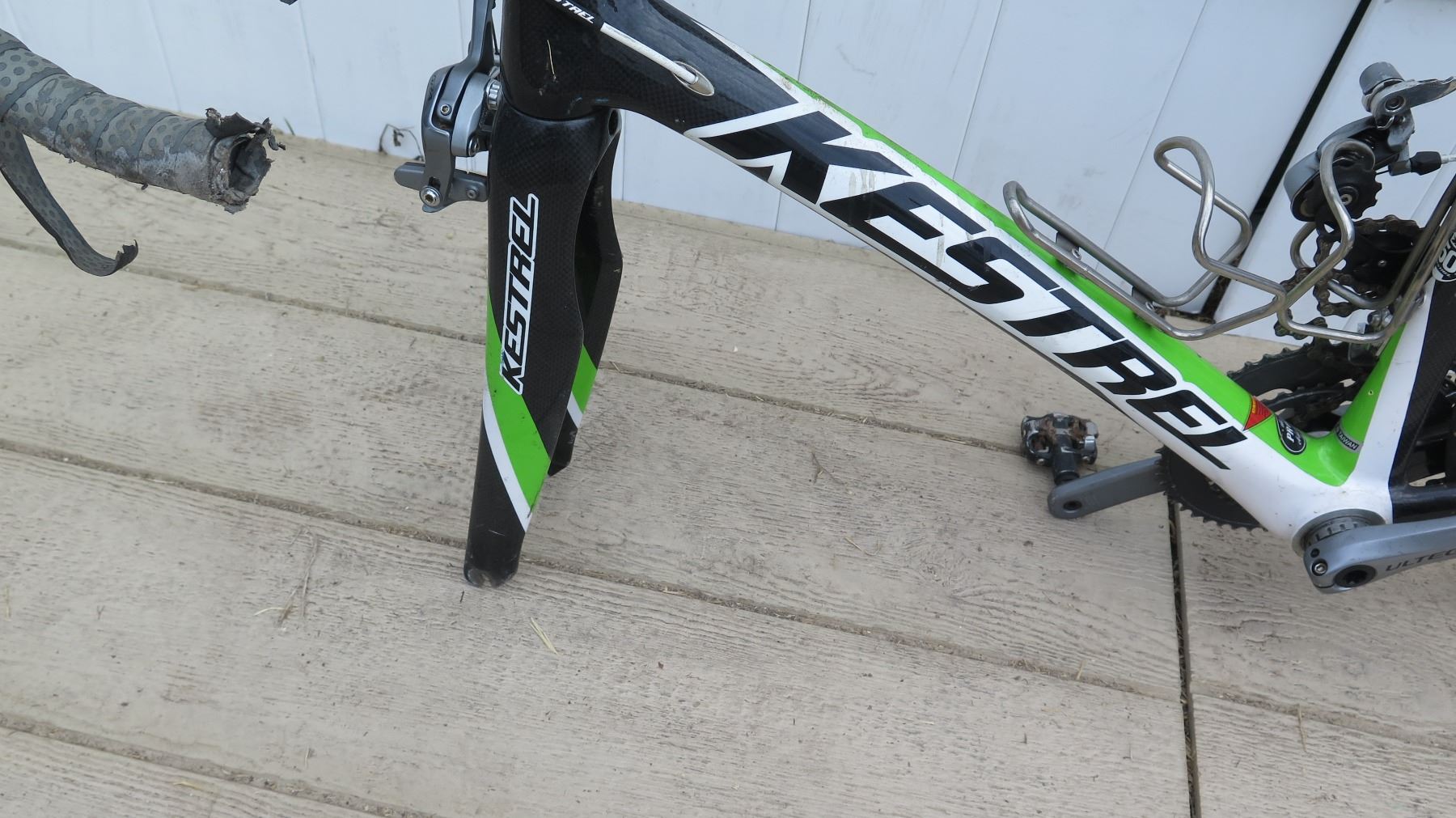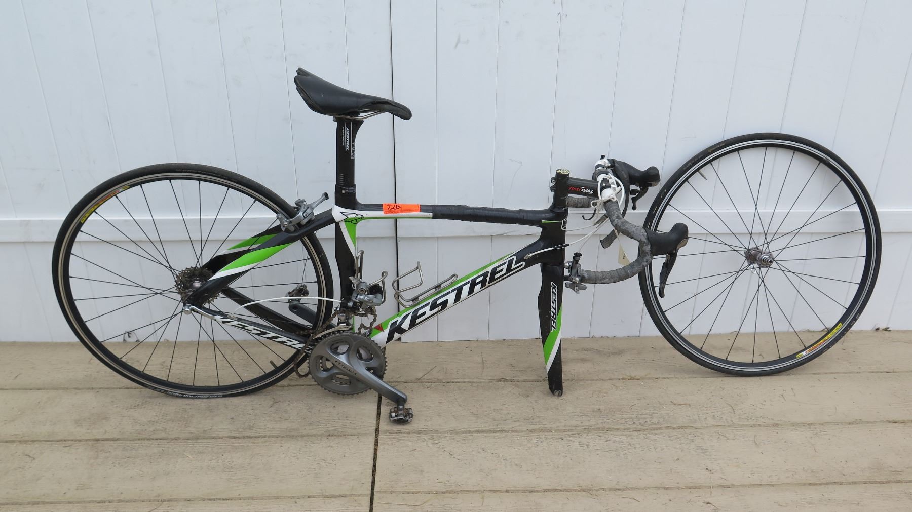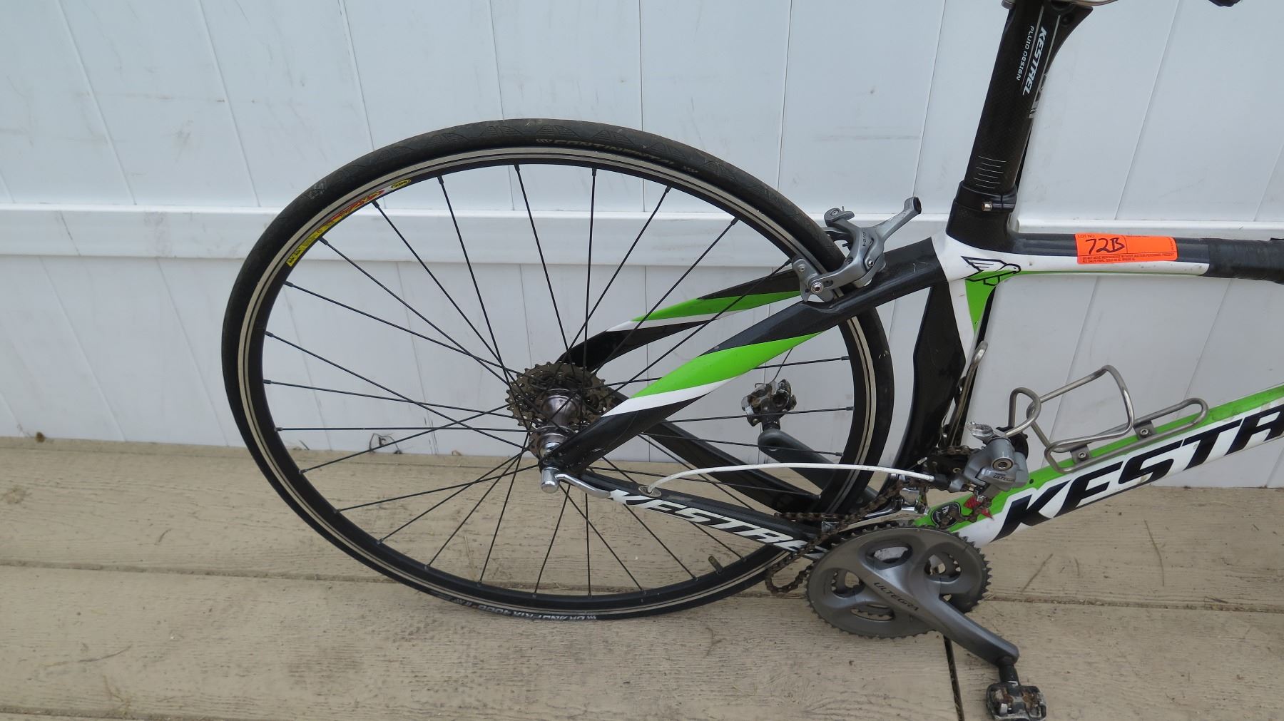 Kestrel Black Green Men's Bike w/ Front Wheel Removed.