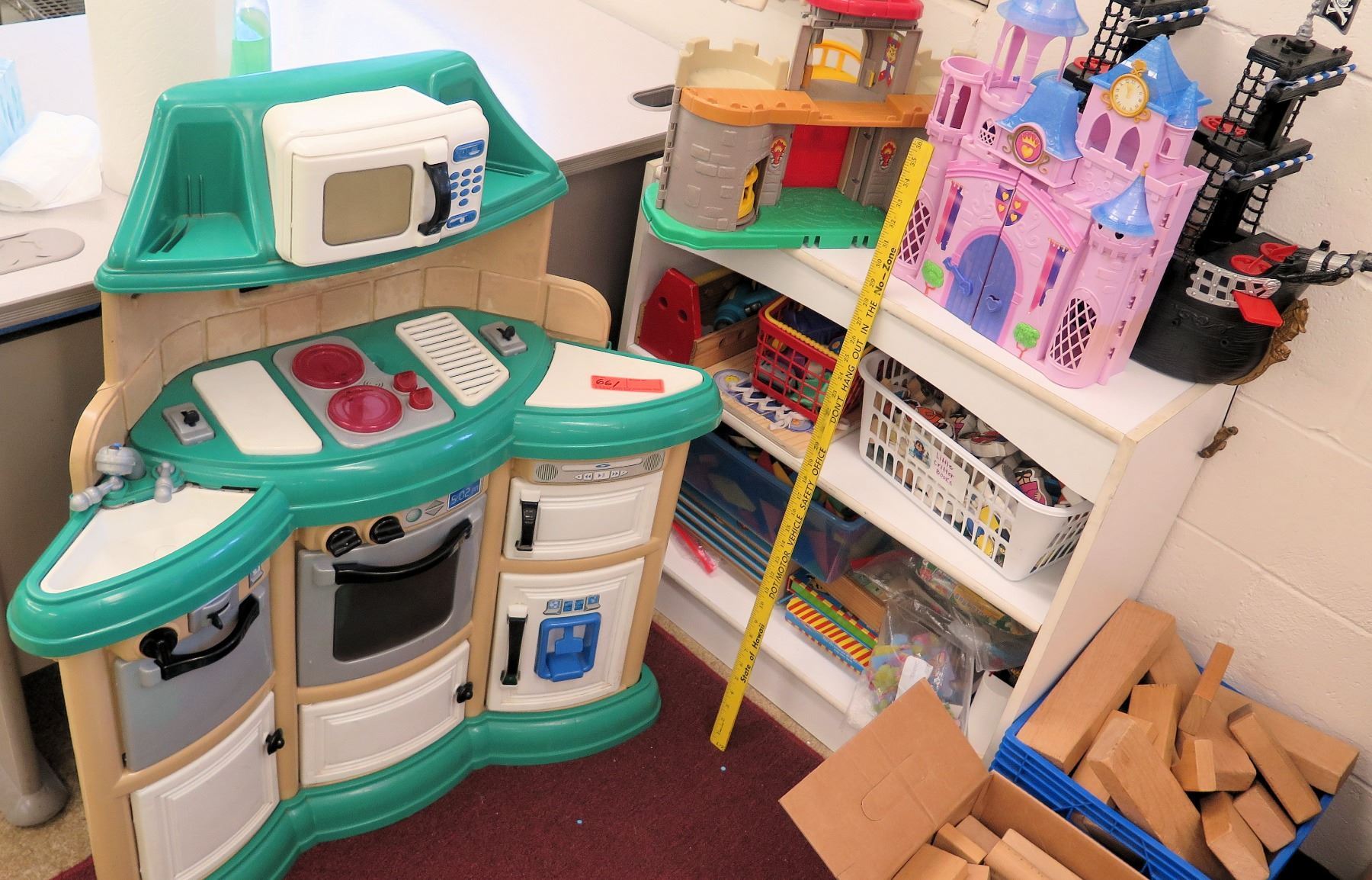 Kid's Play Kitchen, Shelf w/ Toys, Castles, etc
