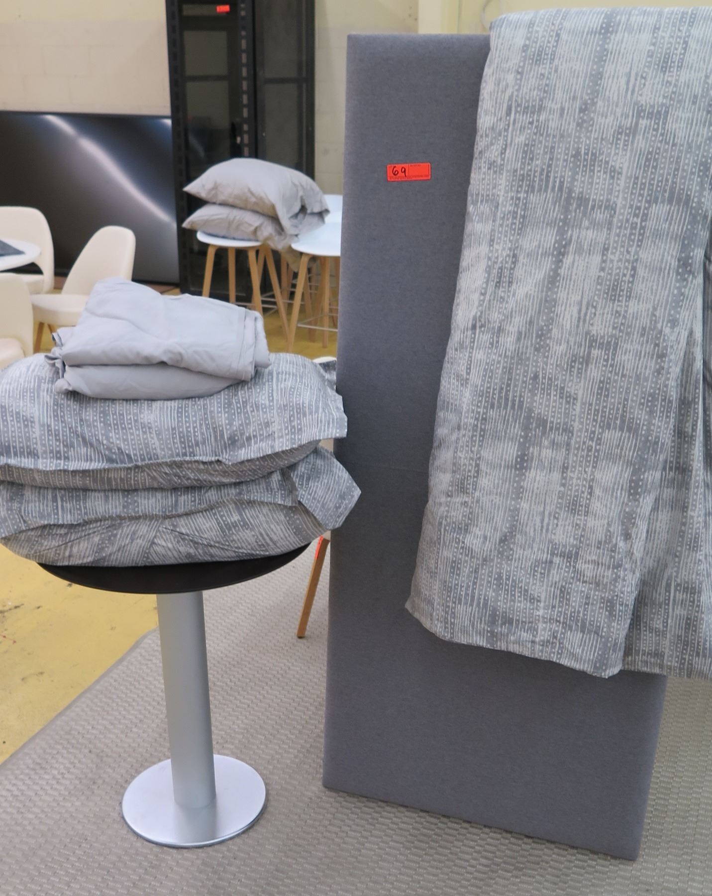 King Size Duvet w/Insert, 2 Pillows, Fitted Sheet, Flat Sheet (one pillow cover is damaged), was used for staging