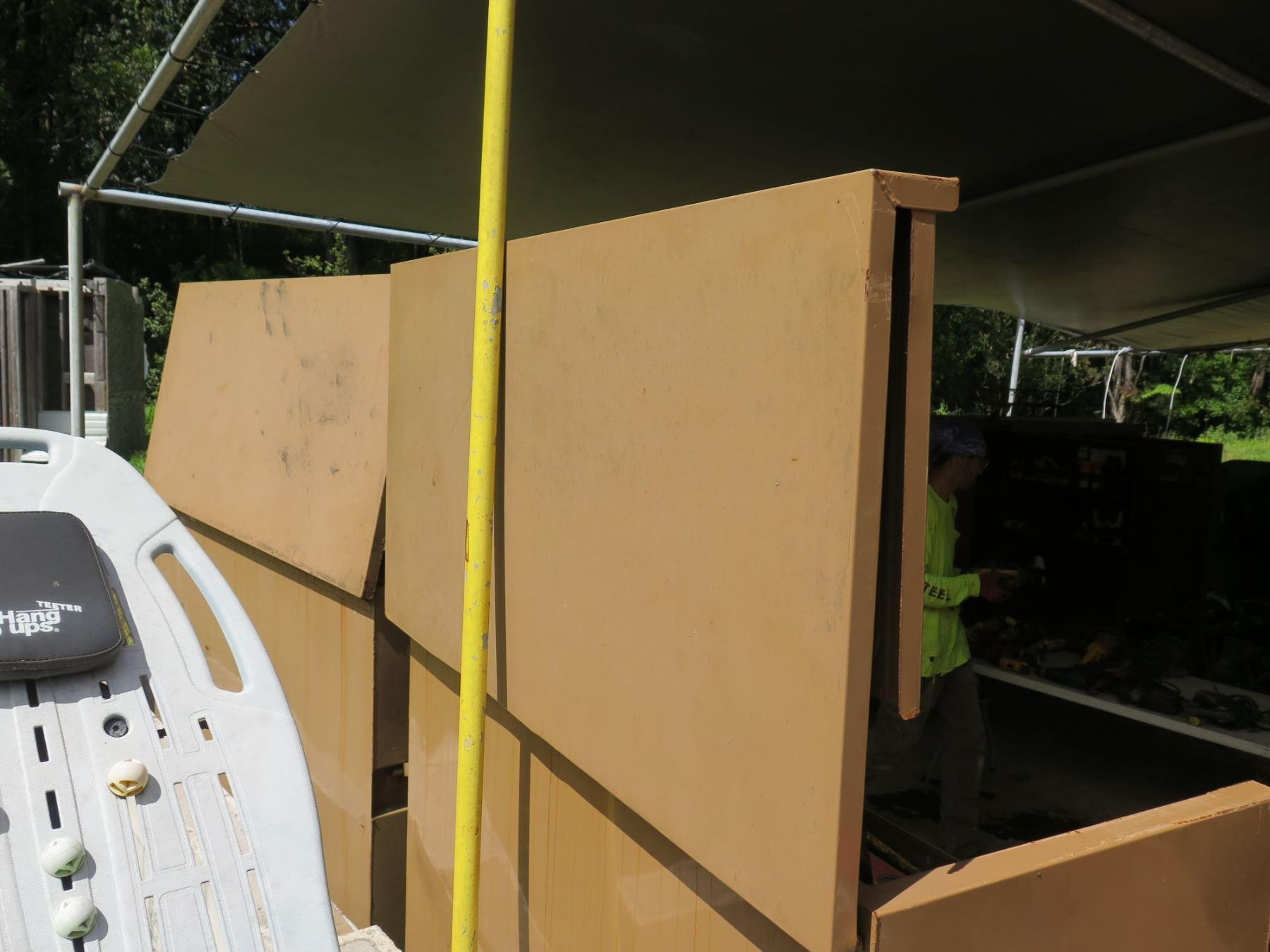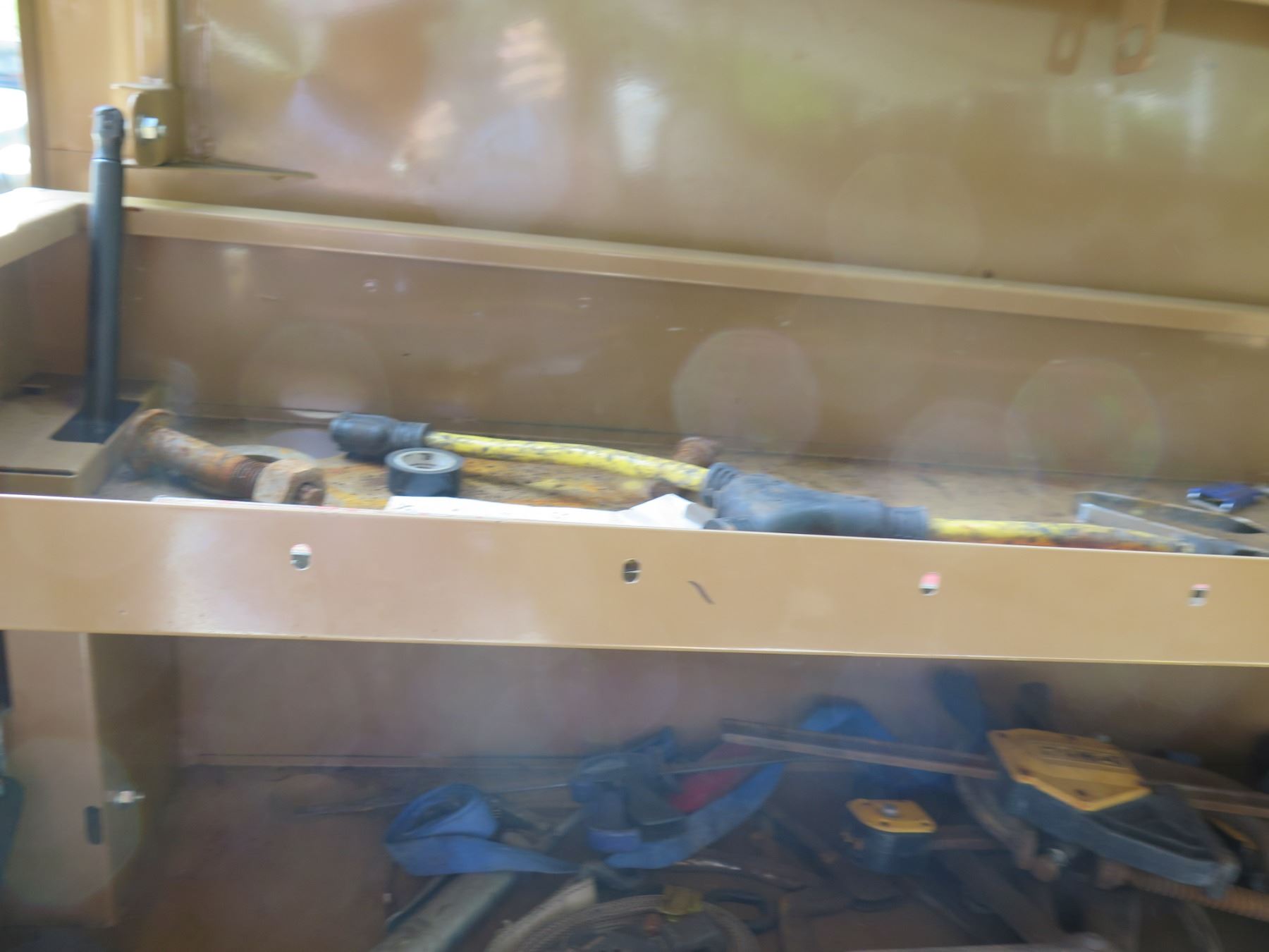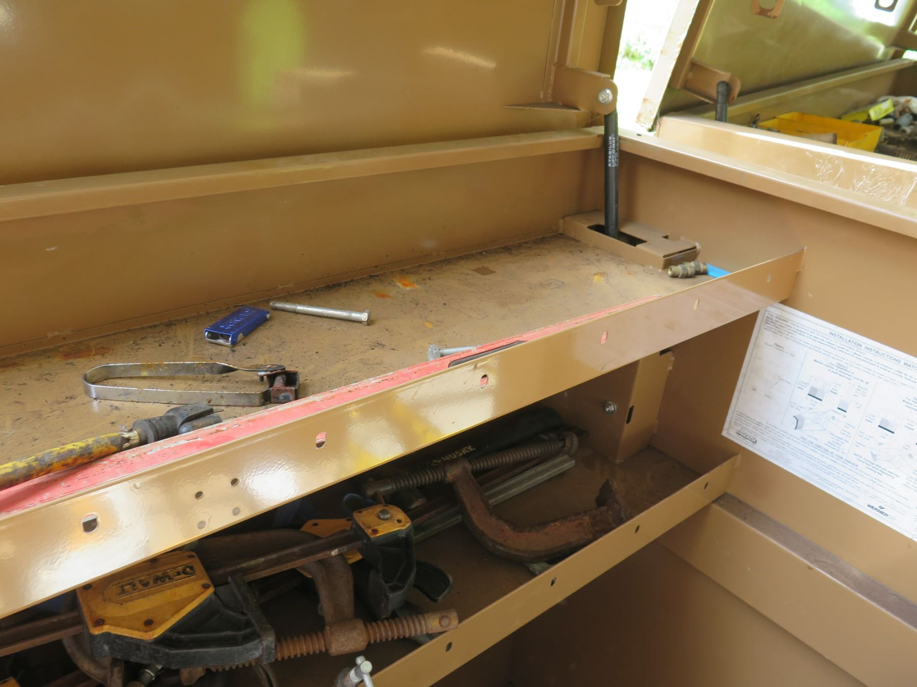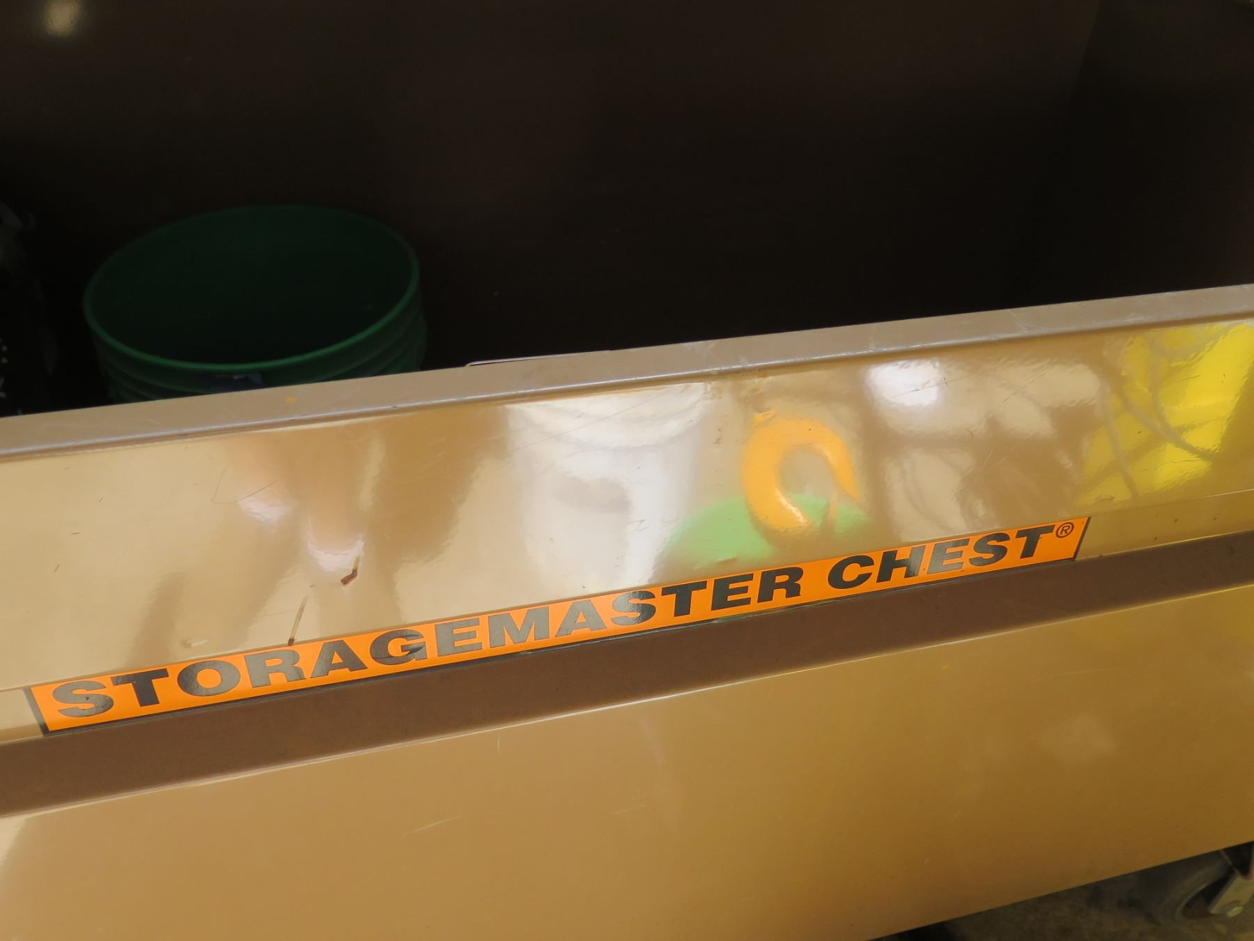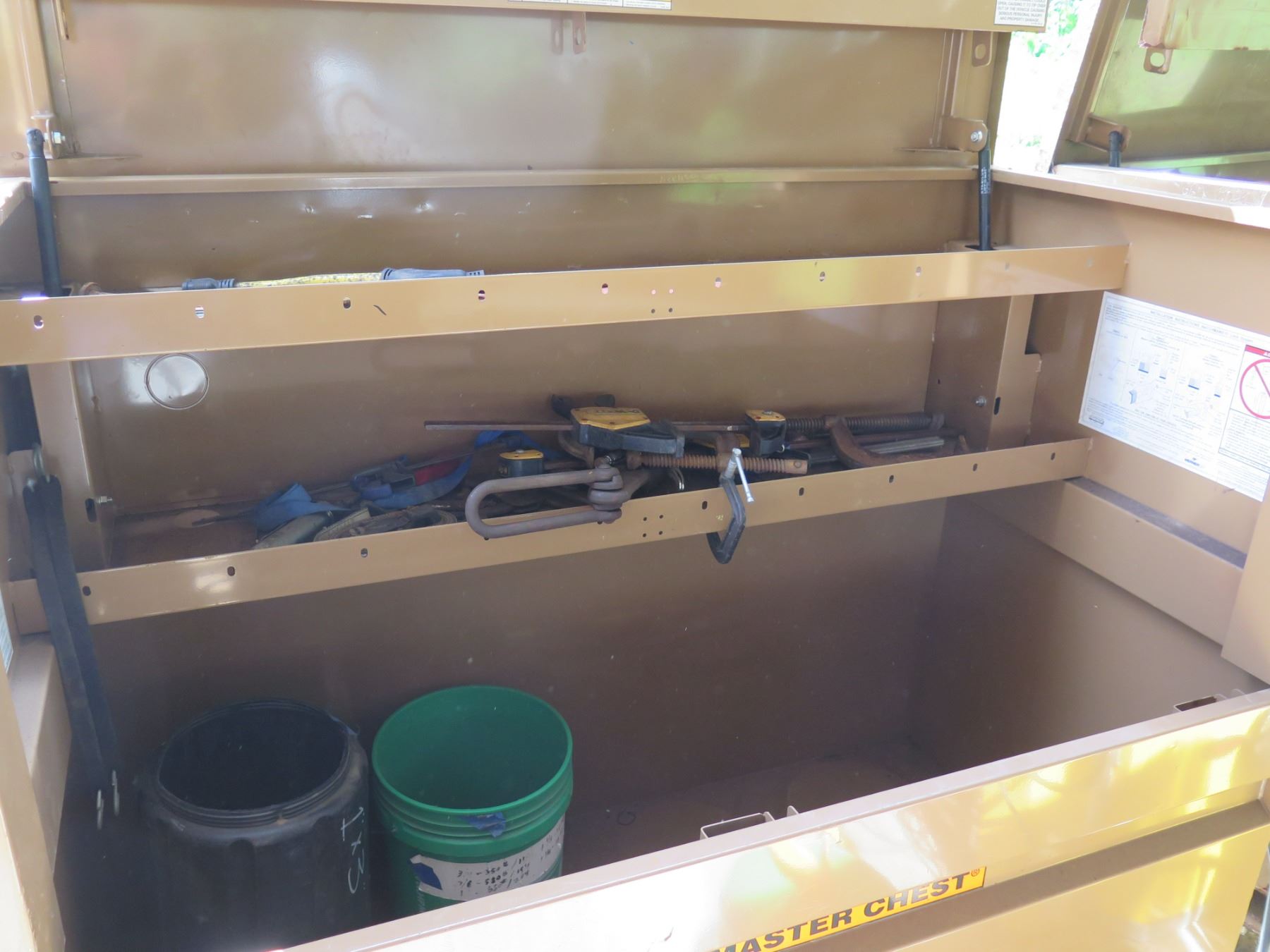 Knaack Storagemaster Rolling Chest Toolbox w/ Contents: Tools, Clamps, etc. Lid does not remain in the "up" position when opened. Shock may need to be repaired to enable it to stay up when opened.