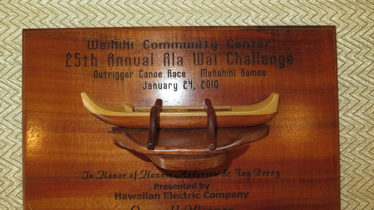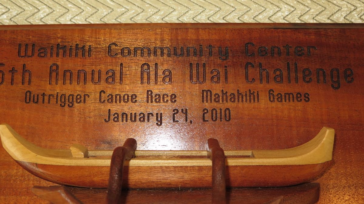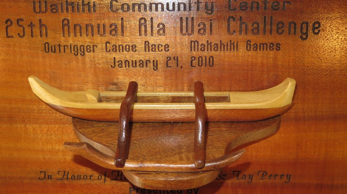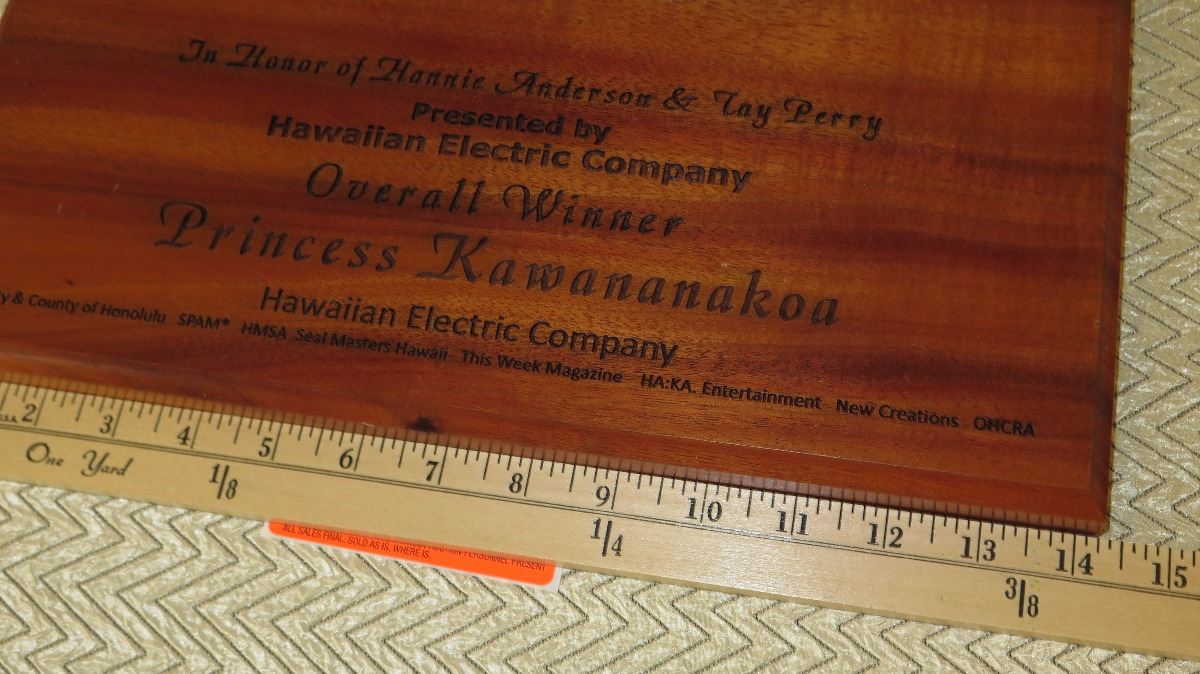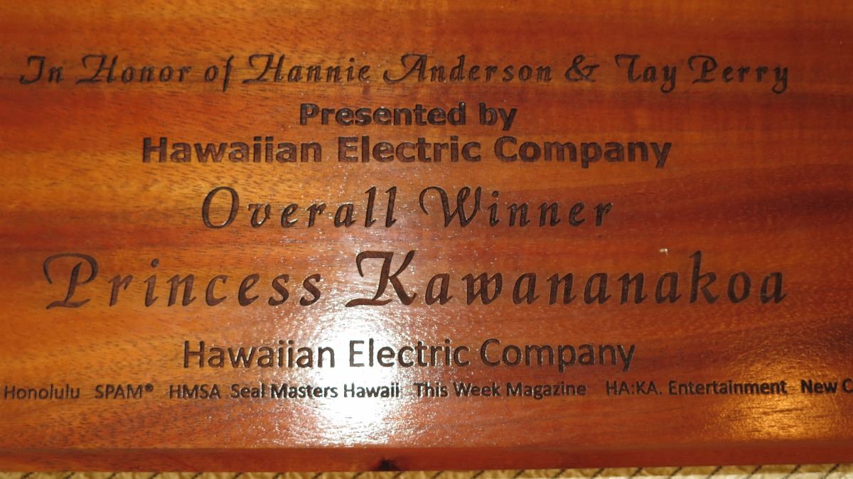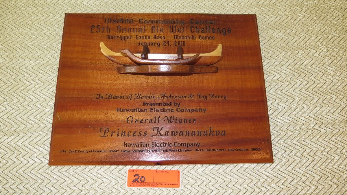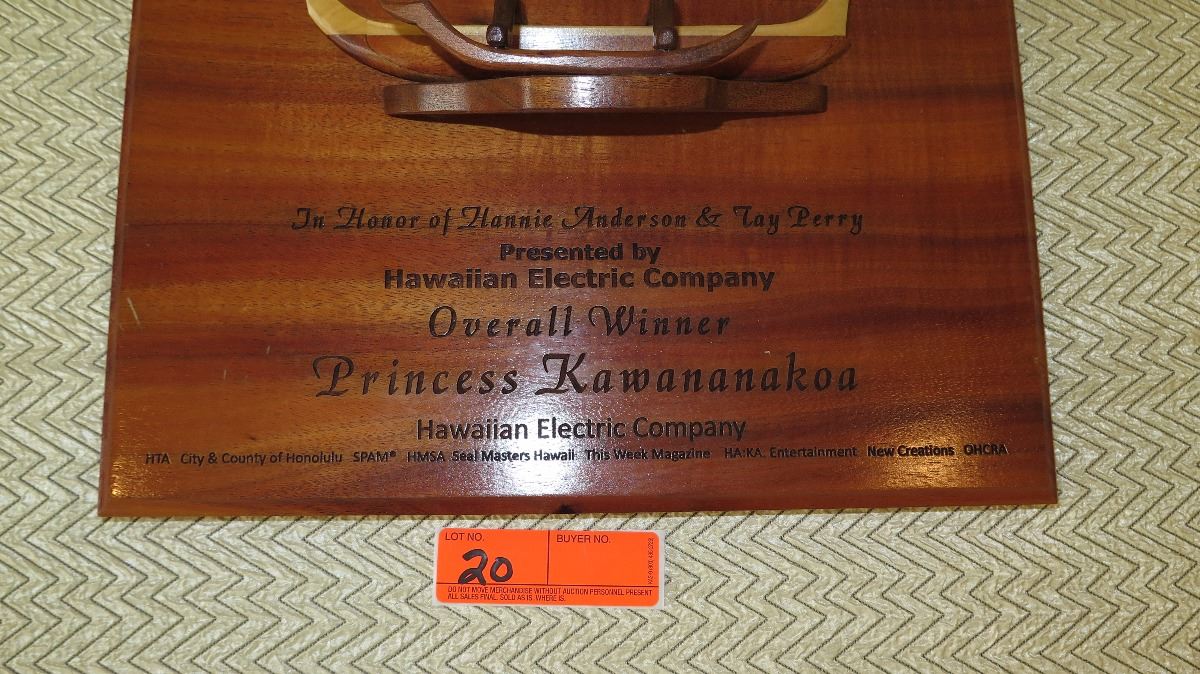 Koa Wood Award Plaque w/Canoe Relief - "Princess Kawananakoa"
