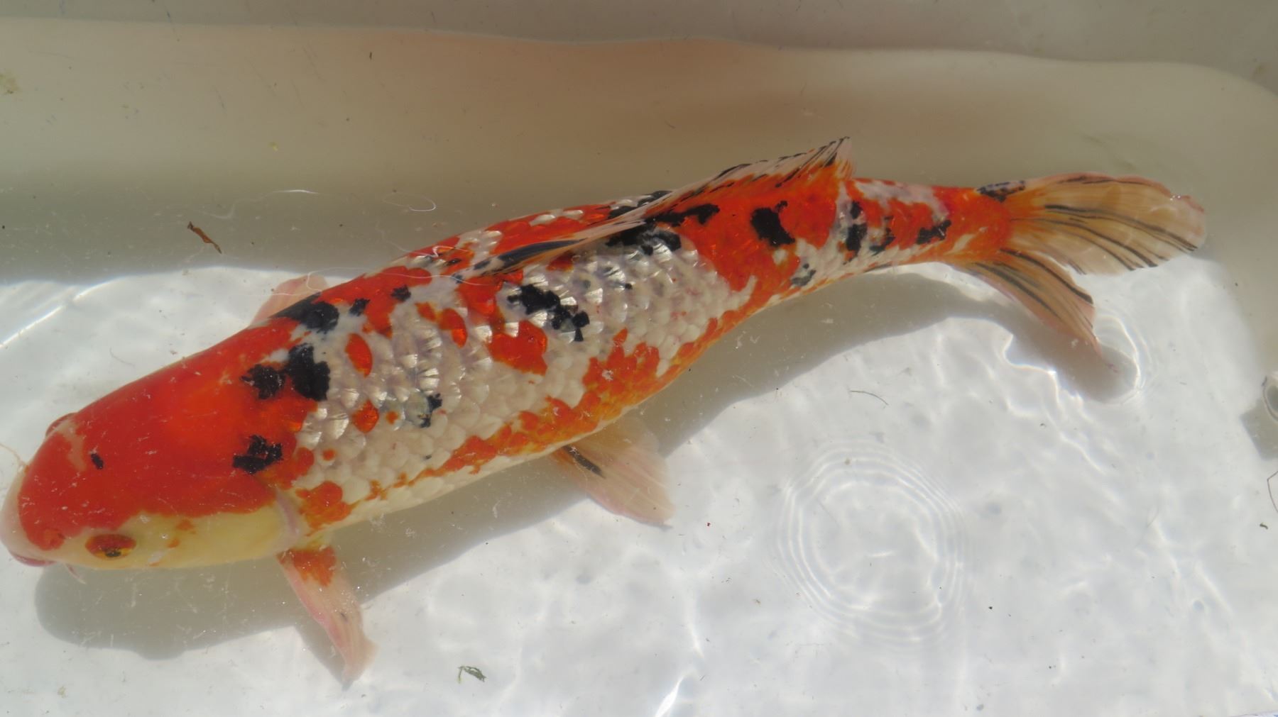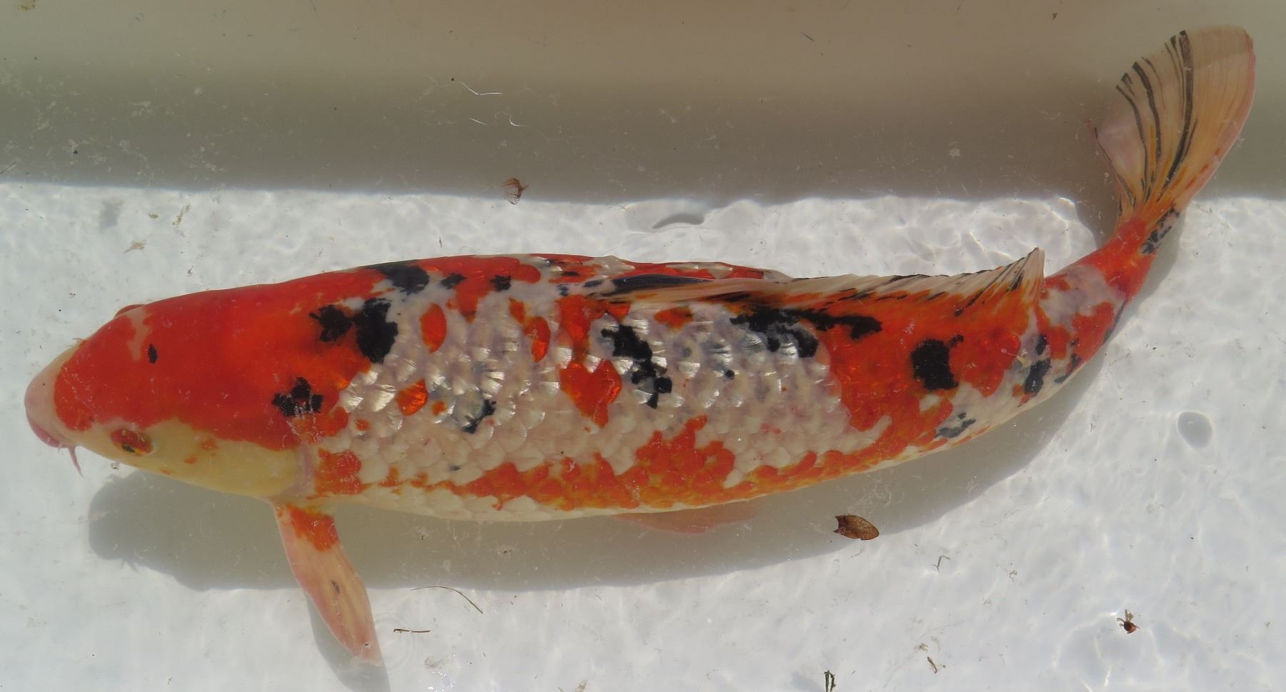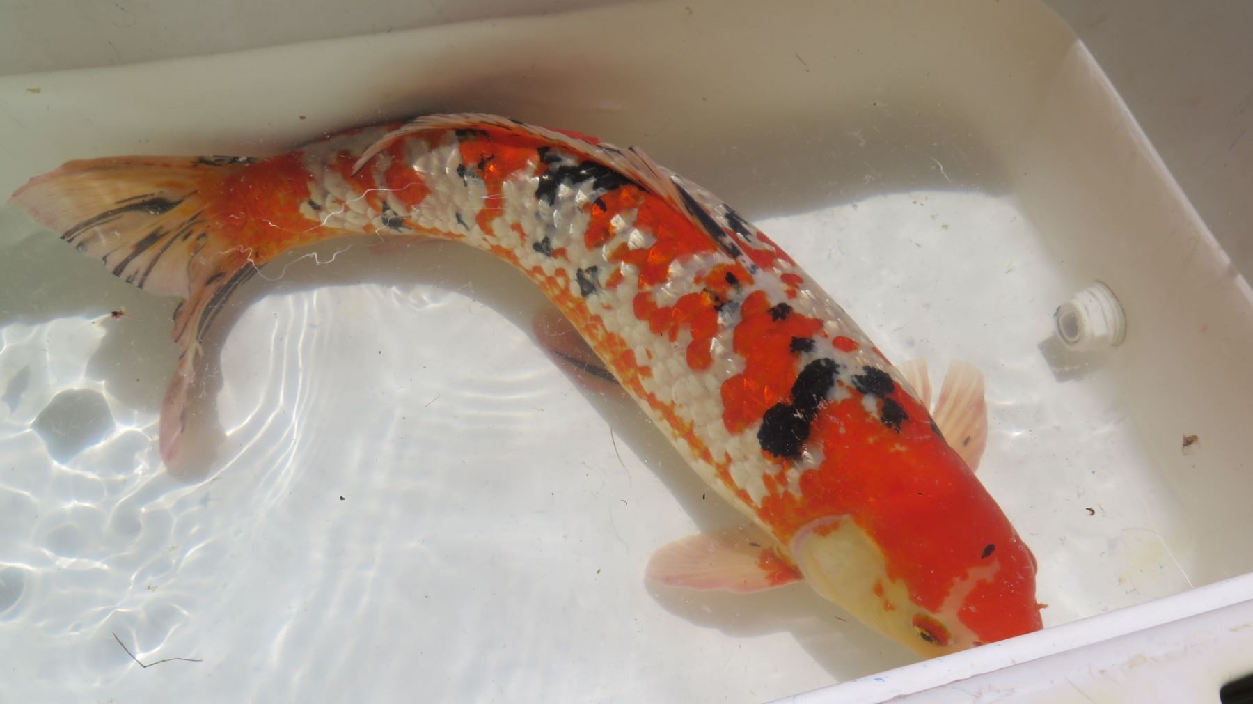 Koi Fish (Orange w/ White Markings & Black Spots). Buyer must bring own transport container and should have a viable plan for transport with the least possible impact on the koi.
