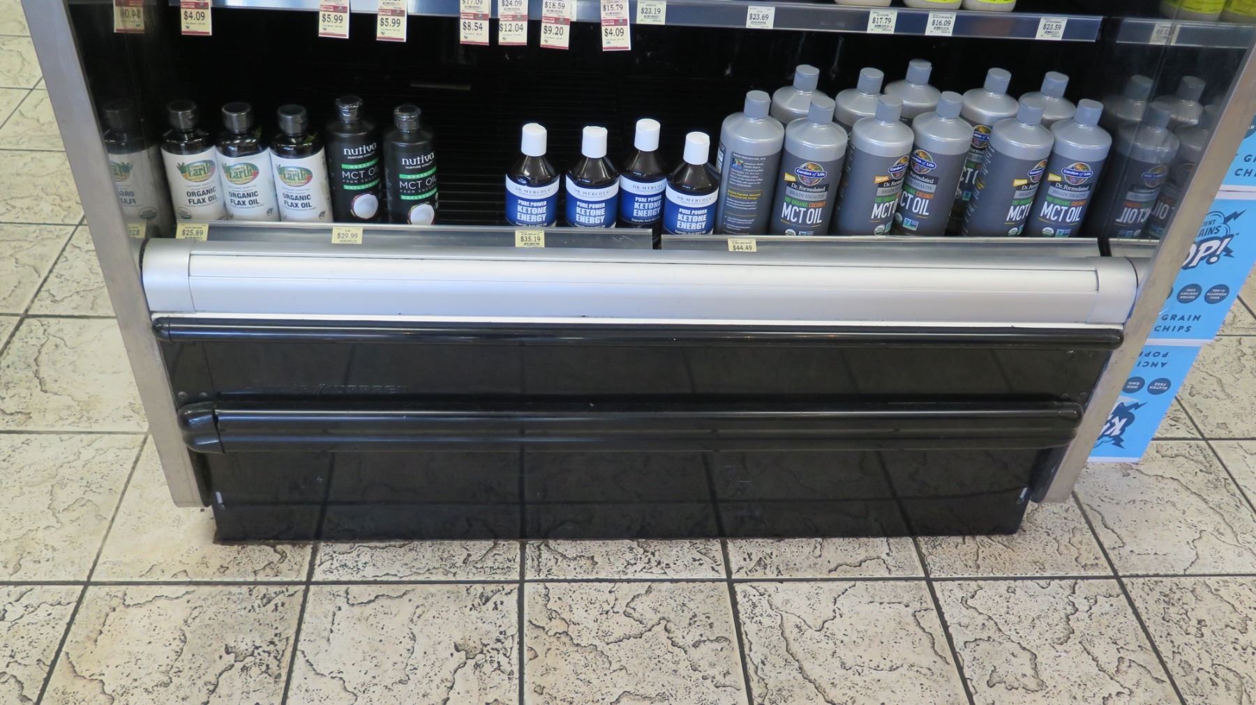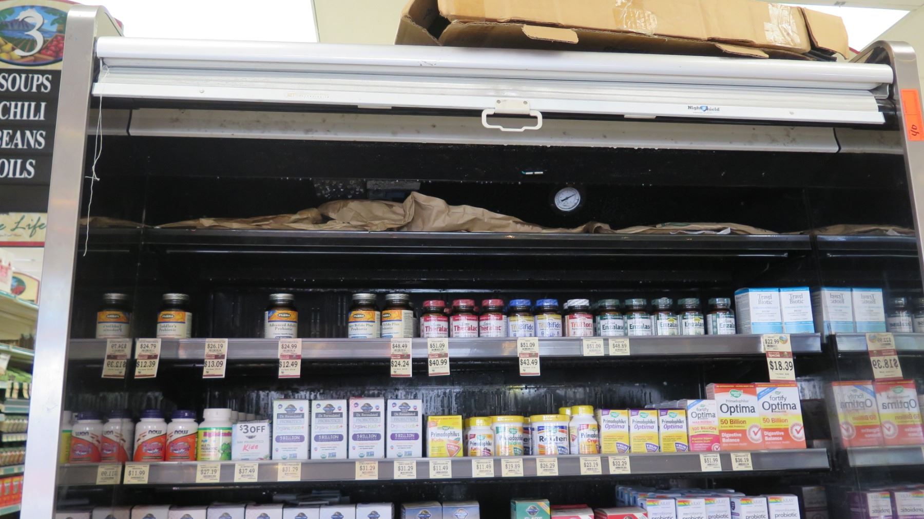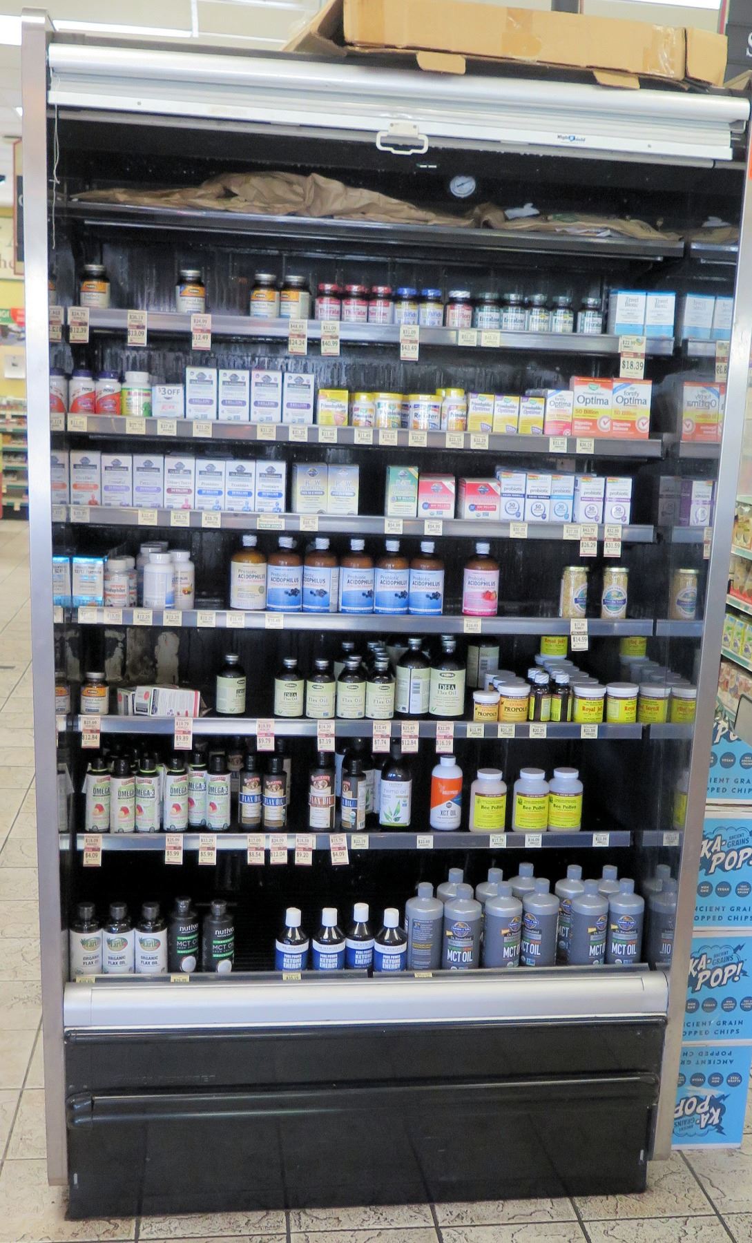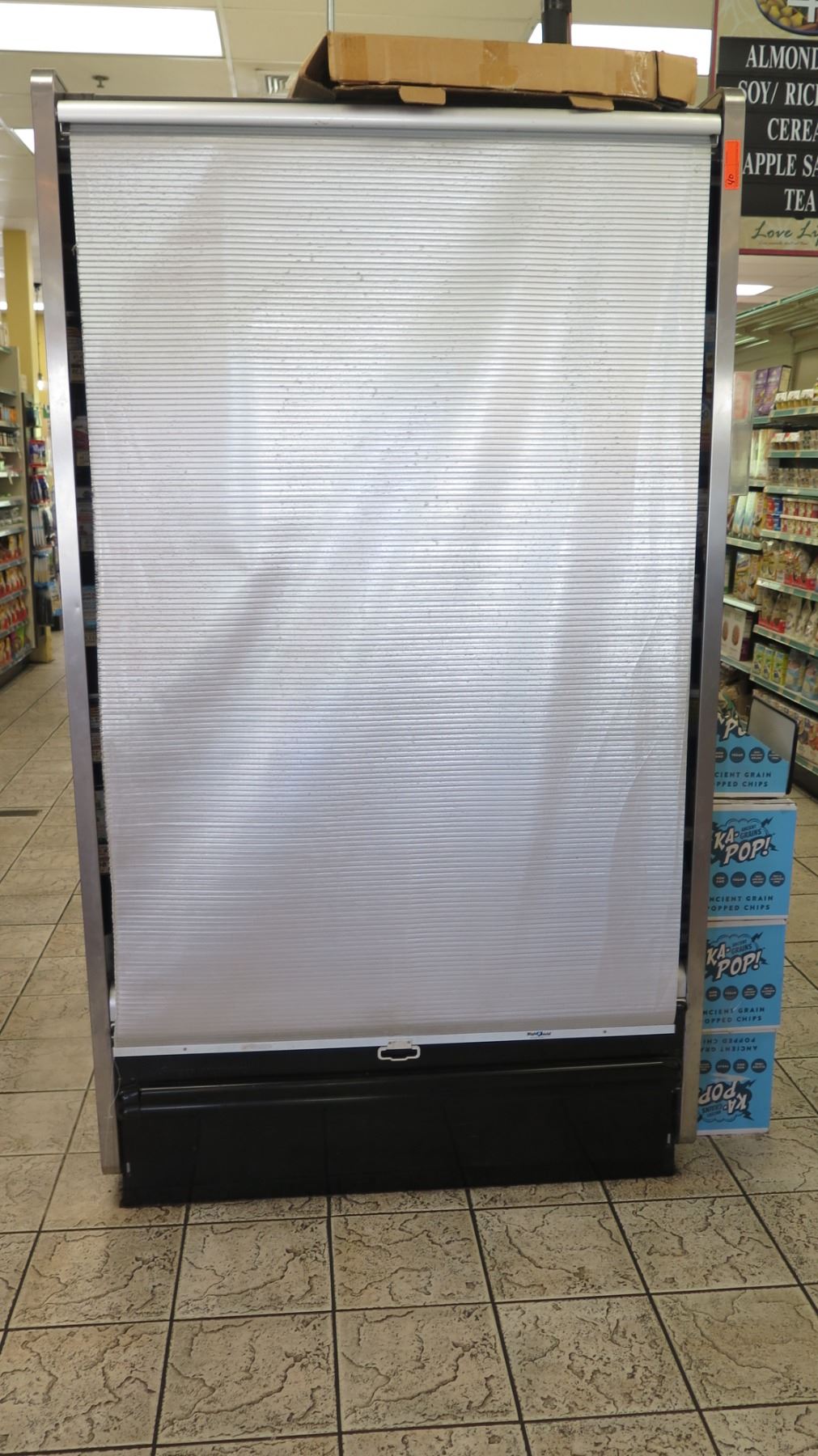 Kysor Warren Open Air Display w/ Roll-up Door Model DNBLN-04RUN. FOOD PRODUCTS AND MERCHANDISE IN THE PICTURES ARE NOT INCLUDED. This unit has a remote compressor that's not included in the auction, which means you will need an external compressor for this unit to get cold.